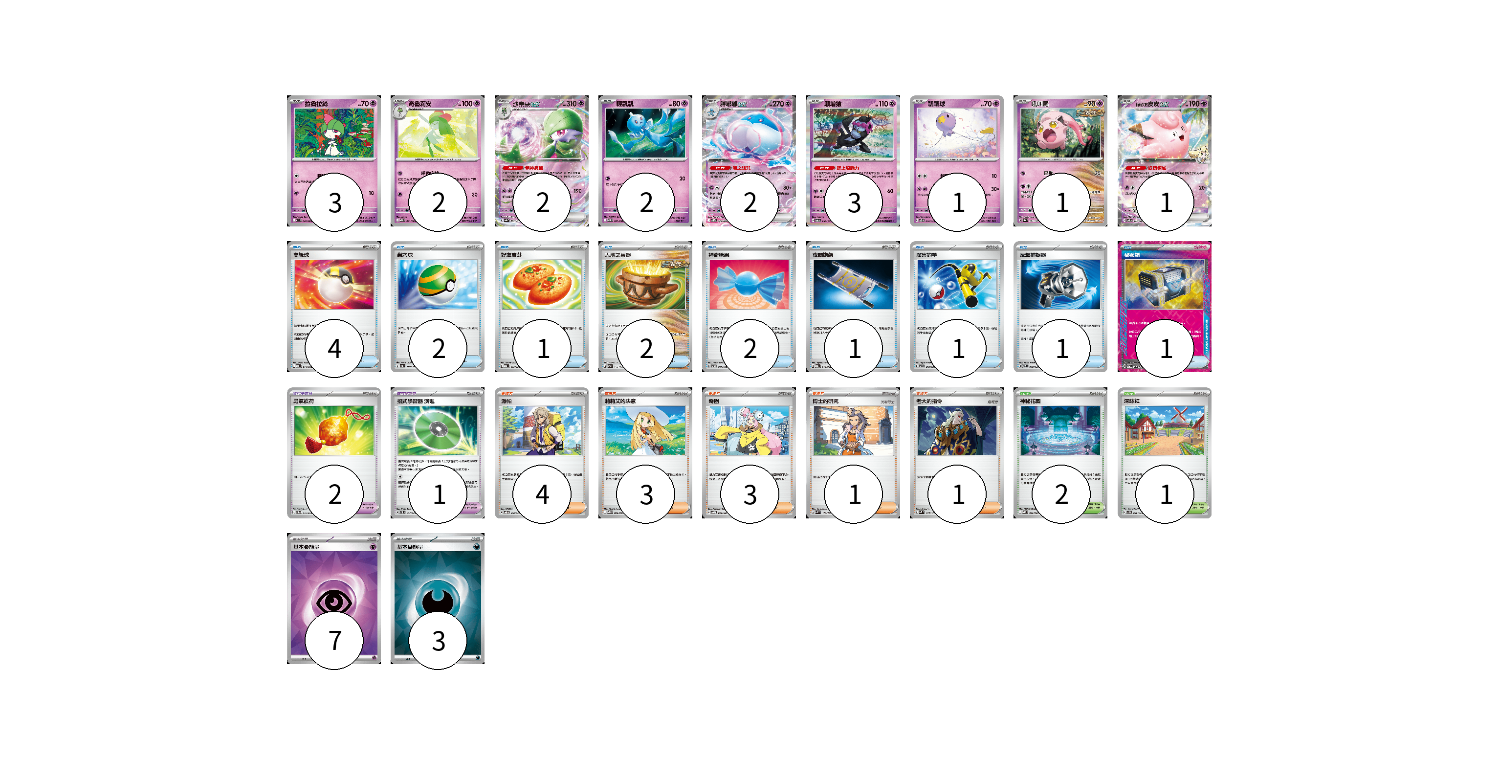 牌組構築方案 以此牌組為基礎新構築牌組 顯示卡面 顯示列表 寶可夢卡(17) 3 2 2 2 2 3 1 1 1 寶可夢道具(3) 2 1 物品卡(15) 4 2 1 2 2 1 1 1 1 支援者卡(12) 4 3 3 1 1 競技場卡(3) 2 1 能量卡(10) 7 3 寶可夢卡(17) 卡牌名稱 張數 卡牌名稱 張數 拉魯拉絲 M1S 040/063 03 奇魯莉安 M1S 041/063 02 沙奈朵ex SV4a 082/190 02 輕飄飄 SV11W 041/086 02 胖嘟嘟ex SV11W 042/086 02 願增猿 SV6 055/101 03 飄飄球 SVTS 005/022 01 吼叫尾 SV8a 071/187 01 莉莉艾的皮皮ex SV9 033/100 01 寶可夢道具(3) 卡牌名稱 張數 卡牌名稱 張數 勇氣護符 SVEM 016/020 02 招式學習器 演進 SVTL 017/021 01 物品卡(15) 卡牌名稱 張數 卡牌名稱 張數 高級球 MBD 014/022 04 巢穴球 SV4a 159/190 02 好友寶芬 MBD 013/022 01 大地之容器 SVK 012/042 02 神奇糖果 SVTG 014/019 02 夜間擔架 MBD 016/022 01 厲害釣竿 SVTR 012/021 01 反擊捕捉器 SVTS 009/022 01 秘密箱 SV6 092/101 01 支援者卡(12) 卡牌名稱 張數 卡牌名稱 張數 派帕 SVOD 018/020 04 莉莉艾的決意 M1L 062/063 03 奇樹 SVOM 018/021 03 博士的研究 SVM 170/175 01 老大的指令 SVM 172/175 01 競技場卡(3) 卡牌名稱 張數 卡牌名稱 張數 神秘花園 MBD 022/022 02 深缽鎮 SVF 036/038 01 能量卡(10) 卡牌名稱 張數 卡牌名稱 張數 基本【超】能量 SVOD PSY 07 基本【惡】能量 SVOM DAR 03 以此牌組為基礎新構築牌組 牌組編碼 RpmfLj-PkHOdC-xOzccs copy 列印牌組單 牌組編碼已複製 分享至SNS