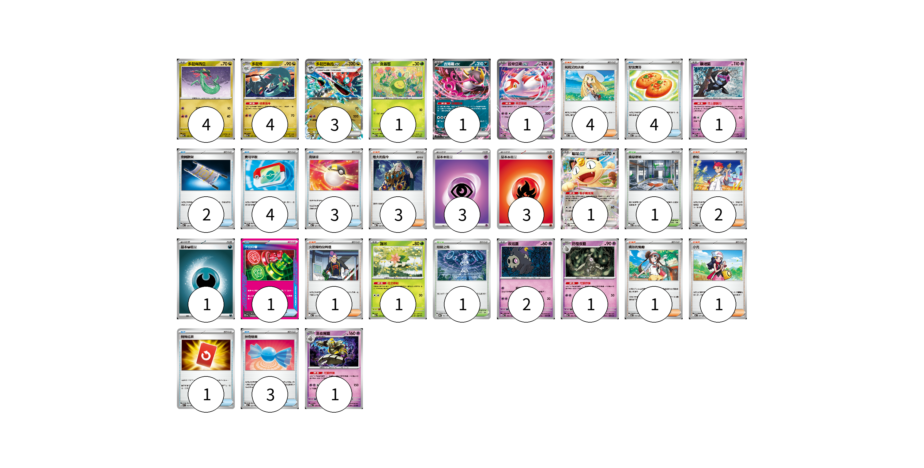 牌組構築方案 以此牌組為基礎新構築牌組 顯示卡面 顯示列表 寶可夢卡(21) 4 4 3 1 1 1 1 1 1 2 1 1 物品卡(18) 4 2 4 3 1 1 3 支援者卡(12) 4 3 2 1 1 1 競技場卡(2) 1 1 能量卡(7) 3 3 1 寶可夢卡(21) 卡牌名稱 張數 卡牌名稱 張數 多龍梅西亞 MC 546/742 04 多龍奇 MC 547/742 04 多龍巴魯托ex MC 548/742 03 含羞苞 M2a 011/193 01 吉雉雞ex MC 489/742 01 拉帝亞斯ex MC 312/742 01 願增猿 MC 358/742 01 喵喵ex M3 061/080 01 謝米 M2a 012/193 01 夜巡靈 MC 308/742 02 彷徨夜靈 MC 309/742 01 黑夜魔靈 MC 310/742 01 物品卡(18) 卡牌名稱 張數 卡牌名稱 張數 好友寶芬 MC 648/742 04 夜間擔架 MC 670/742 02 寶可平板 MC 662/742 04 高級球 MC 651/742 03 不公印章 MC 633/742 01 特殊紅牌 M4 072/083 01 神奇糖果 MC 655/742 03 支援者卡(12) 卡牌名稱 張數 卡牌名稱 張數 莉莉艾的決意 MC 729/742 04 老大的指令 MBD 020/022 03 赤松 MC 696/742 02 火箭隊的拉姆達 MC 734/742 01 鳴依的勉勵 M3 075/080 01 小光 M2 077/080 01 競技場卡(2) 卡牌名稱 張數 卡牌名稱 張數 險惡廢墟 M1L 063/063 01 阻礙之塔 SV8a 181/187 01 能量卡(7) 卡牌名稱 張數 卡牌名稱 張數 基本超能量 sv-p PSY 03 基本火能量 sv-p FIR 03 基本【惡】能量 MC DAR 01 以此牌組為基礎新構築牌組 牌組編碼 RqCGwW-KwEmLO-BxEyPx copy 列印牌組單 牌組編碼已複製 分享至SNS