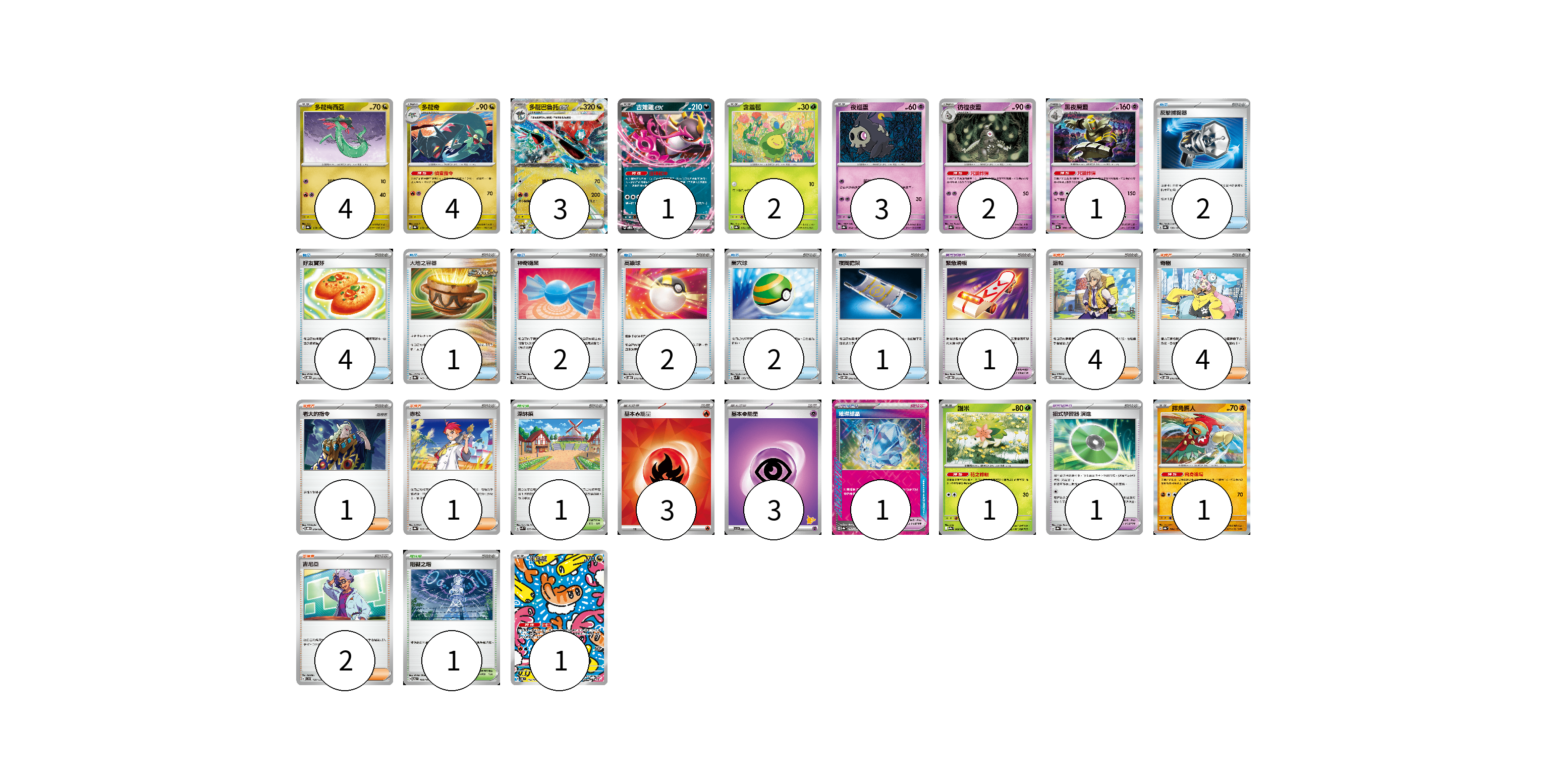 牌組構築方案 以此牌組為基礎新構築牌組 顯示卡面 顯示列表 寶可夢卡(23) 4 4 3 1 2 3 2 1 1 1 1 寶可夢道具(3) 1 1 1 物品卡(14) 2 4 1 2 2 2 1 支援者卡(12) 4 4 1 1 2 競技場卡(2) 1 1 能量卡(6) 3 3 寶可夢卡(23) 卡牌名稱 張數 卡牌名稱 張數 多龍梅西亞 SV8a 118/187 04 多龍奇 SV8a 119/187 04 多龍巴魯托ex SV8a 120/187 03 吉雉雞ex SVOD 004/020 01 含羞苞 SV8a 001/187 02 夜巡靈 SV8a 064/187 03 彷徨夜靈 SV8a 065/187 02 黑夜魔靈 SV8a 066/187 01 謝米 SV9a 006/063 01 摔角鷹人 SV8a 084/187 01 米立龍 SV6 112/101 01 寶可夢道具(3) 卡牌名稱 張數 卡牌名稱 張數 緊急滑板 SVOD 015/020 01 璀璨結晶 SV8a 152/187 01 招式學習器 演進 SV8a 160/187 01 物品卡(14) 卡牌名稱 張數 卡牌名稱 張數 反擊捕捉器 SV8a 139/187 02 好友寶芬 SVOD 011/020 04 大地之容器 SV8a 143/187 01 神奇糖果 SVOD 013/020 02 高級球 SVOD 012/020 02 巢穴球 SVM 133/175 02 夜間擔架 SVOM 016/021 01 支援者卡(12) 卡牌名稱 張數 卡牌名稱 張數 派帕 SVOD 018/020 04 奇樹 SVOD 016/020 04 老大的指令 SVOD 019/020 01 赤松 SV8a 163/187 01 吉尼亞 SVD 129/139 02 競技場卡(2) 卡牌名稱 張數 卡牌名稱 張數 深缽鎮 SVK 039/042 01 阻礙之塔 SV6 100/101 01 能量卡(6) 卡牌名稱 張數 卡牌名稱 張數 基本【火】能量 SVK FIR 03 基本【超】能量 SVI PSY 03 以此牌組為基礎新構築牌組 牌組編碼 RqhlGA-hGmRny-FyTvtY copy 列印牌組單 牌組編碼已複製 分享至SNS