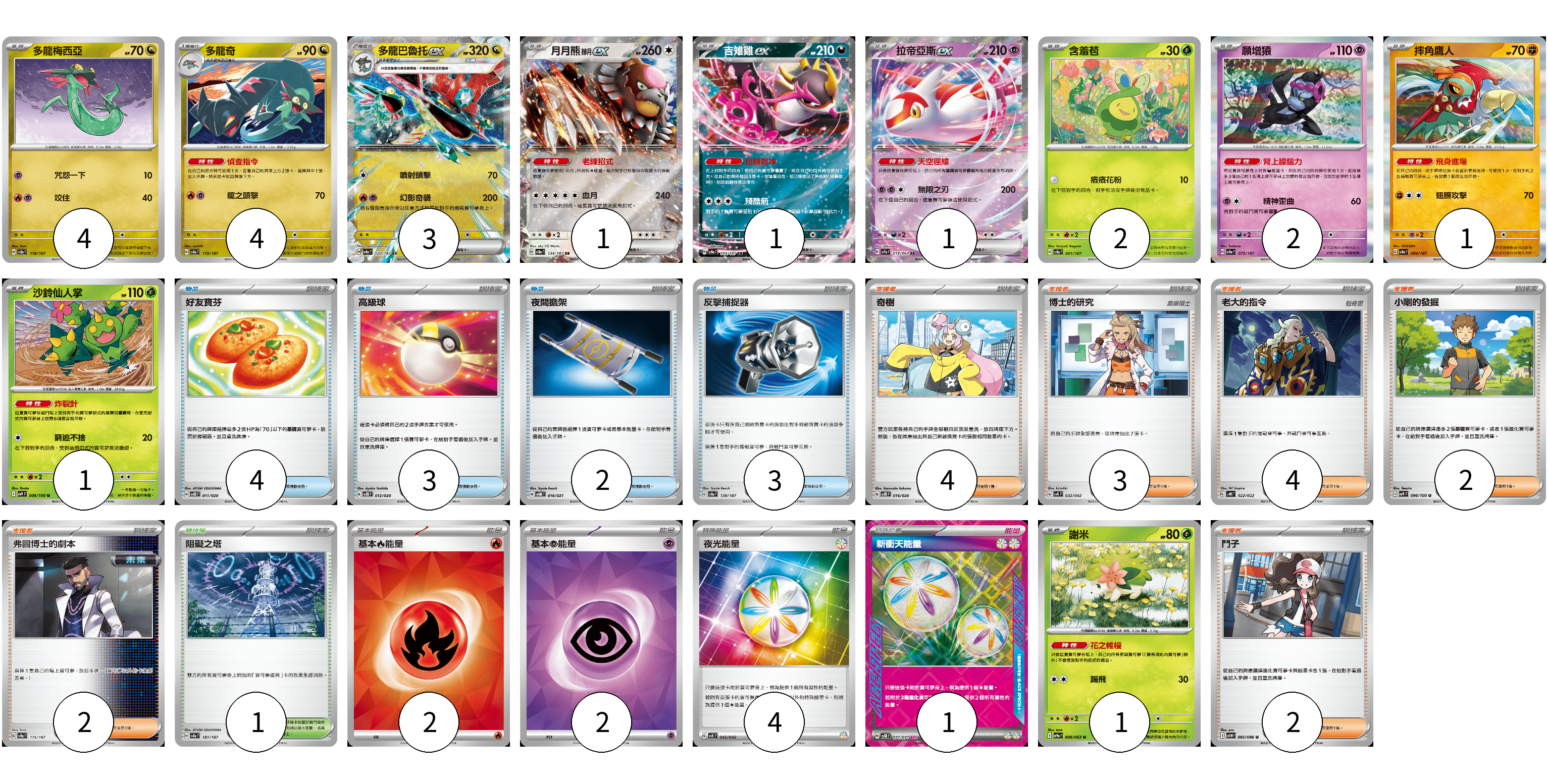 牌組構築方案 以此牌組為基礎新構築牌組 顯示卡面 顯示列表 寶可夢卡(21) 4 4 3 1 1 1 2 2 1 1 1 物品卡(12) 4 3 2 3 支援者卡(17) 4 3 4 2 2 2 競技場卡(1) 1 能量卡(9) 2 2 4 1 寶可夢卡(21) 卡牌名稱 張數 卡牌名稱 張數 多龍梅西亞 SV8a 118/187 04 多龍奇 SV8a 119/187 04 多龍巴魯托ex SV8a 120/187 03 月月熊 赫月ex SV8a 134/187 01 吉雉雞ex SV8a 104/187 01 拉帝亞斯ex SV7a 019/064 01 含羞苞 SV8a 001/187 02 願增猿 SV8a 075/187 02 摔角鷹人 SV8a 084/187 01 沙鈴仙人掌 SV9 006/100 01 謝米 SV9a 006/063 01 物品卡(12) 卡牌名稱 張數 卡牌名稱 張數 好友寶芬 SVOD 011/020 04 高級球 SVOD 012/020 03 夜間擔架 SVOM 016/021 02 反擊捕捉器 SV8a 139/187 03 支援者卡(17) 卡牌名稱 張數 卡牌名稱 張數 奇樹 SVOD 016/020 04 博士的研究 SVK 032/042 03 老大的指令 SVHK 022/022 04 小剛的發掘 SV9 096/100 02 弗圖博士的劇本 SV8a 175/187 02 鬥子 SV11W 085/086 02 競技場卡(1) 卡牌名稱 張數 卡牌名稱 張數 阻礙之塔 SV8a 181/187 01 能量卡(9) 卡牌名稱 張數 卡牌名稱 張數 基本【火】能量 SVM FIR 02 基本【超】能量 SVM PSY 02 夜光能量 SVK 042/042 04 新衝天能量 SV5K 071/071 01 以此牌組為基礎新構築牌組 牌組編碼 RqrTyt-yZVEeS-eijIvI copy 列印牌組單 牌組編碼已複製 分享至SNS