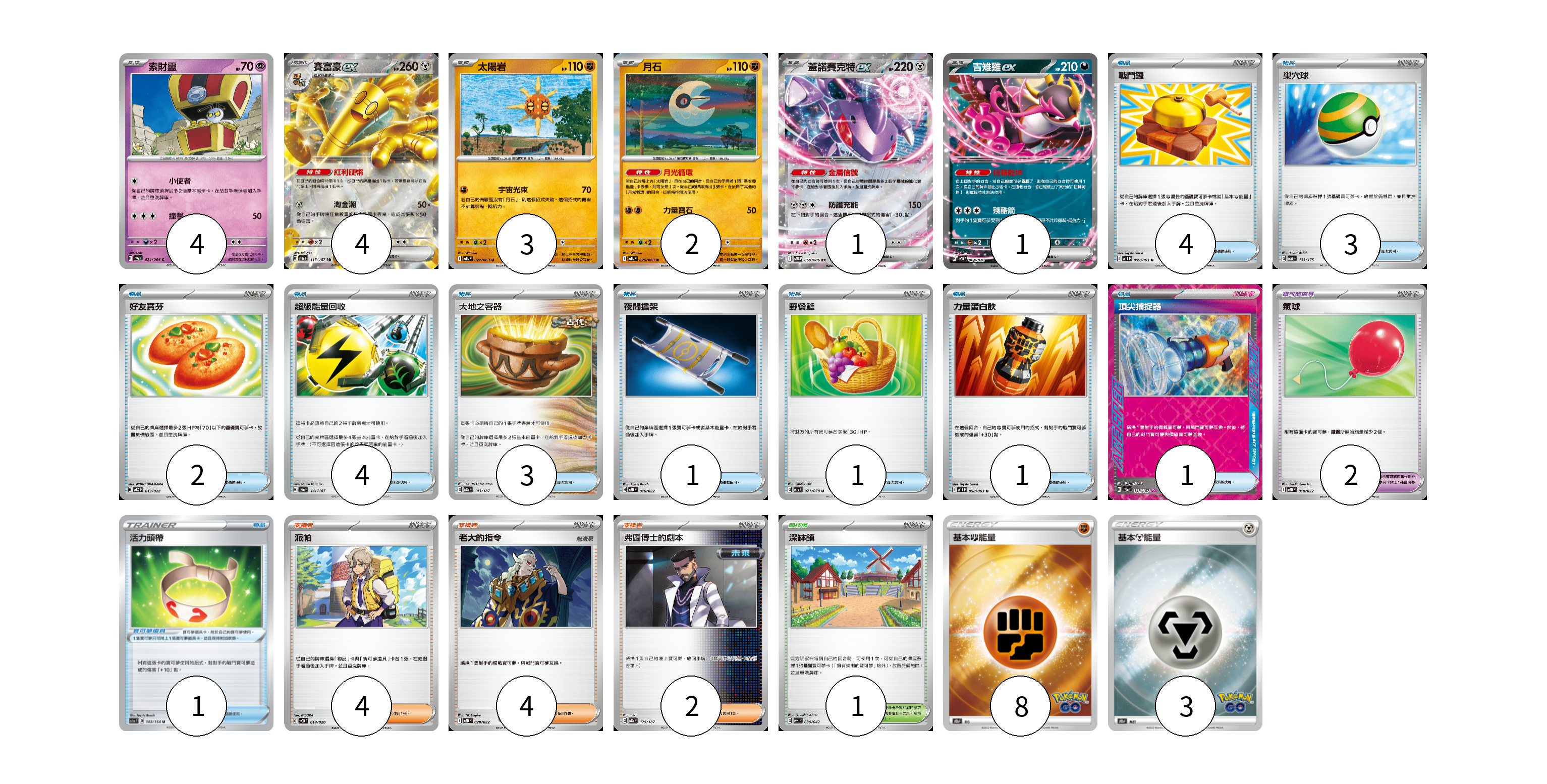 牌組構築方案 以此牌組為基礎新構築牌組 顯示卡面 顯示列表 寶可夢卡(15) 4 4 3 2 1 1 寶可夢道具(3) 2 1 物品卡(20) 4 3 2 4 3 1 1 1 1 支援者卡(10) 4 4 2 競技場卡(1) 1 能量卡(11) 8 3 寶可夢卡(15) 卡牌名稱 張數 卡牌名稱 張數 索財靈 SV7a 024/064 04 賽富豪ex SV8a 117/187 04 太陽岩 M1L 027/063 03 月石 M1L 026/063 02 蓋諾賽克特ex SV11B 069/086 01 吉雉雞ex SVOD 004/020 01 寶可夢道具(3) 卡牌名稱 張數 卡牌名稱 張數 氣球 MBD 018/022 02 活力頭帶 SC1a 143/154 01 物品卡(20) 卡牌名稱 張數 卡牌名稱 張數 戰鬥鑼 M1L 059/063 04 巢穴球 SVM 133/175 03 好友寶芬 MBD 013/022 02 超級能量回收 SV8a 141/187 04 大地之容器 SV8a 143/187 03 夜間擔架 MBD 016/022 01 野餐籃 SV1V 071/078 01 力量蛋白飲 M1L 058/063 01 頂尖捕捉器 SV8a 148/187 01 支援者卡(10) 卡牌名稱 張數 卡牌名稱 張數 派帕 SVOD 018/020 04 老大的指令 MBD 020/022 04 弗圖博士的劇本 SV8a 175/187 02 競技場卡(1) 卡牌名稱 張數 卡牌名稱 張數 深缽鎮 SVK 039/042 01 能量卡(11) 卡牌名稱 張數 卡牌名稱 張數 基本鬥能量 S10b FIG 08 基本鋼能量 S10b MET 03 以此牌組為基礎新構築牌組 牌組編碼 RrjxxS-OYUMht-eJHyuf copy 列印牌組單 牌組編碼已複製 分享至SNS