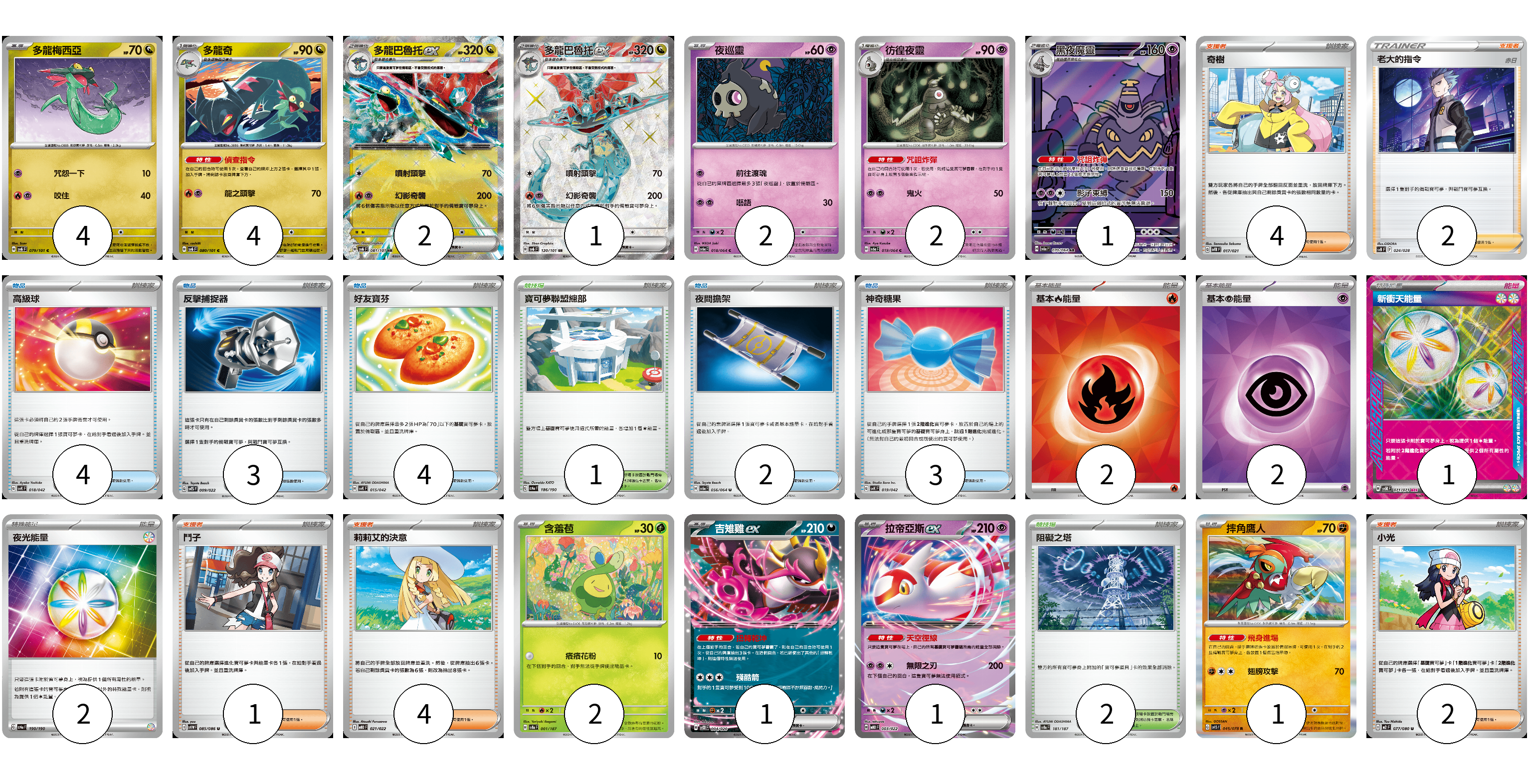 牌組構築方案 以此牌組為基礎新構築牌組 顯示卡面 顯示列表 寶可夢卡(21) 4 4 2 1 2 2 1 2 1 1 1 物品卡(16) 4 3 4 2 3 支援者卡(13) 4 2 1 4 2 競技場卡(3) 1 2 能量卡(7) 2 2 1 2 寶可夢卡(21) 卡牌名稱 張數 卡牌名稱 張數 多龍梅西亞 SV6 079/101 04 多龍奇 SV6 080/101 04 多龍巴魯托ex SV6 081/101 02 多龍巴魯托ex SV6 120/101 01 夜巡靈 SV6a 018/064 02 彷徨夜靈 SV6a 019/064 02 黑夜魔靈 SV6a 070/064 01 含羞苞 SV8a 001/187 02 吉雉雞ex SVOD 004/020 01 拉帝亞斯ex MBD 003/022 01 摔角鷹人 SV1S 045/078 01 物品卡(16) 卡牌名稱 張數 卡牌名稱 張數 高級球 SVK 018/042 04 反擊捕捉器 SVTS 009/022 03 好友寶芬 SVK 015/042 04 夜間擔架 SV6a 056/064 02 神奇糖果 SVK 019/042 03 支援者卡(13) 卡牌名稱 張數 卡牌名稱 張數 奇樹 SVTR 017/021 04 老大的指令(赤日) SVB 024/028 02 鬥子 SV11W 085/086 01 莉莉艾的決意 MBD 021/022 04 小光 M2 077/080 02 競技場卡(3) 卡牌名稱 張數 卡牌名稱 張數 寶可夢聯盟總部 SV4a 186/190 01 阻礙之塔 SV8a 181/187 02 能量卡(7) 卡牌名稱 張數 卡牌名稱 張數 基本【火】能量 SVK FIR 02 基本【超】能量 SVK PSY 02 新衝天能量 SV5K 071/071 01 夜光能量 SV4a 190/190 02 以此牌組為基礎新構築牌組 牌組編碼 RsEFDr-sEBlxk-TpIwOh copy 列印牌組單 牌組編碼已複製 分享至SNS