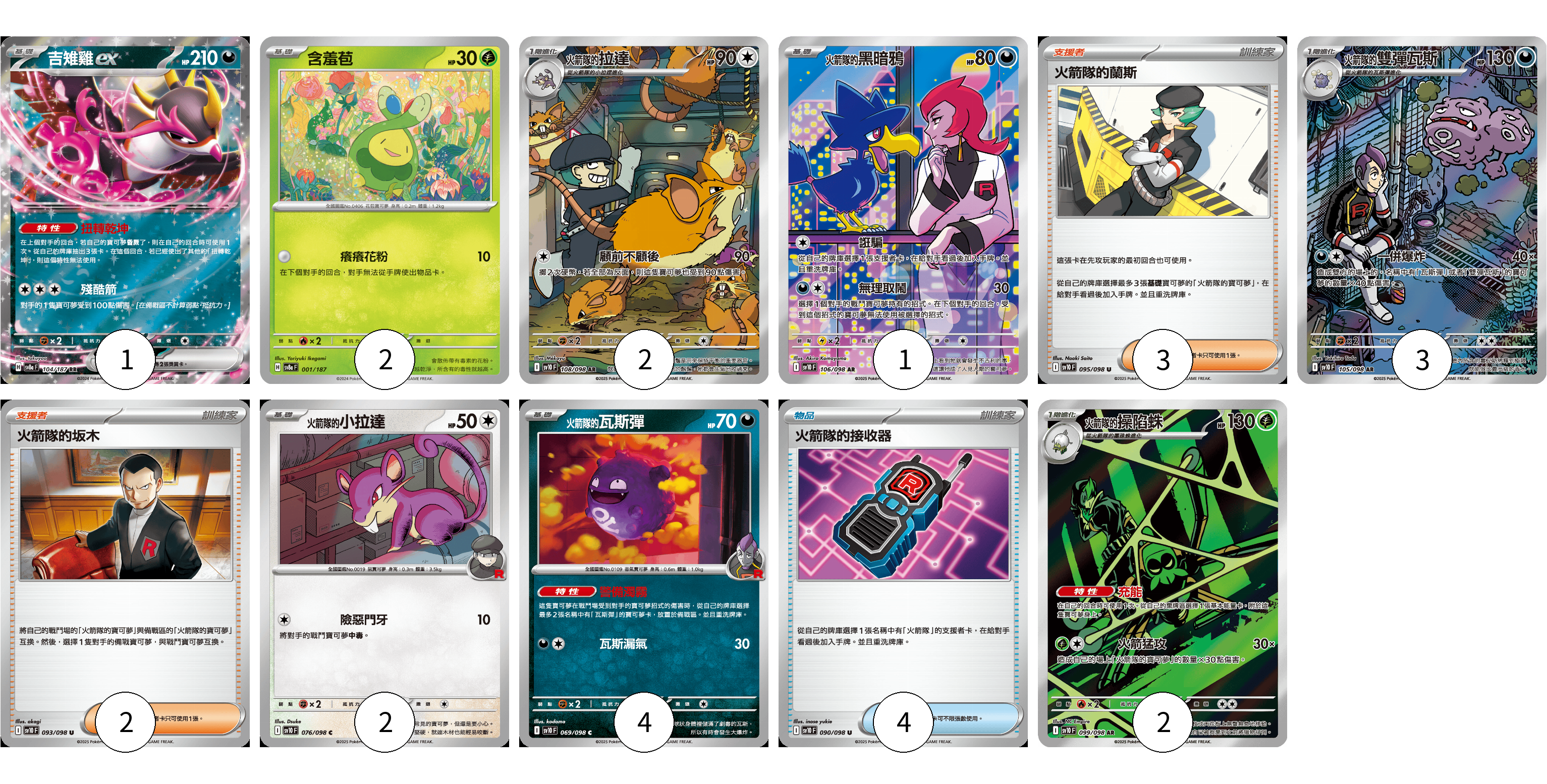 牌組構築方案 以此牌組為基礎新構築牌組 顯示卡面 顯示列表 寶可夢卡(17) 1 2 2 1 3 2 4 2 物品卡(4) 4 支援者卡(5) 3 2 寶可夢卡(17) 卡牌名稱 張數 卡牌名稱 張數 吉雉雞ex SV8a 104/187 01 含羞苞 SV8a 001/187 02 <火箭隊的>拉達 SV10 108/098 02 <火箭隊的>黑暗鴉 SV10 106/098 01 <火箭隊的>雙彈瓦斯 SV10 105/098 03 <火箭隊的>小拉達 SV10 076/098 02 <火箭隊的>瓦斯彈 SV10 069/098 04 <火箭隊的>操陷蛛 SV10 099/098 02 物品卡(4) 卡牌名稱 張數 卡牌名稱 張數 火箭隊的接收器 SV10 090/098 04 支援者卡(5) 卡牌名稱 張數 卡牌名稱 張數 火箭隊的蘭斯 SV10 095/098 03 火箭隊的坂木 SV10 093/098 02 以此牌組為基礎新構築牌組 牌組編碼 RsXxLR-nKZKem-OabSWp copy 列印牌組單 牌組編碼已複製 分享至SNS