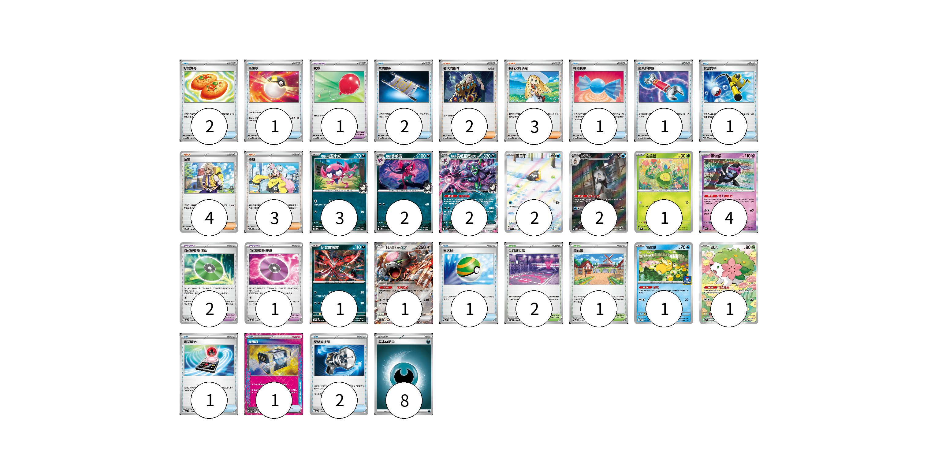 牌組構築方案 以此牌組為基礎新構築牌組 顯示卡面 顯示列表 寶可夢卡(20) 3 2 2 2 2 1 4 1 1 1 1 寶可夢道具(4) 1 2 1 物品卡(13) 2 1 2 1 1 1 1 1 1 2 支援者卡(12) 2 3 4 3 競技場卡(3) 2 1 能量卡(8) 8 寶可夢卡(20) 卡牌名稱 張數 卡牌名稱 張數 <瑪俐的>搗蛋小妖 SVOM 005/021 03 <瑪俐的>詐唬魔 SVOM 006/021 02 <瑪俐的>長毛巨魔ex SVOM 007/021 02 雪童子 SV3a 063/062 02 雪妖女 SV6 104/101 02 含羞苞 SV8a 001/187 01 願增猿 SV8a 075/187 04 伊裴爾塔爾 M1L 040/063 01 月月熊 赫月 ex SV5a 052/066 01 可達鴨 SV-P 220/SV-P 01 謝米 SV9a 066/063 01 寶可夢道具(4) 卡牌名稱 張數 卡牌名稱 張數 氣球 MBD 018/022 01 招式學習器 演進 SV8a 160/187 02 招式學習器 衰退 SV8a 161/187 01 物品卡(13) 卡牌名稱 張數 卡牌名稱 張數 好友寶芬 MBD 013/022 02 高級球 MBD 014/022 01 夜間擔架 MBD 016/022 02 神奇糖果 MBG 013/022 01 道具拆除器 SV11W 080/086 01 厲害釣竿 SVOD 010/020 01 巢穴球 SVM 133/175 01 能量輸送 SVM 128/175 01 秘密箱 SV6 092/101 01 反擊捕捉器 SV8a 139/187 02 支援者卡(12) 卡牌名稱 張數 卡牌名稱 張數 老大的指令 MBD 020/022 02 莉莉艾的決意 MBD 021/022 03 派帕 SVOD 018/020 04 奇樹 SVOD 016/020 03 競技場卡(3) 卡牌名稱 張數 卡牌名稱 張數 尖釘鎮道館 SVOM 021/021 02 深缽鎮 SVK 039/042 01 能量卡(8) 卡牌名稱 張數 卡牌名稱 張數 基本【惡】能量 MBG DAR 08 以此牌組為基礎新構築牌組 牌組編碼 RvOqHD-izCiKl-trQJZT copy 列印牌組單 牌組編碼已複製 分享至SNS
