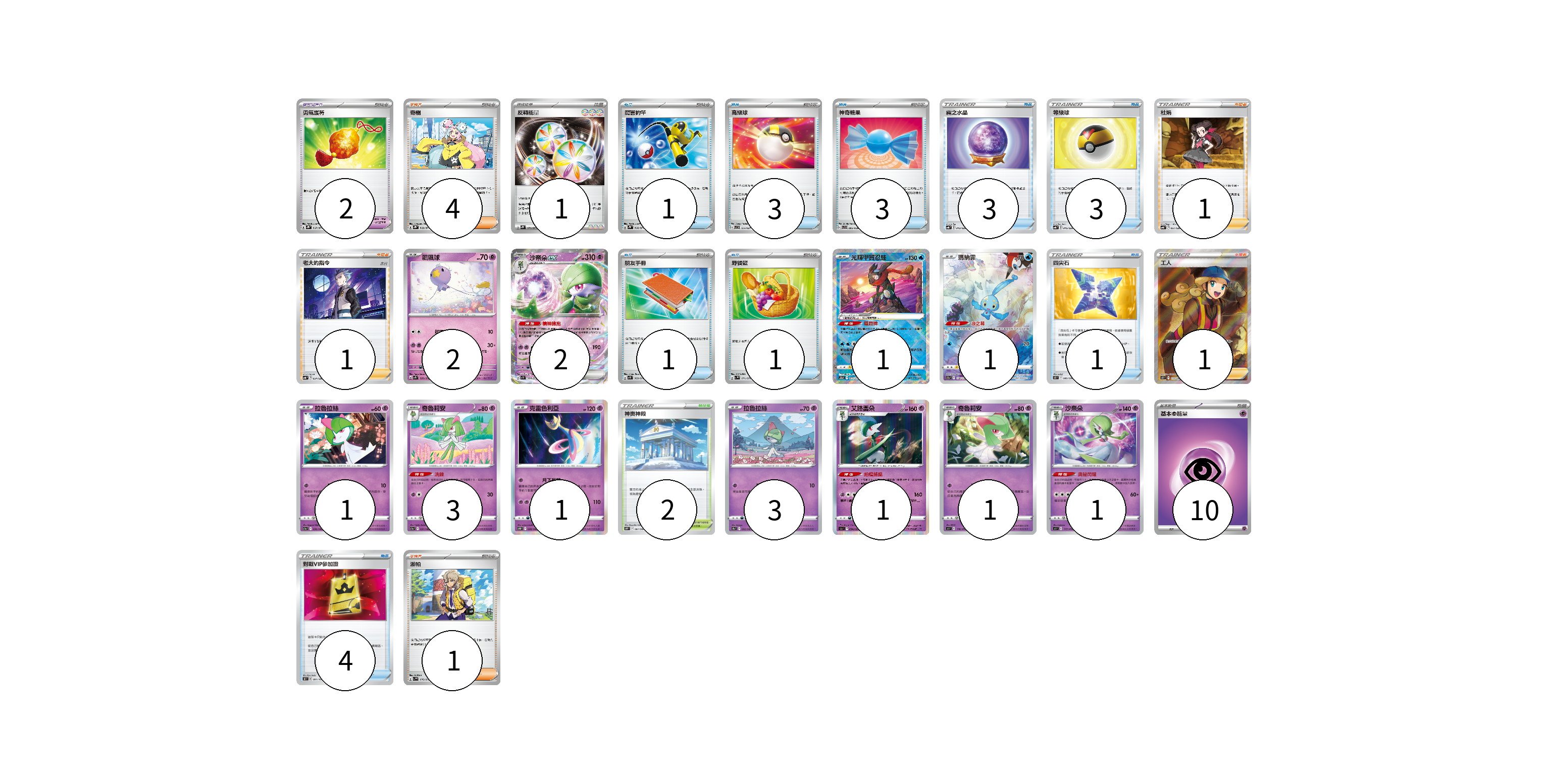 牌組構築方案 以此牌組為基礎新構築牌組 顯示卡面 顯示列表 寶可夢卡(17) 2 2 1 1 1 3 1 3 1 1 1 寶可夢道具(2) 2 物品卡(20) 1 3 3 3 3 1 1 1 4 支援者卡(8) 4 1 1 1 1 競技場卡(2) 2 能量卡(11) 1 10 寶可夢卡(17) 卡牌名稱 張數 卡牌名稱 張數 飄飄球 SV1S 029/078 02 沙奈朵ex SV1S 028/078 02 光輝甲賀忍蛙 S12a 033/172 01 瑪納霏 S12a 178/172 01 拉魯拉絲 S11a 036/068 01 奇魯莉安 S11a 037/068 03 克雷色利亞 S10D 028/067 01 拉魯拉絲 S9a 032/067 03 艾路雷朵 S9a 034/067 01 奇魯莉安 SI 176/414 01 沙奈朵 SI 177/414 01 寶可夢道具(2) 卡牌名稱 張數 卡牌名稱 張數 勇氣護符 SV2D 067/071 02 物品卡(20) 卡牌名稱 張數 卡牌名稱 張數 厲害釣竿 SV2P 066/071 01 高級球 SVC 014/021 03 神奇糖果 SVB 003/028 03 霧之水晶 SVB 013/028 03 等級球 SVB 015/028 03 朋友手冊 SV1S 069/078 01 野餐籃 SV1V 071/078 01 四尖石 S12 089/098 01 對戰VIP參加證 S8 091/100 04 支援者卡(8) 卡牌名稱 張數 卡牌名稱 張數 奇樹 SV2D 069/071 04 杜娟 SVB 021/028 01 老大的指令(赤日) SVB 024/028 01 工人 S12 111/098 01 派帕 SV1V 076/078 01 競技場卡(2) 卡牌名稱 張數 卡牌名稱 張數 神奧神殿 S10P 067/067 02 能量卡(11) 卡牌名稱 張數 卡牌名稱 張數 反轉能量 SV2P 071/071 01 基本【超】能量 SVB PSY 10 以此牌組為基礎新構築牌組 牌組編碼 RvxJsX-foNcZh-PwsQkf copy 列印牌組單 牌組編碼已複製 分享至SNS