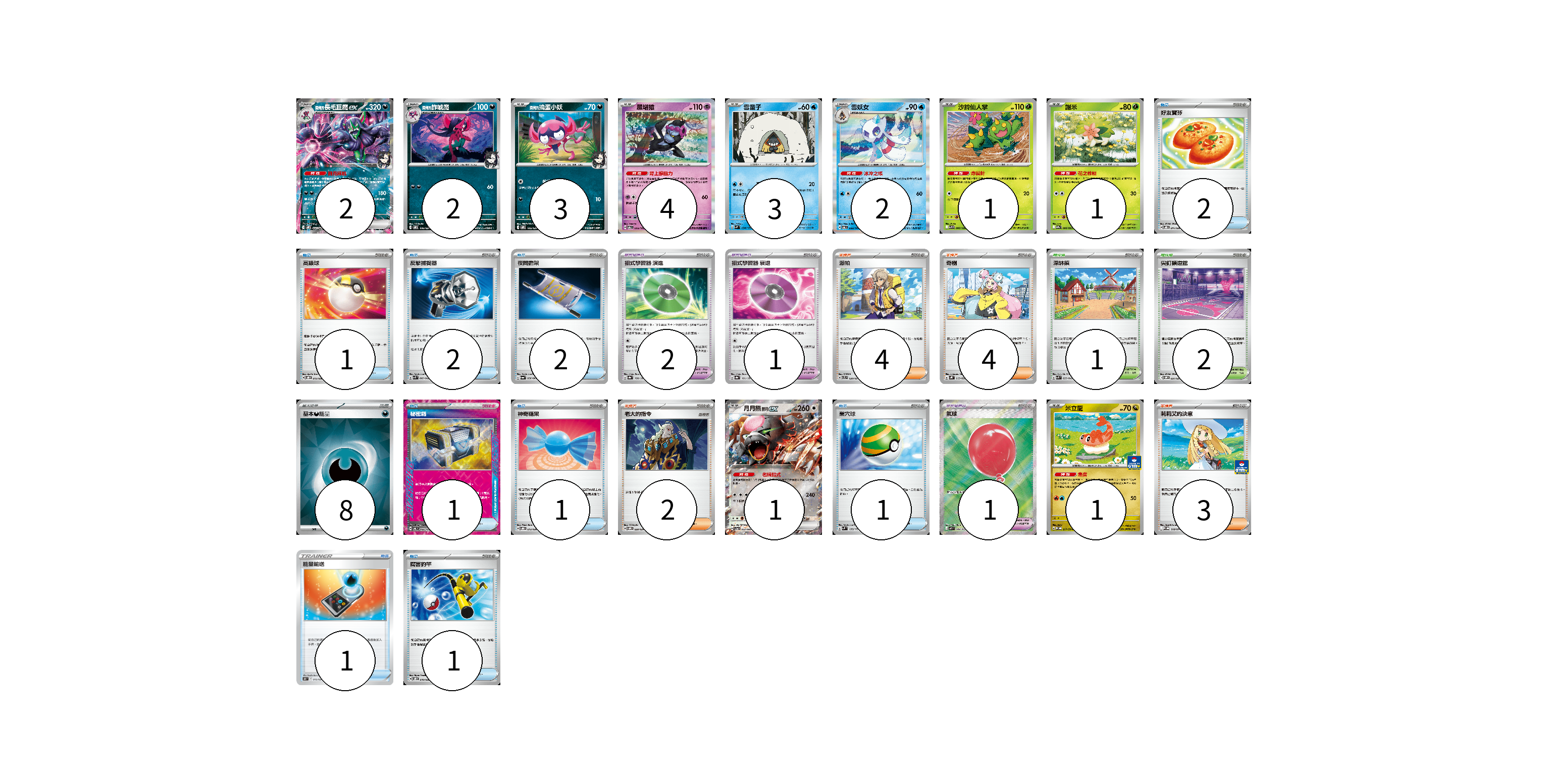 牌組構築方案 以此牌組為基礎新構築牌組 顯示卡面 顯示列表 寶可夢卡(20) 2 2 3 4 3 2 1 1 1 1 寶可夢道具(4) 2 1 1 物品卡(12) 2 1 2 2 1 1 1 1 1 支援者卡(13) 4 4 2 3 競技場卡(3) 1 2 能量卡(8) 8 寶可夢卡(20) 卡牌名稱 張數 卡牌名稱 張數 <瑪俐的>長毛巨魔ex SVOM 007/021 02 <瑪俐的>詐唬魔 SVOM 006/021 02 <瑪俐的>搗蛋小妖 SVOM 005/021 03 願增猿 SV6 055/101 04 雪童子 SVM 034/175 03 雪妖女 SV6 033/101 02 沙鈴仙人掌 SV9 006/100 01 謝米 SV9a 006/063 01 月月熊 赫月 ex SV5a 052/066 01 米立龍 SV-P 211/SV-P 01 寶可夢道具(4) 卡牌名稱 張數 卡牌名稱 張數 招式學習器 演進 SV8a 160/187 02 招式學習器 衰退 SV8a 161/187 01 氣球 M1L 084/063 01 物品卡(12) 卡牌名稱 張數 卡牌名稱 張數 好友寶芬 SVOD 011/020 02 高級球 SVOD 012/020 01 反擊捕捉器 SVK 009/042 02 夜間擔架 SV6a 056/064 02 秘密箱 SV6 092/101 01 神奇糖果 SVOD 013/020 01 巢穴球 SVM 133/175 01 能量輸送 SN 013/024 01 厲害釣竿 SVOD 010/020 01 支援者卡(13) 卡牌名稱 張數 卡牌名稱 張數 派帕 SVTL 020/021 04 奇樹 SVHK 019/022 04 老大的指令 SVOM 020/021 02 莉莉艾的決意 M-P 018/M-P 03 競技場卡(3) 卡牌名稱 張數 卡牌名稱 張數 深缽鎮 SVK 039/042 01 尖釘鎮道館 SVOM 021/021 02 能量卡(8) 卡牌名稱 張數 卡牌名稱 張數 基本【惡】能量 SVOM DAR 08 以此牌組為基礎新構築牌組 牌組編碼 RxSfmB-ToiZhD-oFpUWY copy 列印牌組單 牌組編碼已複製 分享至SNS