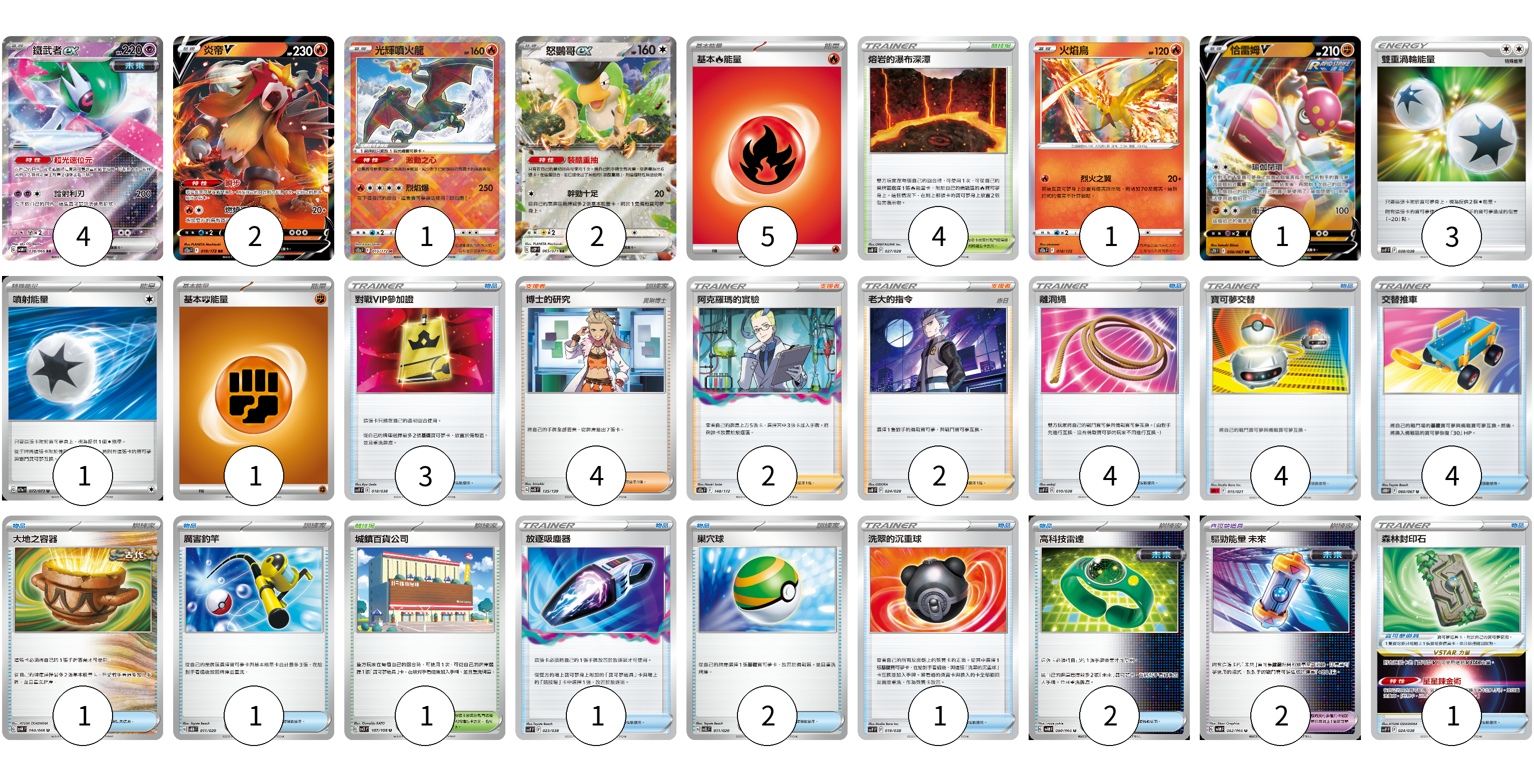 牌組構築方案 以此牌組為基礎新構築牌組 顯示卡面 顯示列表 寶可夢卡(11) 4 2 1 2 1 1 寶可夢道具(2) 2 物品卡(24) 3 4 4 4 1 1 1 2 1 2 1 支援者卡(8) 4 2 2 競技場卡(5) 4 1 能量卡(10) 5 3 1 1 寶可夢卡(11) 卡牌名稱 張數 卡牌名稱 張數 鐵武者ex SV4M 038/066 04 炎帝V S12a 019/172 02 光輝噴火龍 S12a 015/172 01 怒鸚哥ex SV2P 065/071 02 火焰鳥 S12a 018/172 01 恰雷姆V S7R 036/067 01 寶可夢道具(2) 卡牌名稱 張數 卡牌名稱 張數 驅勁能量 未來 SV4M 062/066 02 物品卡(24) 卡牌名稱 張數 卡牌名稱 張數 對戰VIP參加證 SVF 018/038 03 離洞繩 SVF 010/038 04 寶可夢交替 SDL 015/021 04 交替推車 S10D 060/067 04 大地之容器 SV4K 060/066 01 厲害釣竿 SVEM 011/020 01 放逐吸塵器 SVF 023/038 01 巢穴球 SVEL 011/020 02 洗翠的沉重球 SVF 019/038 01 高科技雷達 SV4M 060/066 02 森林封印石 SVF 024/038 01 支援者卡(8) 卡牌名稱 張數 卡牌名稱 張數 博士的研究(奧琳博士) SVD 135/139 04 阿克羅瑪的實驗 S12a 148/172 02 老大的指令(赤日) SVB 024/028 02 競技場卡(5) 卡牌名稱 張數 卡牌名稱 張數 熔岩的瀑布深潭 SVB 027/028 04 城鎮百貨公司 SV3 107/108 01 能量卡(10) 卡牌名稱 張數 卡牌名稱 張數 基本【火】能量 SVEL FIR 05 雙重渦輪能量 SVF 038/038 03 噴射能量 SV1a 072/073 01 基本【鬥】能量 SVF FIG 01 以此牌組為基礎新構築牌組 牌組編碼 Ryvlzu-FcIaec-YCXGqP copy 列印牌組單 牌組編碼已複製 分享至SNS