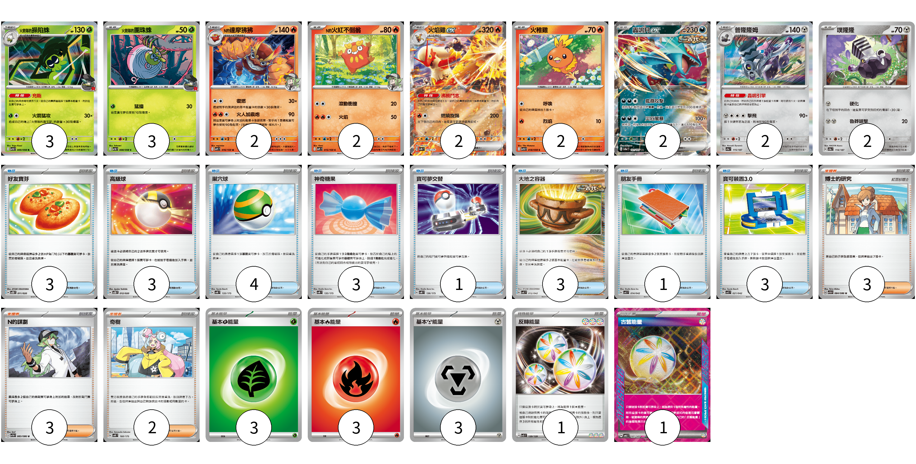 牌組構築方案 以此牌組為基礎新構築牌組 顯示卡面 顯示列表 寶可夢卡(20) 3 3 2 2 2 2 2 2 2 物品卡(21) 3 3 4 3 1 3 1 3 支援者卡(8) 3 3 2 能量卡(11) 3 3 3 1 1 寶可夢卡(20) 卡牌名稱 張數 卡牌名稱 張數 <火箭隊的>操陷蛛 SV10 009/098 03 <火箭隊的>團珠蛛 SV10 008/098 03 N的達摩狒狒 SV9 016/100 02 N的火紅不倒翁 SV9 015/100 02 火焰雞ex SVM 016/175 02 火稚雞 SV10 018/098 02 轟鳴月ex SV8a 101/187 02 普隆隆姆 SV8a 115/187 02 噗隆隆 SV8a 114/187 02 物品卡(21) 卡牌名稱 張數 卡牌名稱 張數 好友寶芬 SVOD 011/020 03 高級球 SVOD 012/020 03 巢穴球 SVM 133/175 04 神奇糖果 SVM 135/175 03 寶可夢交替 SVM 136/175 01 大地之容器 SVK 012/042 03 朋友手冊 SVK 014/042 01 寶可裝置3.0 SVK 021/042 03 支援者卡(8) 卡牌名稱 張數 卡牌名稱 張數 博士的研究 SV11B 084/086 03 N的謀劃 SV11B 083/086 03 奇樹 SVM 160/175 02 能量卡(11) 卡牌名稱 張數 卡牌名稱 張數 基本【草】能量 SVF GRA 03 基本【火】能量 SVTL FIR 03 基本【鋼】能量 SVF MET 03 反轉能量 SVD 139/139 01 古舊能量 SV6 101/101 01 以此牌組為基礎新構築牌組 牌組編碼 SAjQOE-cjPAQF-pltVAw copy 列印牌組單 牌組編碼已複製 分享至SNS