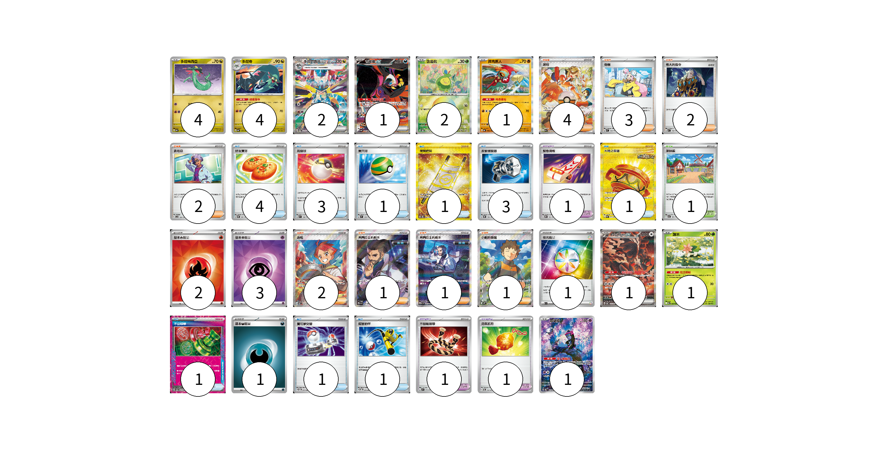 牌組構築方案 以此牌組為基礎新構築牌組 顯示卡面 顯示列表 寶可夢卡(17) 4 4 2 1 2 1 1 1 1 寶可夢道具(3) 1 1 1 物品卡(16) 4 3 1 1 3 1 1 1 1 支援者卡(16) 4 3 2 2 2 1 1 1 競技場卡(1) 1 能量卡(7) 2 3 1 1 寶可夢卡(17) 卡牌名稱 張數 卡牌名稱 張數 多龍梅西亞 SV8a 118/187 04 多龍奇 SV8a 119/187 04 多龍巴魯托ex SV8a 221/187 02 吉雉雞ex SV6a 089/064 01 含羞苞 SV8a 001/187 02 摔角鷹人 SV8a 084/187 01 月月熊 赫月ex SV8a 225/187 01 謝米 SV9a 006/063 01 願增猿 SV6 107/101 01 寶可夢道具(3) 卡牌名稱 張數 卡牌名稱 張數 緊急滑板 SV8a 153/187 01 不服輸頭帶 SV1S 073/078 01 勇氣護符 SVEM 016/020 01 物品卡(16) 卡牌名稱 張數 卡牌名稱 張數 好友寶芬 SV8a 147/187 04 高級球 SVM 134/175 03 巢穴球 SVM 133/175 01 夜間擔架 SV8 137/106 01 反擊捕捉器 SV8a 139/187 03 大地之容器 SV6a 093/064 01 不公印章 SV5a 053/066 01 寶可夢交替 SVOD 014/020 01 厲害釣竿 SVOD 010/020 01 支援者卡(16) 卡牌名稱 張數 卡牌名稱 張數 派帕 SV4a 353/190 04 奇樹 SVM 160/175 03 老大的指令 SVM 172/175 02 吉尼亞 SVD 129/139 02 赤松 SV7 123/102 02 弗圖博士的劇本 SV4M 086/066 01 弗圖博士的劇本 SV4M 091/066 01 小剛的發掘 SV9 123/100 01 競技場卡(1) 卡牌名稱 張數 卡牌名稱 張數 深缽鎮 SV4a 185/190 01 能量卡(7) 卡牌名稱 張數 卡牌名稱 張數 基本【火】能量 SVK FIR 02 基本【超】能量 SVK PSY 03 夜光能量 SV1a 073/073 01 基本【惡】能量 SVD DAR 01 以此牌組為基礎新構築牌組 牌組編碼 SAsRUB-ealqmQ-WxmkEx copy 列印牌組單 牌組編碼已複製 分享至SNS