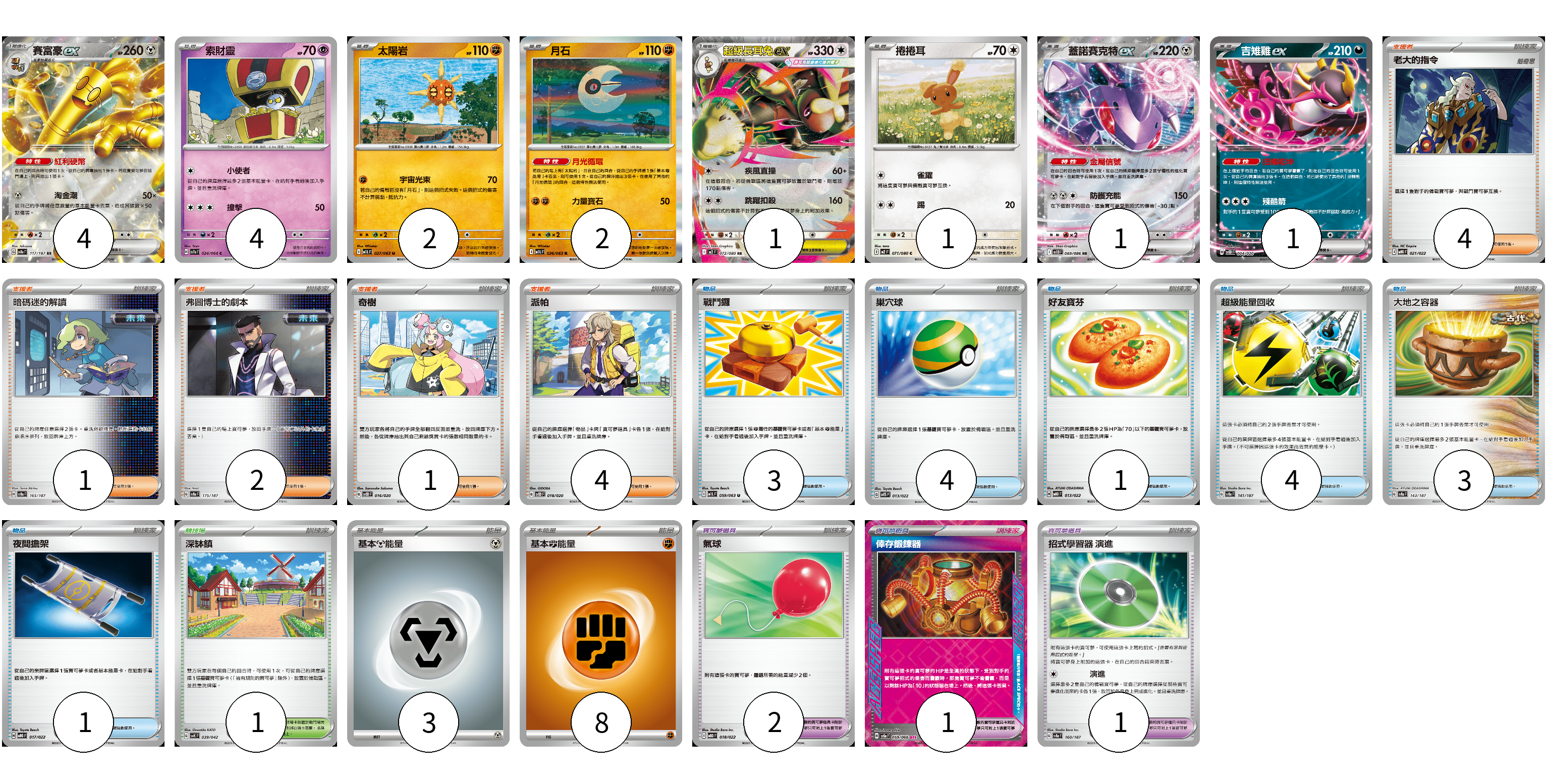 牌組構築方案 以此牌組為基礎新構築牌組 顯示卡面 顯示列表 寶可夢卡(16) 4 4 2 2 1 1 1 1 寶可夢道具(4) 2 1 1 物品卡(16) 3 4 1 4 3 1 支援者卡(12) 4 1 2 1 4 競技場卡(1) 1 能量卡(11) 3 8 寶可夢卡(16) 卡牌名稱 張數 卡牌名稱 張數 賽富豪ex SV8a 117/187 04 索財靈 SV7a 024/064 04 太陽岩 M1L 027/063 02 月石 M1L 026/063 02 超級長耳兔ex M2 072/080 01 捲捲耳 M2 071/080 01 蓋諾賽克特ex SV11B 069/086 01 吉雉雞ex SVOD 004/020 01 寶可夢道具(4) 卡牌名稱 張數 卡牌名稱 張數 氣球 MBD 018/022 02 倖存鍛鍊器 SV5a 059/066 01 招式學習器 演進 SV8a 160/187 01 物品卡(16) 卡牌名稱 張數 卡牌名稱 張數 戰鬥鑼 M1L 059/063 03 巢穴球 SVTS 013/022 04 好友寶芬 MBD 013/022 01 超級能量回收 SV8a 141/187 04 大地之容器 SV8a 143/187 03 夜間擔架 MBG 017/022 01 支援者卡(12) 卡牌名稱 張數 卡牌名稱 張數 老大的指令 MBG 021/022 04 暗碼迷的解讀 SV8a 165/187 01 弗圖博士的劇本 SV8a 175/187 02 奇樹 SVOD 016/020 01 派帕 SVOD 018/020 04 競技場卡(1) 卡牌名稱 張數 卡牌名稱 張數 深缽鎮 SVK 039/042 01 能量卡(11) 卡牌名稱 張數 卡牌名稱 張數 基本鋼能量 sv-p MET 03 基本鬥能量 sv-p FIG 08 以此牌組為基礎新構築牌組 牌組編碼 SAteMV-dlOTms-UIBkXf copy 列印牌組單 牌組編碼已複製 分享至SNS
