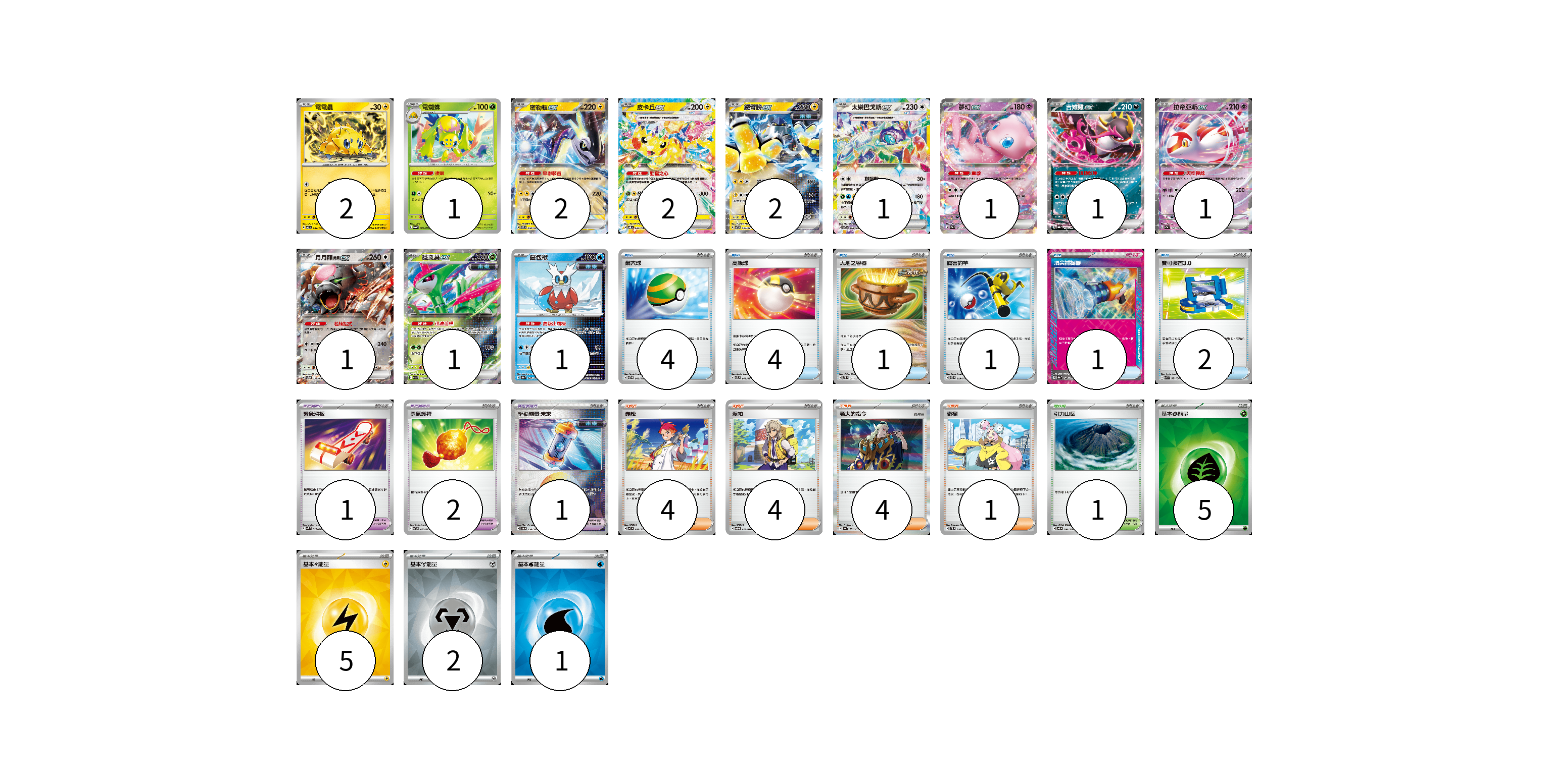牌組構築方案 以此牌組為基礎新構築牌組 顯示卡面 顯示列表 寶可夢卡(16) 2 1 2 2 2 1 1 1 1 1 1 1 寶可夢道具(5) 1 2 1 1 物品卡(13) 4 4 1 1 1 2 支援者卡(12) 4 4 4 競技場卡(1) 1 能量卡(13) 5 5 2 1 寶可夢卡(16) 卡牌名稱 張數 卡牌名稱 張數 電電蟲 SV7 032/102 02 電蜘蛛 SV6a 002/064 01 密勒頓ex SVTR 008/021 02 皮卡丘ex SV8 033/106 02 鐵臂膀ex SVTR 007/021 02 太樂巴戈斯ex SV7 088/102 01 夢幻ex SV2a 151/165 01 吉雉雞ex SV8a 104/187 01 拉帝亞斯ex SV7a 019/064 01 月月熊 赫月 ex SV5a 052/066 01 鐵斑葉ex SV5M 016/071 01 鐵包袱 SV8a 047/187 01 寶可夢道具(5) 卡牌名稱 張數 卡牌名稱 張數 緊急滑板 SVK 023/042 01 勇氣護符 SVTR 015/021 02 驅勁能量 未來 SV8a 158/187 01 奇樹 SVTL 018/021 01 物品卡(13) 卡牌名稱 張數 卡牌名稱 張數 巢穴球 SVTG 012/019 04 高級球 SVTL 012/021 04 大地之容器 SVTS 011/022 01 厲害釣竿 SVTG 009/019 01 頂尖捕捉器 SV8a 148/187 01 寶可裝置3.0 SVK 021/042 02 支援者卡(12) 卡牌名稱 張數 卡牌名稱 張數 赤松 SV7 097/102 04 派帕 SVOD 018/020 04 老大的指令 SV4a 181/190 04 競技場卡(1) 卡牌名稱 張數 卡牌名稱 張數 引力山岳 SV8 106/106 01 能量卡(13) 卡牌名稱 張數 卡牌名稱 張數 基本【草】能量 SVM GRA 05 基本【雷】能量 SVM LIG 05 基本【鋼】能量 SVM MET 02 基本【水】能量 SVM WAT 01 以此牌組為基礎新構築牌組 牌組編碼 SBFXVa-TTbVka-iMQVNo copy 列印牌組單 牌組編碼已複製 分享至SNS