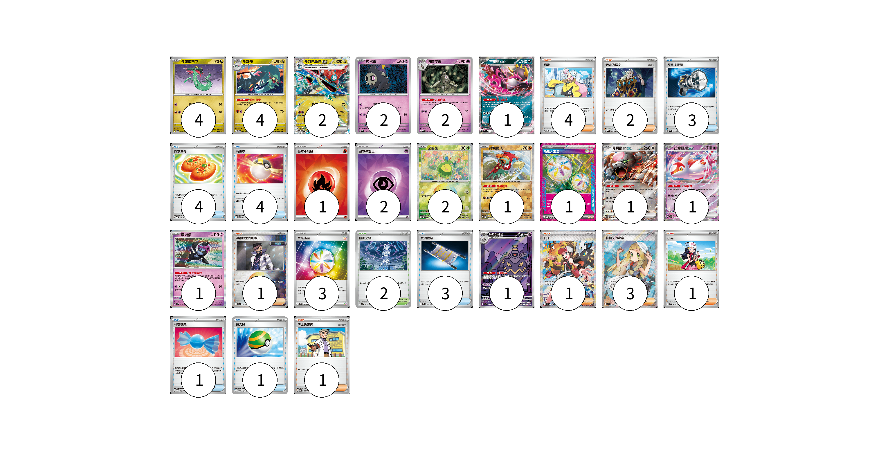 牌組構築方案 以此牌組為基礎新構築牌組 顯示卡面 顯示列表 寶可夢卡(22) 4 4 2 2 2 1 2 1 1 1 1 1 物品卡(16) 3 4 4 3 1 1 支援者卡(13) 4 2 1 1 3 1 1 競技場卡(2) 2 能量卡(7) 1 2 1 3 寶可夢卡(22) 卡牌名稱 張數 卡牌名稱 張數 多龍梅西亞 SV6 079/101 04 多龍奇 SV6 080/101 04 多龍巴魯托ex SV6 081/101 02 夜巡靈 SV6a 018/064 02 彷徨夜靈 SV6a 019/064 02 吉雉雞ex SV6a 038/064 01 含羞苞 SV8a 001/187 02 摔角鷹人 SV8a 084/187 01 月月熊 赫月 ex SV5a 052/066 01 拉帝亞斯ex SV7a 019/064 01 願增猿 SV8a 075/187 01 黑夜魔靈 SV6a 070/064 01 物品卡(16) 卡牌名稱 張數 卡牌名稱 張數 反擊捕捉器 SVK 009/042 03 好友寶芬 SVK 015/042 04 高級球 SVTG 013/019 04 夜間擔架 SV8a 151/187 03 神奇糖果 MBG 013/022 01 巢穴球 SVTG 012/019 01 支援者卡(13) 卡牌名稱 張數 卡牌名稱 張數 奇樹 SVTM 017/022 04 老大的指令 SVHM 022/022 02 弗圖博士的劇本 SV8a 175/187 01 鬥子 SV11W 173/086 01 莉莉艾的決意 M1L 086/063 03 小光 M2 077/080 01 博士的研究 SVM 162/175 01 競技場卡(2) 卡牌名稱 張數 卡牌名稱 張數 阻礙之塔 SV8a 181/187 02 能量卡(7) 卡牌名稱 張數 卡牌名稱 張數 基本【火】能量 SVK FIR 01 基本【超】能量 SVK PSY 02 新衝天能量 SV5K 071/071 01 夜光能量 SVK 042/042 03 以此牌組為基礎新構築牌組 牌組編碼 SBJRzr-tpCGxL-gLyhuJ copy 列印牌組單 牌組編碼已複製 分享至SNS