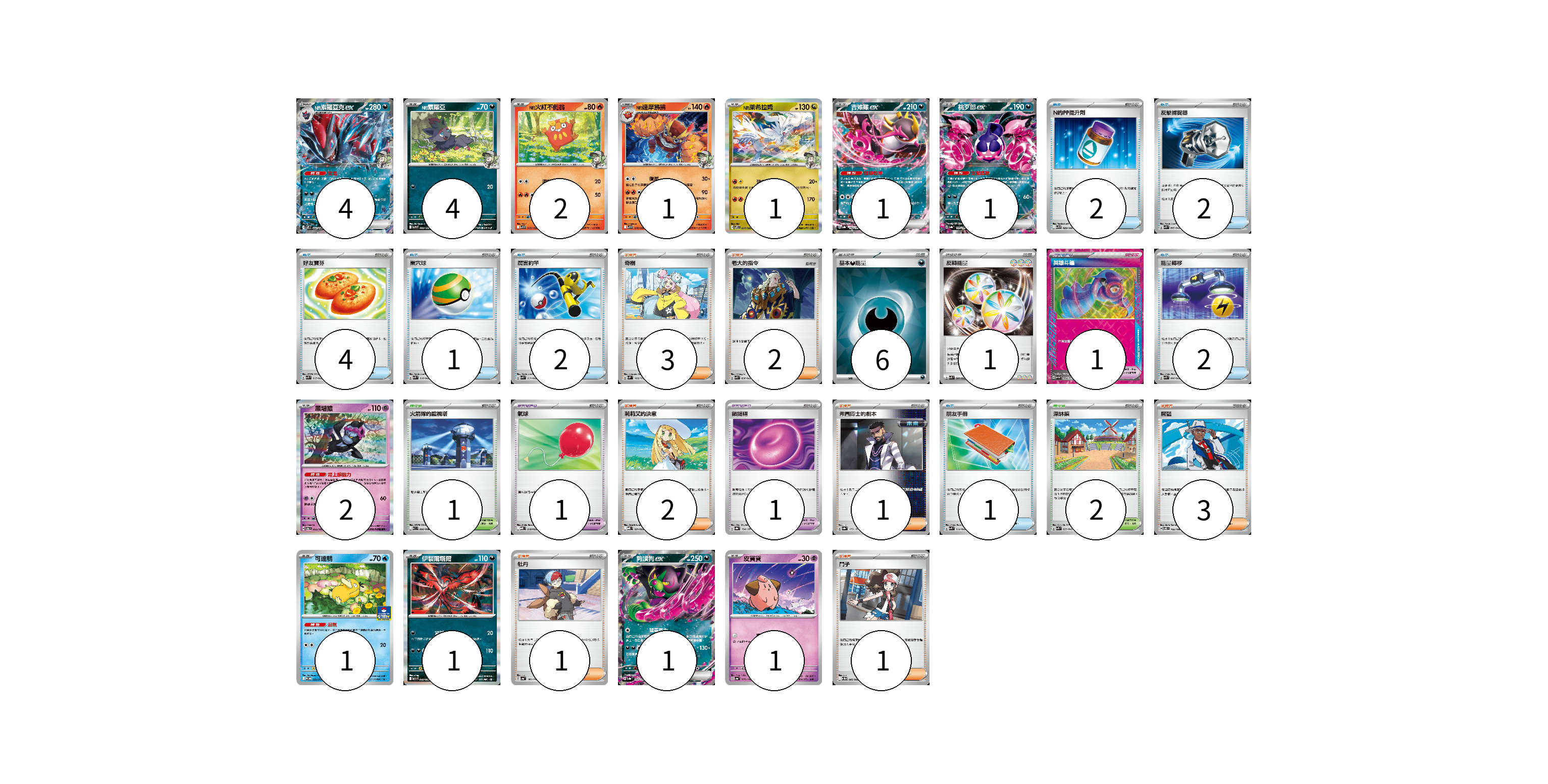 牌組構築方案 以此牌組為基礎新構築牌組 顯示卡面 顯示列表 寶可夢卡(20) 4 4 2 1 1 1 1 2 1 1 1 1 寶可夢道具(3) 1 1 1 物品卡(14) 2 2 4 1 2 2 1 支援者卡(13) 3 2 2 1 3 1 1 競技場卡(3) 1 2 能量卡(7) 6 1 寶可夢卡(20) 卡牌名稱 張數 卡牌名稱 張數 N的索羅亞克ex SV9 061/100 04 N的索羅亞 SV9 060/100 04 N的火紅不倒翁 SV9 015/100 02 N的達摩狒狒 SV9 016/100 01 N的萊希拉姆 SV9 074/100 01 吉雉雞ex SV8a 104/187 01 桃歹郎ex SV8a 105/187 01 願增猿 SV6 055/101 02 可達鴨 SV-P 220/SV-P 01 伊裴爾塔爾 M1L 040/063 01 夠讚狗ex SV8a 102/187 01 皮寶寶 SV4a 077/190 01 寶可夢道具(3) 卡牌名稱 張數 卡牌名稱 張數 英雄斗篷 SV5M 064/071 01 氣球 MBD 018/022 01 鎖鏈糬 SV8a 154/187 01 物品卡(14) 卡牌名稱 張數 卡牌名稱 張數 N的PP提升劑 SV9 089/100 02 反擊捕捉器 SVK 009/042 02 好友寶芬 SVK 015/042 04 巢穴球 SVK 016/042 01 厲害釣竿 SVK 011/042 02 能量轉移 SVK 008/042 02 朋友手冊 SVK 014/042 01 支援者卡(13) 卡牌名稱 張數 卡牌名稱 張數 奇樹 SVM 160/175 03 老大的指令 SVK 036/042 02 莉莉艾的決意 MBD 021/022 02 弗圖博士的劇本 SV8a 175/187 01 席藍 SV8 102/106 03 牡丹 SV4a 182/190 01 鬥子 SV11W 085/086 01 競技場卡(3) 卡牌名稱 張數 卡牌名稱 張數 火箭隊的監視塔 SV10 096/098 01 深缽鎮 SVK 039/042 02 能量卡(7) 卡牌名稱 張數 卡牌名稱 張數 基本【惡】能量 SVK DAR 06 反轉能量 SVK 041/042 01 以此牌組為基礎新構築牌組 牌組編碼 SBLTEk-SZBieL-okXvtj copy 列印牌組單 牌組編碼已複製 分享至SNS