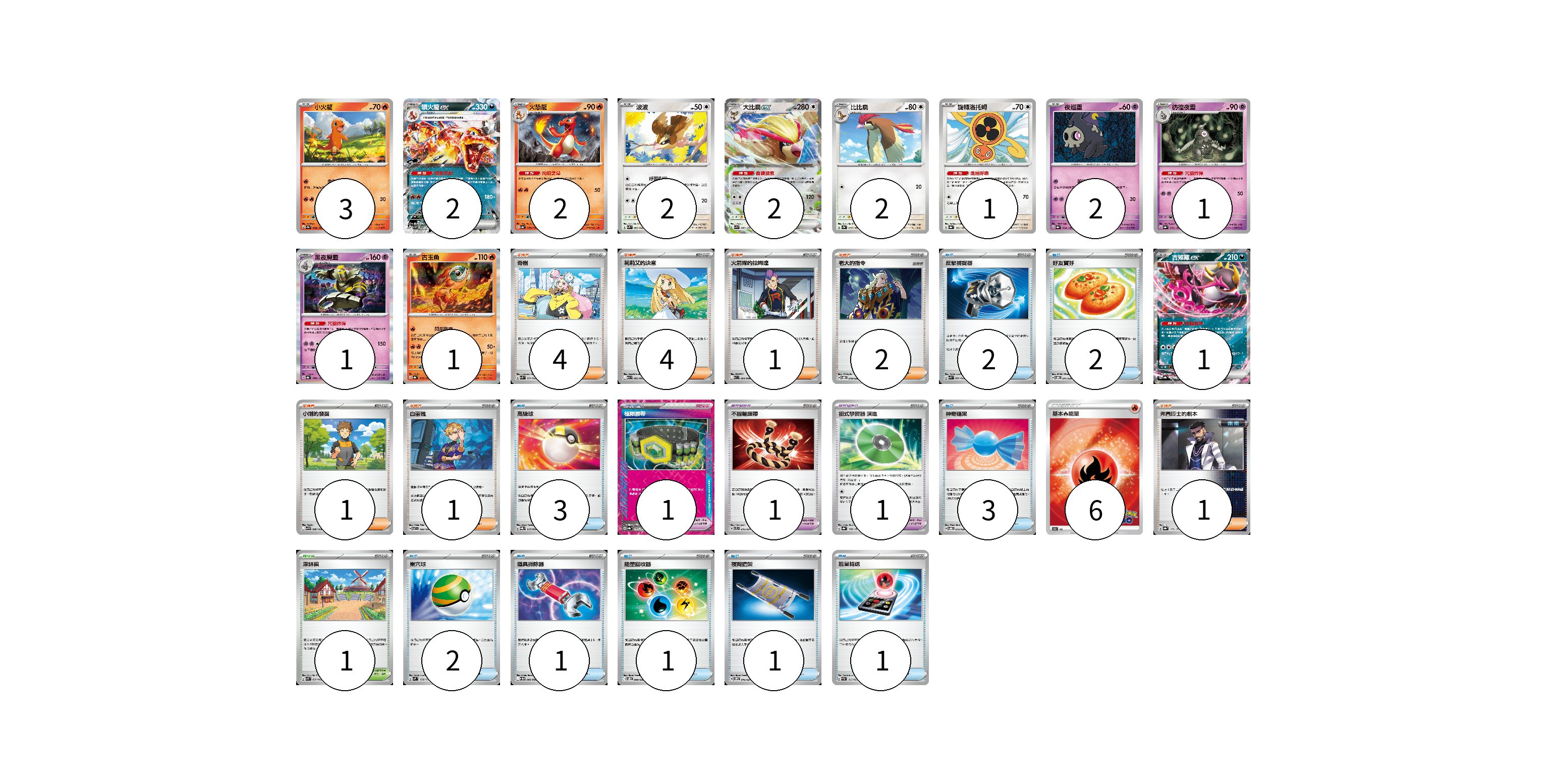 牌組構築方案 以此牌組為基礎新構築牌組 顯示卡面 顯示列表 寶可夢卡(20) 3 2 2 2 2 2 1 2 1 1 1 1 寶可夢道具(3) 1 1 1 物品卡(16) 2 2 3 3 2 1 1 1 1 支援者卡(14) 4 4 1 2 1 1 1 競技場卡(1) 1 能量卡(6) 6 寶可夢卡(20) 卡牌名稱 張數 卡牌名稱 張數 小火龍 SV2a 004/165 03 噴火龍ex SV3 066/108 02 火恐龍 SV4a 026/190 02 波波 SVK 003/042 02 大比鳥ex SV3 089/108 02 比比鳥 SV2a 017/165 02 旋轉洛托姆 SV8a 131/187 01 夜巡靈 SV8a 064/187 02 彷徨夜靈 SV8a 065/187 01 黑夜魔靈 SV8a 066/187 01 古玉魚 SV8a 025/187 01 吉雉雞ex SV8a 104/187 01 寶可夢道具(3) 卡牌名稱 張數 卡牌名稱 張數 極限腰帶 SV8a 159/187 01 不服輸頭帶 SVTL 016/021 01 招式學習器 演進 SV8a 160/187 01 物品卡(16) 卡牌名稱 張數 卡牌名稱 張數 反擊捕捉器 SVK 009/042 02 好友寶芬 SVOD 011/020 02 高級球 SVQL 015/022 03 神奇糖果 SVOD 013/020 03 巢穴球 SVM 133/175 02 道具拆除器 SV11W 080/086 01 能量回收器 SVOD 009/020 01 夜間擔架 SVOM 016/021 01 能量輸送 SVAM 013/023 01 支援者卡(14) 卡牌名稱 張數 卡牌名稱 張數 奇樹 SVK 031/042 04 莉莉艾的決意 M1L 062/063 04 火箭隊的拉姆達 SV10 094/098 01 老大的指令 SVOD 019/020 02 小剛的發掘 SV9 096/100 01 白蕾雅 SV7 100/102 01 弗圖博士的劇本 SV8a 175/187 01 競技場卡(1) 卡牌名稱 張數 卡牌名稱 張數 深缽鎮 SVK 039/042 01 能量卡(6) 卡牌名稱 張數 卡牌名稱 張數 基本火能量 S10b FIR 06 以此牌組為基礎新構築牌組 牌組編碼 SBXIuG-dGXOZR-yMiJnd copy 列印牌組單 牌組編碼已複製 分享至SNS