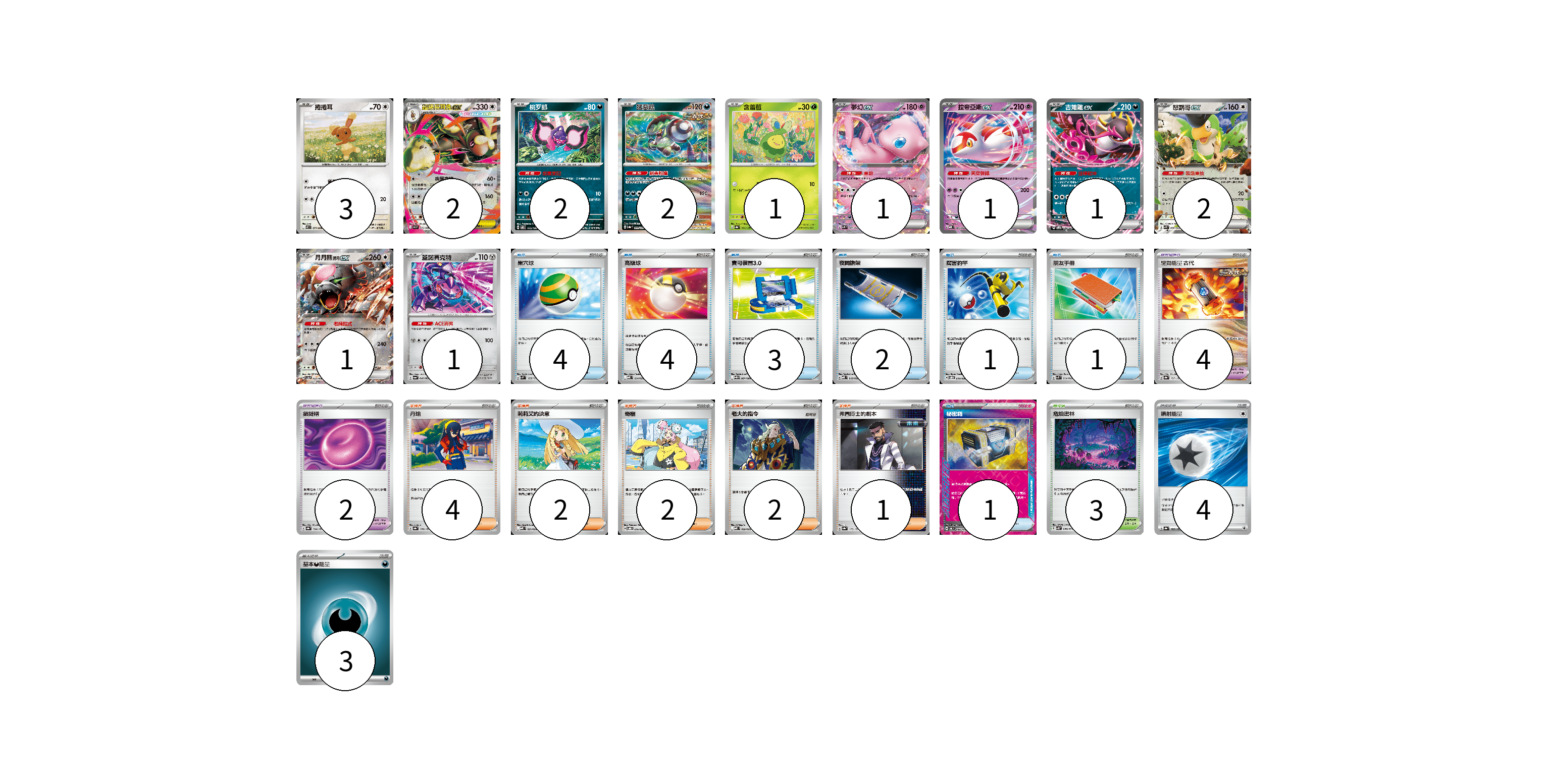 牌組構築方案 以此牌組為基礎新構築牌組 顯示卡面 顯示列表 寶可夢卡(17) 3 2 2 2 1 1 1 1 2 1 1 寶可夢道具(6) 4 2 物品卡(16) 4 4 3 2 1 1 1 支援者卡(11) 4 2 2 2 1 競技場卡(3) 3 能量卡(7) 4 3 寶可夢卡(17) 卡牌名稱 張數 卡牌名稱 張數 捲捲耳 M2 071/080 03 超級長耳兔ex M2 072/080 02 桃歹郎 SV8 075/106 02 猛惡菇 SV8a 099/187 02 含羞苞 SV8a 001/187 01 夢幻ex SVK 001/042 01 拉帝亞斯ex MBD 003/022 01 吉雉雞ex SVOM 009/021 01 怒鸚哥ex SVK 006/042 02 月月熊 赫月 ex SV5a 052/066 01 蓋諾賽克特 SV6a 040/064 01 寶可夢道具(6) 卡牌名稱 張數 卡牌名稱 張數 驅勁能量 古代 SV8a 157/187 04 鎖鏈糬 SV8a 154/187 02 物品卡(16) 卡牌名稱 張數 卡牌名稱 張數 巢穴球 SVM 133/175 04 高級球 MBD 014/022 04 寶可裝置3.0 SV11B 081/086 03 夜間擔架 MBD 016/022 02 厲害釣竿 SVOD 010/020 01 朋友手冊 SVK 014/042 01 秘密箱 SV6 092/101 01 支援者卡(11) 卡牌名稱 張數 卡牌名稱 張數 丹瑜 SV8a 170/187 04 莉莉艾的決意 MBD 021/022 02 奇樹 SVOD 016/020 02 老大的指令 MBD 020/022 02 弗圖博士的劇本 SV8a 175/187 01 競技場卡(3) 卡牌名稱 張數 卡牌名稱 張數 危險密林 SV5K 070/071 03 能量卡(7) 卡牌名稱 張數 卡牌名稱 張數 噴射能量 SV8a 185/187 04 基本惡能量 sv-p DAR 03 以此牌組為基礎新構築牌組 牌組編碼 SCBRKR-EuaQFU-zAZsHa copy 列印牌組單 牌組編碼已複製 分享至SNS