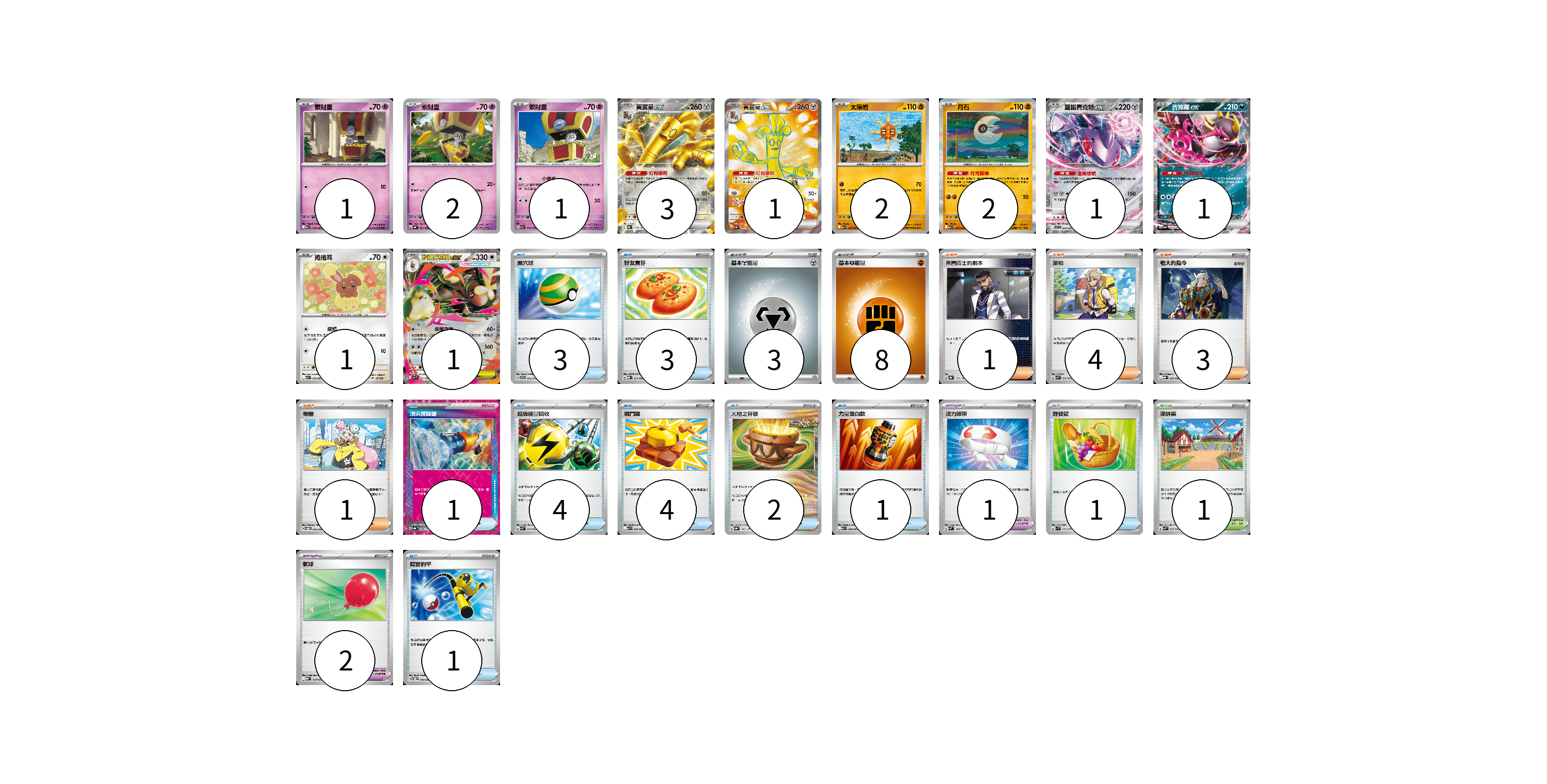 牌組構築方案 以此牌組為基礎新構築牌組 顯示卡面 顯示列表 寶可夢卡(16) 1 2 1 3 1 2 2 1 1 1 1 寶可夢道具(3) 1 2 物品卡(20) 3 3 1 4 4 2 1 1 1 支援者卡(9) 1 4 3 1 競技場卡(1) 1 能量卡(11) 3 8 寶可夢卡(16) 卡牌名稱 張數 卡牌名稱 張數 索財靈 M1L 019/063 01 索財靈 SV3a 021/062 02 索財靈 SV7a 024/064 01 賽富豪ex SV8a 117/187 03 賽富豪ex SV3a 079/062 01 太陽岩 M1L 027/063 02 月石 M1L 026/063 02 蓋諾賽克特ex SV11B 069/086 01 吉雉雞ex SV6a 038/064 01 捲捲耳 M1S 053/063 01 超級長耳兔ex M2 072/080 01 寶可夢道具(3) 卡牌名稱 張數 卡牌名稱 張數 活力頭帶 SVM 140/175 01 氣球 MBD 018/022 02 物品卡(20) 卡牌名稱 張數 卡牌名稱 張數 巢穴球 SVTG 012/019 03 好友寶芬 MBG 011/022 03 頂尖捕捉器 SV8a 148/187 01 超級能量回收 SVK 010/042 04 戰鬥鑼 M1L 059/063 04 大地之容器 SV8a 143/187 02 力量蛋白飲 M1L 058/063 01 野餐籃 SV1V 071/078 01 厲害釣竿 SVOD 010/020 01 支援者卡(9) 卡牌名稱 張數 卡牌名稱 張數 弗圖博士的劇本 SV8a 175/187 01 派帕 SVK 035/042 04 老大的指令 MBG 021/022 03 奇樹 SVOD 016/020 01 競技場卡(1) 卡牌名稱 張數 卡牌名稱 張數 深缽鎮 SVK 039/042 01 能量卡(11) 卡牌名稱 張數 卡牌名稱 張數 基本【鋼】能量 M-P MET 03 基本【鬥】能量 M-P FIG 08 以此牌組為基礎新構築牌組 牌組編碼 SDcLcI-nIunzu-atBvOc copy 列印牌組單 牌組編碼已複製 分享至SNS