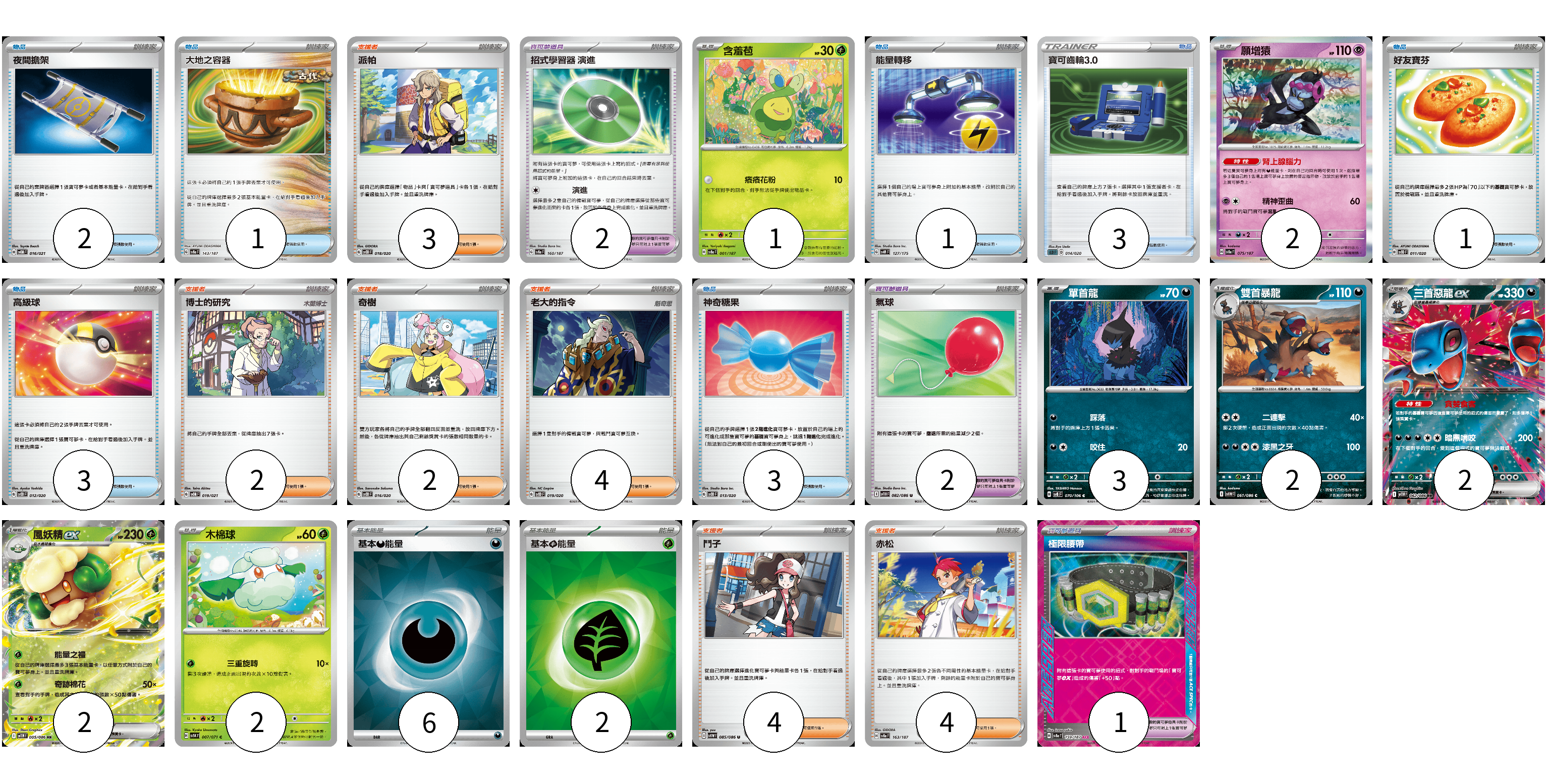牌組構築方案 以此牌組為基礎新構築牌組 顯示卡面 顯示列表 寶可夢卡(14) 1 2 3 2 2 2 2 寶可夢道具(5) 2 2 1 物品卡(14) 2 1 1 3 1 3 3 支援者卡(19) 3 2 2 4 4 4 能量卡(8) 6 2 寶可夢卡(14) 卡牌名稱 張數 卡牌名稱 張數 含羞苞 SV8a 001/187 01 願增猿 SV8a 075/187 02 單首龍 SV8 070/106 03 雙首暴龍 SV11W 061/086 02 三首惡龍ex SV11W 062/086 02 風妖精ex SV11W 005/086 02 木棉球 SV5K 007/071 02 寶可夢道具(5) 卡牌名稱 張數 卡牌名稱 張數 招式學習器 演進 SV8a 160/187 02 氣球 SV11B 082/086 02 極限腰帶 SV8a 159/187 01 物品卡(14) 卡牌名稱 張數 卡牌名稱 張數 夜間擔架 SVOM 016/021 02 大地之容器 SV8a 143/187 01 能量轉移 SVM 127/175 01 寶可齒輪3.0 SLD 014/020 03 好友寶芬 SVOD 011/020 01 高級球 SVOD 012/020 03 神奇糖果 SVOD 013/020 03 支援者卡(19) 卡牌名稱 張數 卡牌名稱 張數 派帕 SVOD 018/020 03 博士的研究 SVOM 019/021 02 奇樹 SVOD 016/020 02 老大的指令 SVOD 019/020 04 鬥子 SV11W 085/086 04 赤松 SV8a 163/187 04 能量卡(8) 卡牌名稱 張數 卡牌名稱 張數 基本【惡】能量 SVOM DAR 06 基本【草】能量 SVM GRA 02 以此牌組為基礎新構築牌組 牌組編碼 SEwRFD-rJgCaa-dfkUWE copy 列印牌組單 牌組編碼已複製 分享至SNS