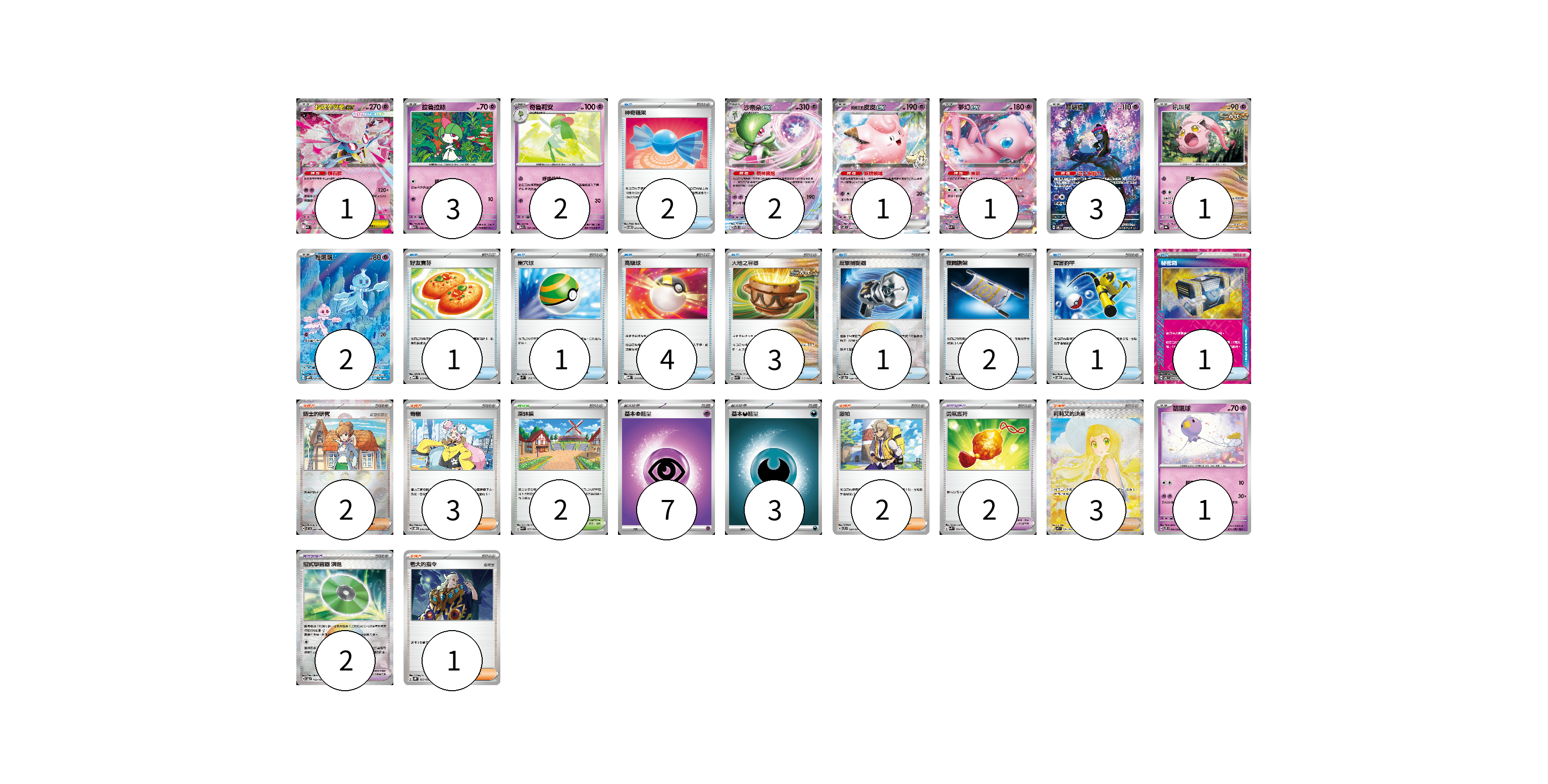 牌組構築方案 以此牌組為基礎新構築牌組 顯示卡面 顯示列表 寶可夢卡(17) 1 3 2 2 1 1 3 1 2 1 寶可夢道具(4) 2 2 物品卡(16) 2 1 1 4 3 1 2 1 1 支援者卡(11) 2 3 2 3 1 競技場卡(2) 2 能量卡(10) 7 3 寶可夢卡(17) 卡牌名稱 張數 卡牌名稱 張數 超級蒂安希ex MBD 006/022 01 拉魯拉絲 M1S 040/063 03 奇魯莉安 M1S 041/063 02 沙奈朵ex SVTS 004/022 02 莉莉艾的皮皮ex SV9 033/100 01 夢幻ex SVK 001/042 01 願增猿 SV6 107/101 03 吼叫尾 SV8a 071/187 01 輕飄飄 SV11W 124/086 02 飄飄球 SVTS 005/022 01 寶可夢道具(4) 卡牌名稱 張數 卡牌名稱 張數 勇氣護符 SVK 024/042 02 招式學習器 演進 SV8a 160/187 02 物品卡(16) 卡牌名稱 張數 卡牌名稱 張數 神奇糖果 SVTM 013/022 02 好友寶芬 MBD 013/022 01 巢穴球 SVM 133/175 01 高級球 MBD 014/022 04 大地之容器 SVK 012/042 03 反擊捕捉器 SV8a 139/187 01 夜間擔架 MBD 016/022 02 厲害釣竿 SVOD 010/020 01 秘密箱 SV6 092/101 01 支援者卡(11) 卡牌名稱 張數 卡牌名稱 張數 博士的研究 SV11B 084/086 02 奇樹 SVOD 016/020 03 派帕 SVTL 020/021 02 莉莉艾的決意 M1L 091/063 03 老大的指令 SVHK 022/022 01 競技場卡(2) 卡牌名稱 張數 卡牌名稱 張數 深缽鎮 SVK 039/042 02 能量卡(10) 卡牌名稱 張數 卡牌名稱 張數 基本【超】能量 MBD PSY 07 基本【惡】能量 MBG DAR 03 以此牌組為基礎新構築牌組 牌組編碼 SFBYsz-FOavIF-yWHMQX copy 列印牌組單 牌組編碼已複製 分享至SNS