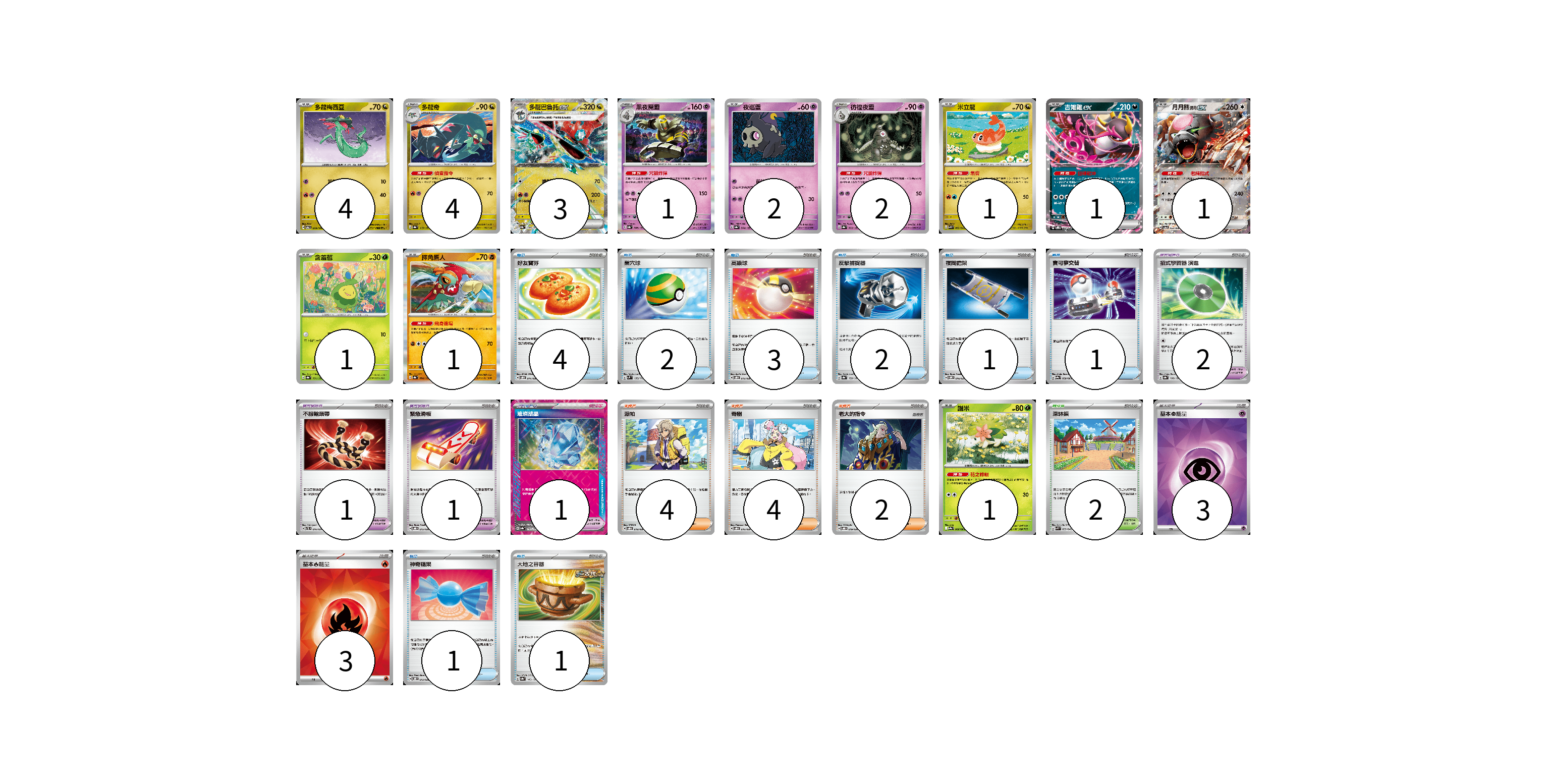牌組構築方案 以此牌組為基礎新構築牌組 顯示卡面 顯示列表 寶可夢卡(22) 4 4 3 1 2 2 1 1 1 1 1 1 寶可夢道具(5) 2 1 1 1 物品卡(15) 4 2 3 2 1 1 1 1 支援者卡(10) 4 4 2 競技場卡(2) 2 能量卡(6) 3 3 寶可夢卡(22) 卡牌名稱 張數 卡牌名稱 張數 多龍梅西亞 SV6 079/101 04 多龍奇 SV8a 119/187 04 多龍巴魯托ex SV8a 120/187 03 黑夜魔靈 SV8a 066/187 01 夜巡靈 SV8a 064/187 02 彷徨夜靈 SV8a 065/187 02 米立龍 SVK 002/042 01 吉雉雞ex SVOD 004/020 01 月月熊 赫月 ex SV5a 052/066 01 含羞苞 SV8a 001/187 01 摔角鷹人 SV8a 084/187 01 謝米 SV9a 006/063 01 寶可夢道具(5) 卡牌名稱 張數 卡牌名稱 張數 招式學習器 演進 SV8a 160/187 02 不服輸頭帶 SVTL 016/021 01 緊急滑板 SVOD 015/020 01 璀璨結晶 SV8a 152/187 01 物品卡(15) 卡牌名稱 張數 卡牌名稱 張數 好友寶芬 SVOD 011/020 04 巢穴球 SVM 133/175 02 高級球 SVOD 012/020 03 反擊捕捉器 SV8a 139/187 02 夜間擔架 SVOM 016/021 01 寶可夢交替 SV9a 058/063 01 神奇糖果 SVOD 013/020 01 大地之容器 SV8a 143/187 01 支援者卡(10) 卡牌名稱 張數 卡牌名稱 張數 派帕 SVOD 018/020 04 奇樹 SVOD 016/020 04 老大的指令 SVOD 019/020 02 競技場卡(2) 卡牌名稱 張數 卡牌名稱 張數 深缽鎮 SVK 039/042 02 能量卡(6) 卡牌名稱 張數 卡牌名稱 張數 基本【超】能量 SVOD PSY 03 基本【火】能量 SVK FIR 03 以此牌組為基礎新構築牌組 牌組編碼 SGPryh-AEMmcu-aSYFfg copy 列印牌組單 牌組編碼已複製 分享至SNS