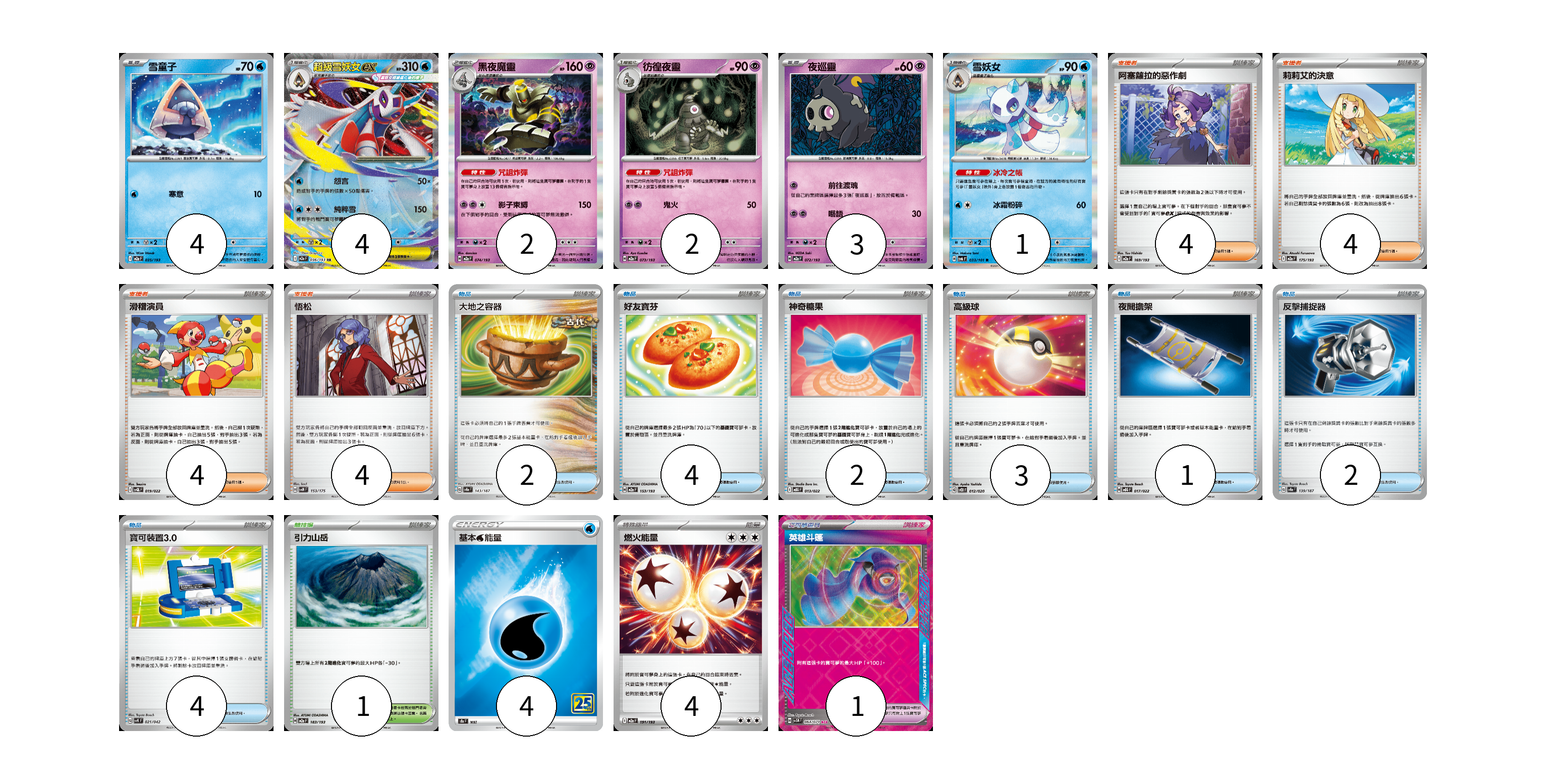牌組構築方案 以此牌組為基礎新構築牌組 顯示卡面 顯示列表 寶可夢卡(16) 4 4 2 2 3 1 寶可夢道具(1) 1 物品卡(18) 2 4 2 3 1 2 4 支援者卡(16) 4 4 4 4 競技場卡(1) 1 能量卡(8) 4 4 寶可夢卡(16) 卡牌名稱 張數 卡牌名稱 張數 雪童子 M2a 035/193 04 超級雪妖女ex M2a 036/193 04 黑夜魔靈 M2a 074/193 02 彷徨夜靈 M2a 073/193 02 夜巡靈 M2a 072/193 03 雪妖女 SV6 033/101 01 寶可夢道具(1) 卡牌名稱 張數 卡牌名稱 張數 英雄斗篷 SV5M 064/071 01 物品卡(18) 卡牌名稱 張數 卡牌名稱 張數 大地之容器 SV8a 143/187 02 好友寶芬 M2a 153/193 04 神奇糖果 MBG 013/022 02 高級球 SVOD 012/020 03 夜間擔架 MBG 017/022 01 反擊捕捉器 SV8a 139/187 02 寶可裝置3.0 SVK 021/042 04 支援者卡(16) 卡牌名稱 張數 卡牌名稱 張數 阿塞蘿拉的惡作劇 M2a 169/193 04 莉莉艾的決意 M2a 175/193 04 滑稽演員 SVQL 019/022 04 悟松 SVM 153/175 04 競技場卡(1) 卡牌名稱 張數 卡牌名稱 張數 引力山岳 M2a 183/193 01 能量卡(8) 卡牌名稱 張數 卡牌名稱 張數 基本水能量 S8a WAT 04 燃火能量 M2a 191/193 04 以此牌組為基礎新構築牌組 牌組編碼 SIfKff-bForoJ-KEzVXM copy 列印牌組單 牌組編碼已複製 分享至SNS