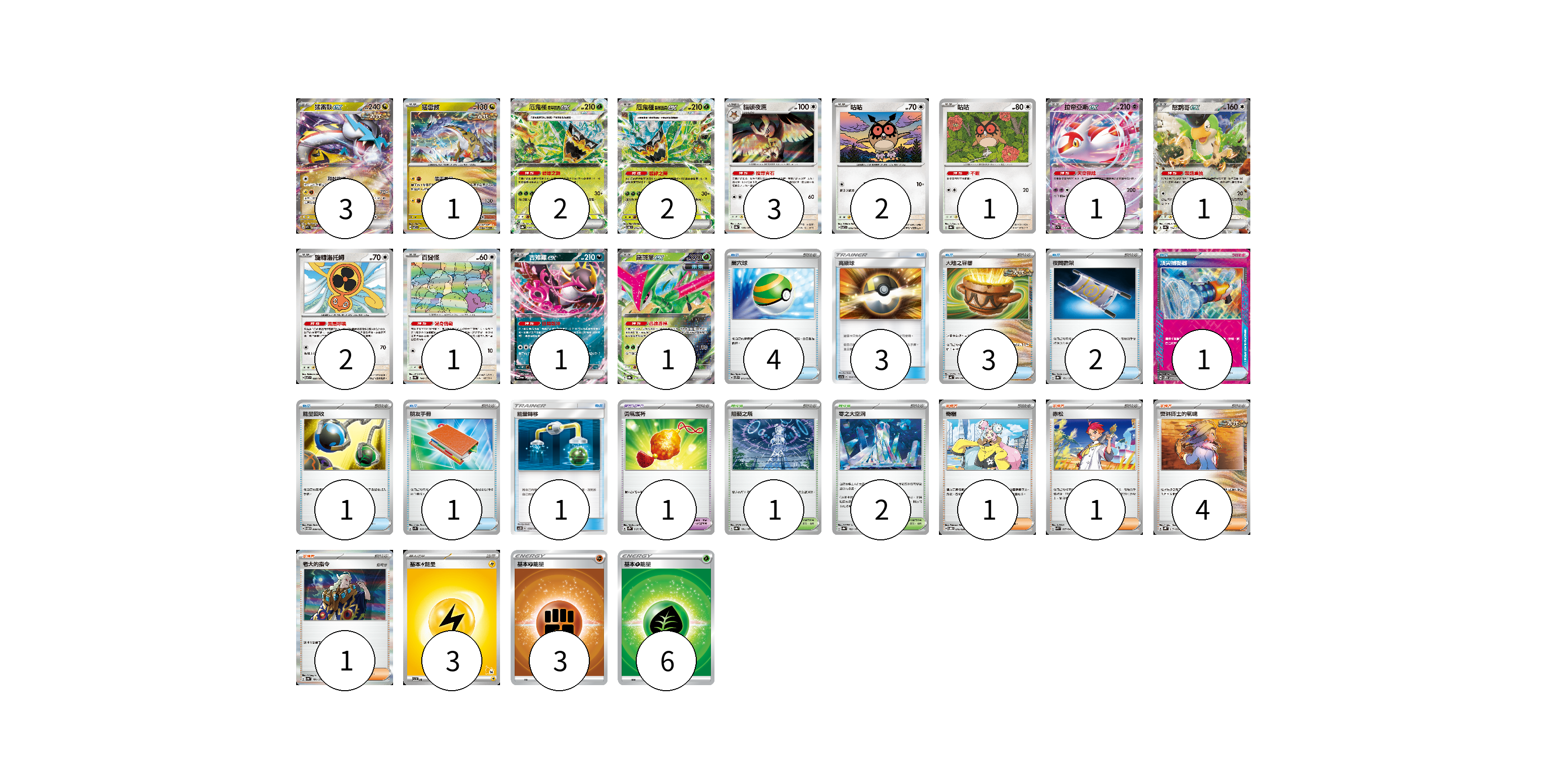 牌組構築方案 以此牌組為基礎新構築牌組 顯示卡面 顯示列表 寶可夢卡(21) 3 1 2 2 3 2 1 1 1 2 1 1 1 寶可夢道具(1) 1 物品卡(16) 4 3 3 2 1 1 1 1 支援者卡(7) 1 1 4 1 競技場卡(3) 1 2 能量卡(12) 3 3 6 寶可夢卡(21) 卡牌名稱 張數 卡牌名稱 張數 猛雷鼓ex SV5K 053/071 03 猛雷鼓 SV7 075/102 01 厄鬼椪 碧草面具ex SV8a 020/187 02 厄鬼椪 碧草面具ex SV6 016/101 02 貓頭夜鷹 SV8a 128/187 03 咕咕 SV7 076/102 02 咕咕 SV8a 127/187 01 拉帝亞斯ex SV7a 019/064 01 怒鸚哥ex SV4a 154/190 01 旋轉洛托姆 SV7 080/102 02 百變怪 SV4a 144/190 01 吉雉雞ex SV6a 038/064 01 鐵斑葉ex SV8a 016/187 01 寶可夢道具(1) 卡牌名稱 張數 卡牌名稱 張數 勇氣護符 SV2D 067/071 01 物品卡(16) 卡牌名稱 張數 卡牌名稱 張數 巢穴球 SVTS 013/022 04 高級球 AC1a 132/158 03 大地之容器 SV4K 060/066 03 夜間擔架 SV8a 151/187 02 頂尖捕捉器 SV5M 062/071 01 能量回收 SVTM 009/022 01 朋友手冊 SV1S 069/078 01 能量轉移 AC2D 139/176 01 支援者卡(7) 卡牌名稱 張數 卡牌名稱 張數 奇樹 SVOD 016/020 01 赤松 SVK 027/042 01 奧琳博士的氣魄 SVHK 017/022 04 老大的指令 SV4a 181/190 01 競技場卡(3) 卡牌名稱 張數 卡牌名稱 張數 阻礙之塔 SV8a 181/187 01 零之大空洞 SV8a 182/187 02 能量卡(12) 卡牌名稱 張數 卡牌名稱 張數 基本【雷】能量 SVI LIG 03 基本【鬥】能量 SI FIG 03 基本【草】能量 SI GRA 06 以此牌組為基礎新構築牌組 牌組編碼 SJGOGU-AYXuVi-sRuzQU copy 列印牌組單 牌組編碼已複製 分享至SNS
