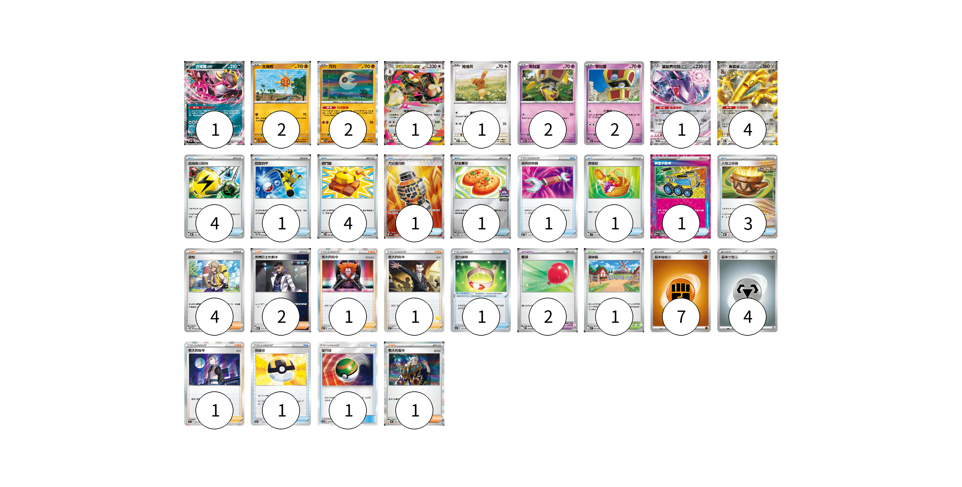 牌組構築方案 以此牌組為基礎新構築牌組 顯示卡面 顯示列表 寶可夢卡(16) 1 2 2 1 1 2 2 1 4 寶可夢道具(3) 1 2 物品卡(19) 4 1 4 1 1 1 1 1 3 1 1 支援者卡(10) 4 2 1 1 1 1 競技場卡(1) 1 能量卡(11) 7 4 寶可夢卡(16) 卡牌名稱 張數 卡牌名稱 張數 吉雉雞ex SV8a 104/187 01 太陽岩 M1L 027/063 02 月石 M1L 026/063 02 超級長耳兔ex M2 072/080 01 捲捲耳 M2 071/080 01 索財靈 SV8a 073/187 02 索財靈 SV7a 024/064 02 蓋諾賽克特ex SV11B 069/086 01 賽富豪ex SV8a 117/187 04 寶可夢道具(3) 卡牌名稱 張數 卡牌名稱 張數 活力頭帶 SC1a 143/154 01 氣球 MBD 018/022 02 物品卡(19) 卡牌名稱 張數 卡牌名稱 張數 超級能量回收 SV8a 141/187 04 厲害釣竿 SVOD 010/020 01 戰鬥鑼 M1L 059/063 04 力量蛋白飲 M1L 081/063 01 好友寶芬 SV-P 230/SV-P 01 道具拆除器 S8b 138/184 01 野餐籃 SV1V 071/078 01 貴重手推車 SVK 020/042 01 大地之容器 SV8a 143/187 03 高級球 S12a 138/172 01 巢穴球 AC2D 146/176 01 支援者卡(10) 卡牌名稱 張數 卡牌名稱 張數 派帕 SVOD 018/020 04 弗圖博士的劇本 SV8a 175/187 02 老大的指令(弗拉達利) S8b 158/184 01 老大的指令(坂木) SH 051/053 01 老大的指令(赤日) S9 097/100 01 老大的指令 SV4a 181/190 01 競技場卡(1) 卡牌名稱 張數 卡牌名稱 張數 深缽鎮 SVK 039/042 01 能量卡(11) 卡牌名稱 張數 卡牌名稱 張數 基本鬥能量 sv-p FIG 07 基本鋼能量 sv-p MET 04 以此牌組為基礎新構築牌組 牌組編碼 SJaqFD-fMUDWD-gOGXPk copy 列印牌組單 牌組編碼已複製 分享至SNS