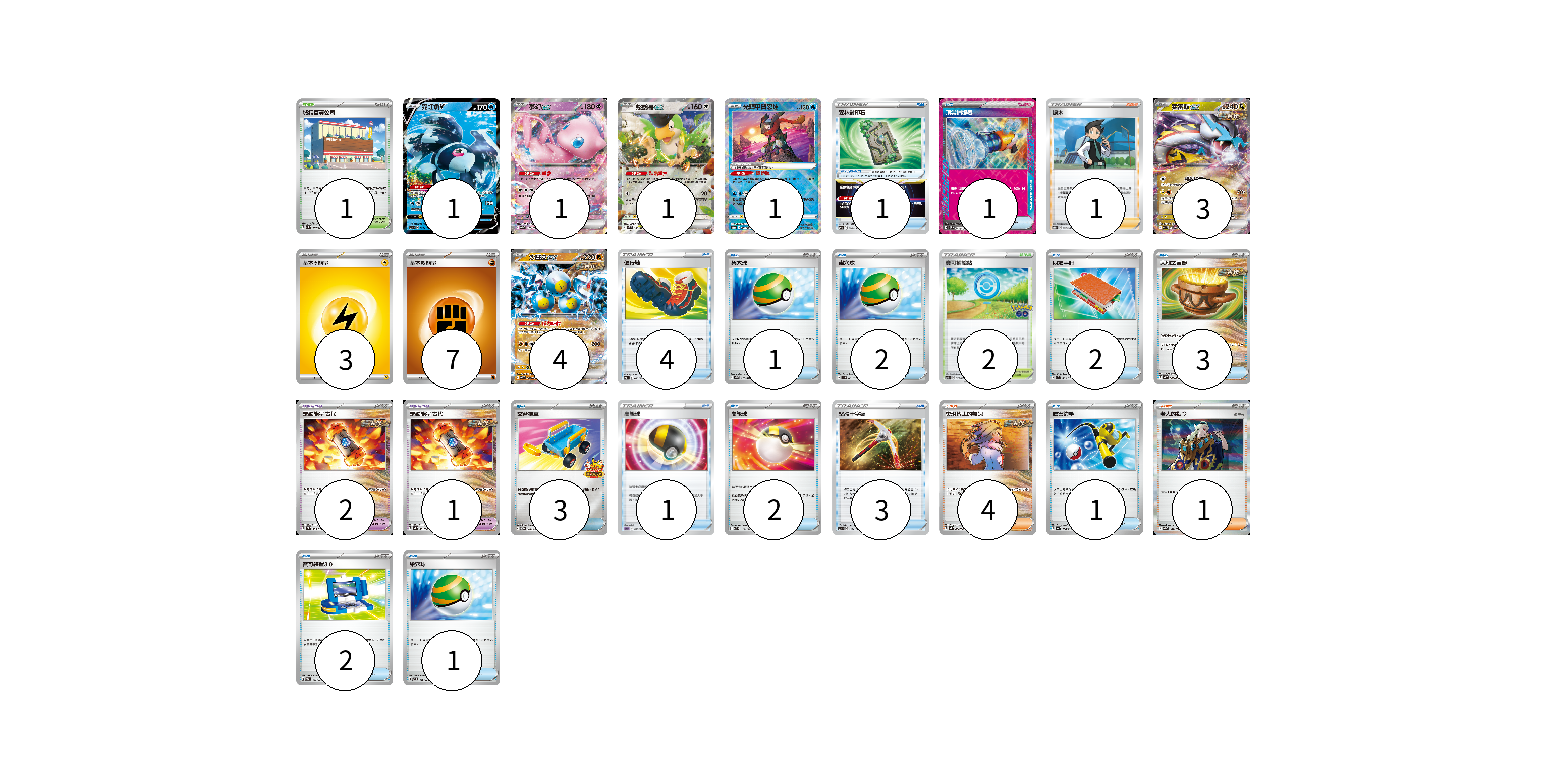 牌組構築方案 以此牌組為基礎新構築牌組 顯示卡面 顯示列表 寶可夢卡(11) 1 1 1 1 3 4 寶可夢道具(3) 2 1 物品卡(27) 1 1 4 1 2 2 3 3 1 2 3 1 2 1 支援者卡(6) 1 4 1 競技場卡(3) 1 2 能量卡(10) 3 7 寶可夢卡(11) 卡牌名稱 張數 卡牌名稱 張數 霓虹魚V S12a 026/172 01 夢幻ex SV4a 076/190 01 怒鸚哥ex SV2P 065/071 01 光輝甲賀忍蛙 S12a 033/172 01 猛雷鼓ex SV5K 053/071 03 沙鐵皮ex SV4K 042/066 04 寶可夢道具(3) 卡牌名稱 張數 卡牌名稱 張數 驅勁能量 古代 SV5K 065/071 02 驅勁能量 古代 SV4K 061/066 01 物品卡(27) 卡牌名稱 張數 卡牌名稱 張數 森林封印石 SVF 024/038 01 頂尖捕捉器 SV5M 062/071 01 健行鞋 SVF 015/038 04 巢穴球 SV1S 070/078 01 巢穴球 SVB 001/028 02 朋友手冊 SV1S 069/078 02 大地之容器 SV4K 060/066 03 交替推車 SV-P 082/SV-P 03 高級球 SDM 015/022 01 高級球 SVD 119/139 02 堅毅十字鎬 S12a 133/172 03 厲害釣竿 SV4a 158/190 01 寶可裝置3.0 SVAM 017/023 02 巢穴球 SVF 016/038 01 支援者卡(6) 卡牌名稱 張數 卡牌名稱 張數 捩木 S11 097/100 01 奧琳博士的氣魄 SV4K 064/066 04 老大的指令 SV4a 181/190 01 競技場卡(3) 卡牌名稱 張數 卡牌名稱 張數 城鎮百貨公司 SV3 107/108 01 寶可補給站 S10b 071/071 02 能量卡(10) 卡牌名稱 張數 卡牌名稱 張數 基本【雷】能量 SVHM LIG 03 基本【鬥】能量 SVHK FIG 07 以此牌組為基礎新構築牌組 牌組編碼 SJgfes-hYgtSa-dAYuva copy 列印牌組單 牌組編碼已複製 分享至SNS