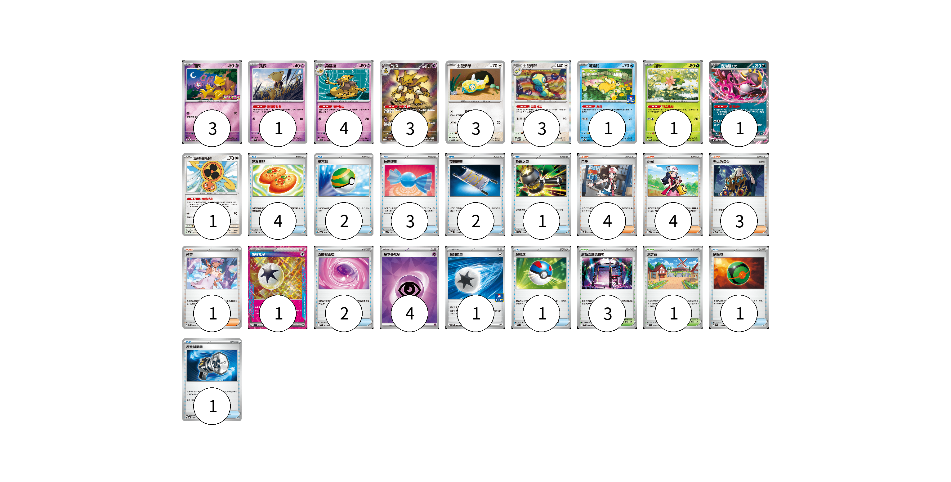 牌組構築方案 以此牌組為基礎新構築牌組 顯示卡面 顯示列表 寶可夢卡(21) 3 1 4 3 3 3 1 1 1 1 物品卡(17) 4 2 3 2 1 2 1 1 1 支援者卡(12) 4 4 3 1 競技場卡(4) 3 1 能量卡(6) 1 4 1 寶可夢卡(21) 卡牌名稱 張數 卡牌名稱 張數 凱西 M-P 004/M-P 03 凱西 SV8a 057/187 01 勇基拉 M1S 037/063 04 胡地 M1S 071/063 03 土龍弟弟 SV9 078/100 03 土龍節節 SV8a 130/187 03 可達鴨 SV-P 220/SV-P 01 謝米 SV9a 006/063 01 吉雉雞ex SVOD 004/020 01 旋轉洛托姆 SV8a 131/187 01 物品卡(17) 卡牌名稱 張數 卡牌名稱 張數 好友寶芬 MBG 011/022 04 巢穴球 SVD 118/139 02 神奇糖果 SVK 019/042 03 夜間擔架 MBG 017/022 02 改造之錘 SV5a 054/066 01 奇跡修正檔 MBD 017/022 02 超級球 SVM 132/175 01 黑暗球 SV7a 054/064 01 反擊捕捉器 SV8a 139/187 01 支援者卡(12) 卡牌名稱 張數 卡牌名稱 張數 鬥子 SV11W 085/086 04 小光 M2 077/080 04 老大的指令 SVM 172/175 03 莉普 SVTS 021/022 01 競技場卡(4) 卡牌名稱 張數 卡牌名稱 張數 對戰圓形競技場 M2 079/080 03 深缽鎮 SV1a 070/073 01 能量卡(6) 卡牌名稱 張數 卡牌名稱 張數 富裕能量 SV7a 064/064 01 基本【超】能量 SVM PSY 04 噴射能量 SV-P 180/SV-P 01 以此牌組為基礎新構築牌組 牌組編碼 SKqZBp-NrMEtV-JYYQoX copy 列印牌組單 牌組編碼已複製 分享至SNS