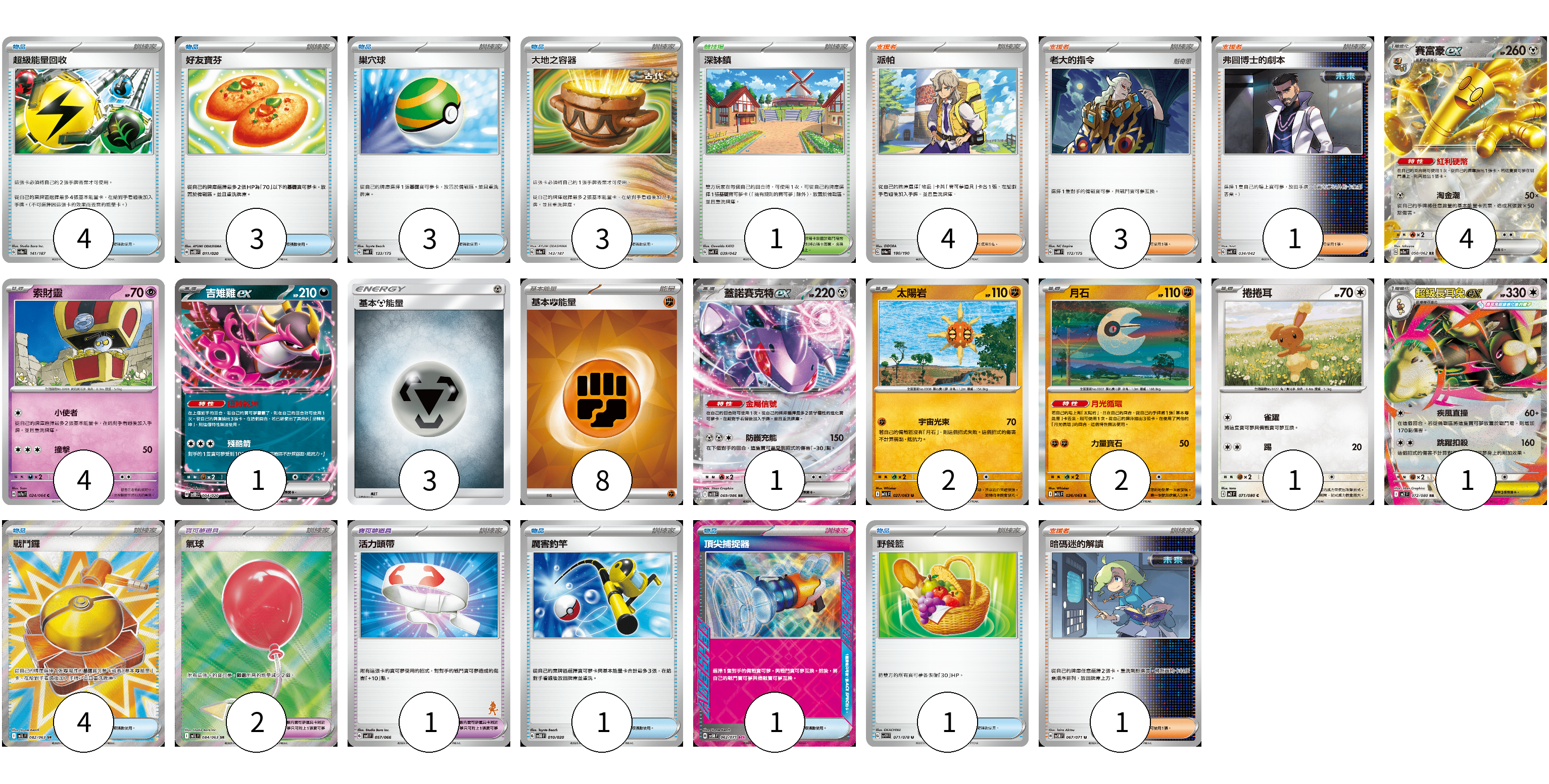 牌組構築方案 以此牌組為基礎新構築牌組 顯示卡面 顯示列表 寶可夢卡(16) 4 4 1 1 2 2 1 1 寶可夢道具(3) 2 1 物品卡(20) 4 3 3 3 4 1 1 1 支援者卡(9) 4 3 1 1 競技場卡(1) 1 能量卡(11) 3 8 寶可夢卡(16) 卡牌名稱 張數 卡牌名稱 張數 賽富豪ex SV3a 050/062 04 索財靈 SV7a 024/064 04 吉雉雞ex SVOD 004/020 01 蓋諾賽克特ex SV11B 069/086 01 太陽岩 M1L 027/063 02 月石 M1L 026/063 02 捲捲耳 M2 071/080 01 超級長耳兔ex M2 072/080 01 寶可夢道具(3) 卡牌名稱 張數 卡牌名稱 張數 氣球 M1L 084/063 02 活力頭帶 SVI 057/066 01 物品卡(20) 卡牌名稱 張數 卡牌名稱 張數 超級能量回收 SV8a 141/187 04 好友寶芬 SVOD 011/020 03 巢穴球 SVM 133/175 03 大地之容器 SV8a 143/187 03 戰鬥鑼 M1L 082/063 04 厲害釣竿 SVOD 010/020 01 頂尖捕捉器 SV5M 062/071 01 野餐籃 SV1V 071/078 01 支援者卡(9) 卡牌名稱 張數 卡牌名稱 張數 派帕 SV4a 180/190 04 老大的指令 SVM 172/175 03 弗圖博士的劇本 SVK 034/042 01 暗碼迷的解讀 SV5M 067/071 01 競技場卡(1) 卡牌名稱 張數 卡牌名稱 張數 深缽鎮 SVK 039/042 01 能量卡(11) 卡牌名稱 張數 卡牌名稱 張數 基本鋼能量 AS6D MET 03 基本【鬥】能量 SVK FIG 08 以此牌組為基礎新構築牌組 牌組編碼 SKxmIr-VeFchO-nzFTJZ copy 列印牌組單 牌組編碼已複製 分享至SNS