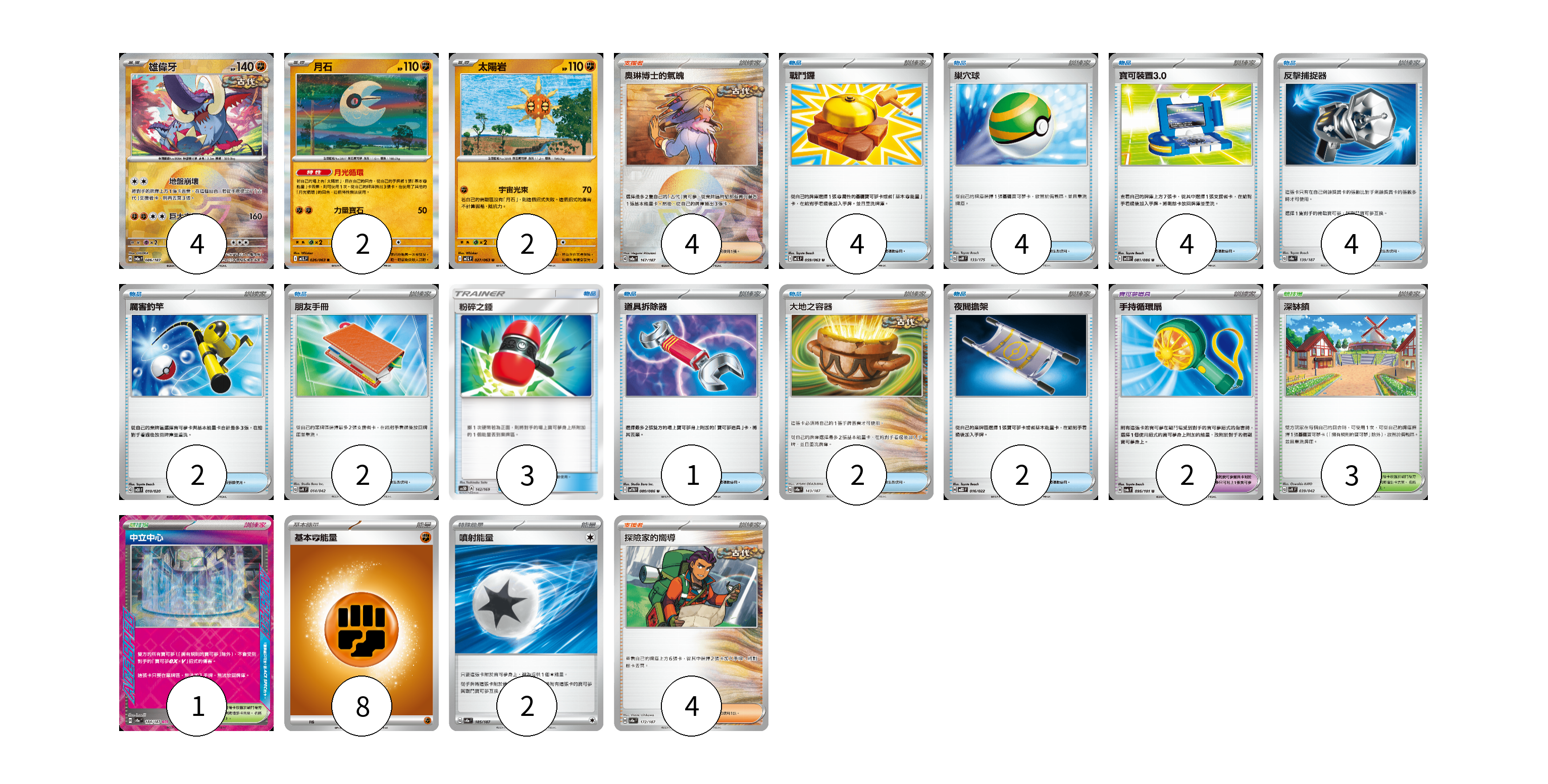 牌組構築方案 以此牌組為基礎新構築牌組 顯示卡面 顯示列表 寶可夢卡(8) 4 2 2 寶可夢道具(2) 2 物品卡(28) 4 4 4 4 2 2 3 1 2 2 支援者卡(8) 4 4 競技場卡(4) 3 1 能量卡(10) 8 2 寶可夢卡(8) 卡牌名稱 張數 卡牌名稱 張數 雄偉牙 SV8a 086/187 04 月石 M1L 026/063 02 太陽岩 M1L 027/063 02 寶可夢道具(2) 卡牌名稱 張數 卡牌名稱 張數 手持循環扇 SV6 095/101 02 物品卡(28) 卡牌名稱 張數 卡牌名稱 張數 戰鬥鑼 M1L 059/063 04 巢穴球 SVM 133/175 04 寶可裝置3.0 SV11B 081/086 04 反擊捕捉器 SV8a 139/187 04 厲害釣竿 SVOD 010/020 02 朋友手冊 SVK 014/042 02 粉碎之錘 AS5D 142/169 03 道具拆除器 SV11W 080/086 01 大地之容器 SV8a 143/187 02 夜間擔架 MBD 016/022 02 支援者卡(8) 卡牌名稱 張數 卡牌名稱 張數 奧琳博士的氣魄 SV8a 167/187 04 探險家的嚮導 SV8a 172/187 04 競技場卡(4) 卡牌名稱 張數 卡牌名稱 張數 深缽鎮 SVK 039/042 03 中立中心 SV8a 184/187 01 能量卡(10) 卡牌名稱 張數 卡牌名稱 張數 基本【鬥】能量 M-P FIG 08 噴射能量 SV8a 185/187 02 以此牌組為基礎新構築牌組 牌組編碼 SPElxM-FjePZk-mjobVD copy 列印牌組單 牌組編碼已複製 分享至SNS
