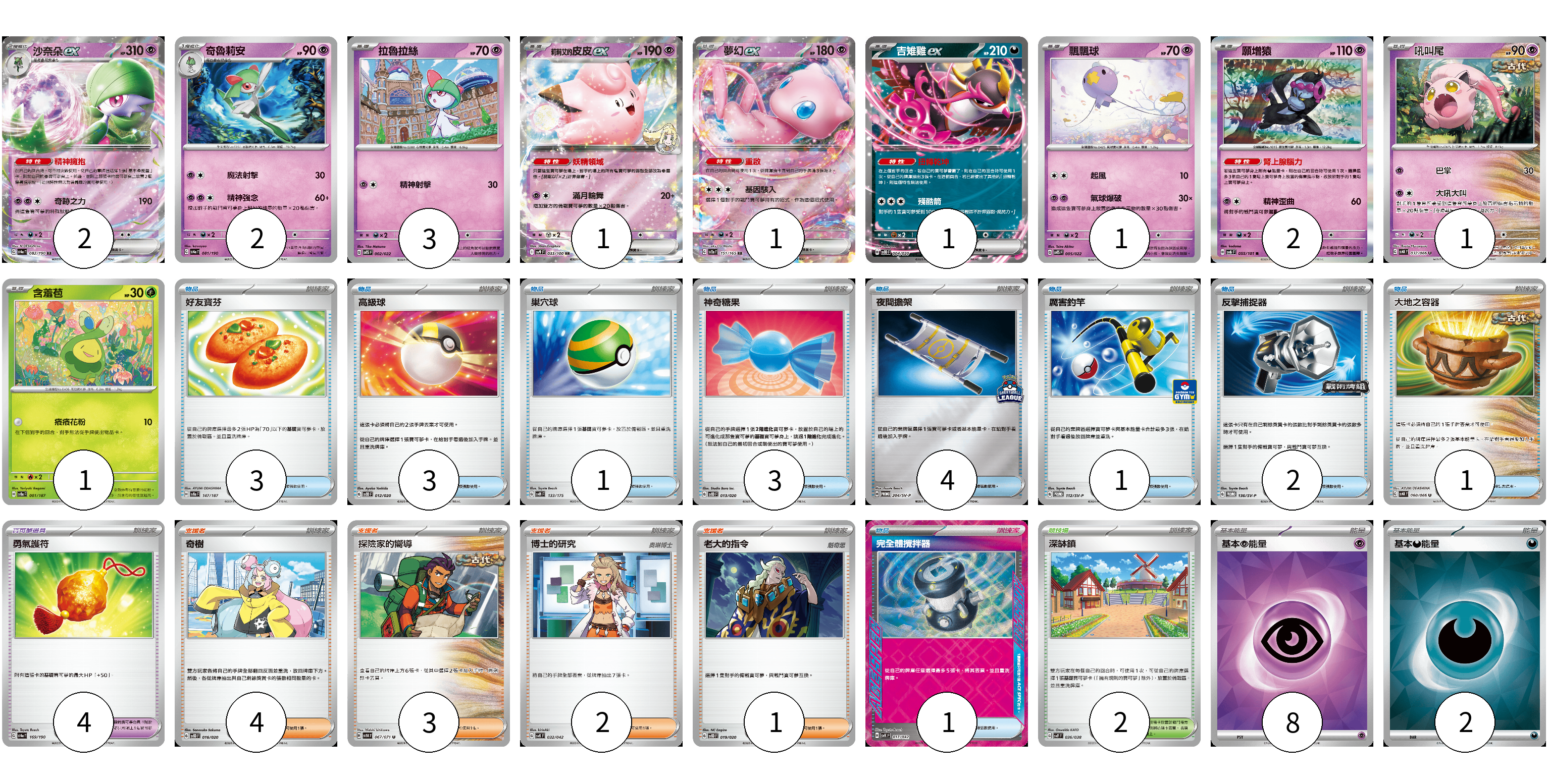 牌組構築方案 以此牌組為基礎新構築牌組 顯示卡面 顯示列表 寶可夢卡(15) 2 2 3 1 1 1 1 2 1 1 寶可夢道具(4) 4 物品卡(19) 3 3 1 3 4 1 2 1 1 支援者卡(10) 4 3 2 1 競技場卡(2) 2 能量卡(10) 8 2 寶可夢卡(15) 卡牌名稱 張數 卡牌名稱 張數 沙奈朵ex SV4a 082/190 02 奇魯莉安 SV4a 081/190 02 拉魯拉絲 SVTS 002/022 03 莉莉艾的皮皮ex SV9 033/100 01 夢幻ex SV2a 151/165 01 吉雉雞ex SVOD 004/020 01 飄飄球 SVTS 005/022 01 願增猿 SV6 055/101 02 吼叫尾 SV4K 032/066 01 含羞苞 SV8a 001/187 01 寶可夢道具(4) 卡牌名稱 張數 卡牌名稱 張數 勇氣護符 SV4a 169/190 04 物品卡(19) 卡牌名稱 張數 卡牌名稱 張數 好友寶芬 SV8a 147/187 03 高級球 SVOD 012/020 03 巢穴球 SVM 133/175 01 神奇糖果 SVOD 013/020 03 夜間擔架 SV-P 204/SV-P 04 厲害釣竿 SV-P 112/SV-P 01 反擊捕捉器 SV-P 136/SV-P 02 大地之容器 SV4K 060/066 01 完全體攪拌器 SVK 017/042 01 支援者卡(10) 卡牌名稱 張數 卡牌名稱 張數 奇樹 SVOD 016/020 04 探險家的嚮導 SV5K 067/071 03 博士的研究 SVK 032/042 02 老大的指令 SVOD 019/020 01 競技場卡(2) 卡牌名稱 張數 卡牌名稱 張數 深缽鎮 SVF 036/038 02 能量卡(10) 卡牌名稱 張數 卡牌名稱 張數 基本【超】能量 SVOD PSY 08 基本【惡】能量 SVOM DAR 02 以此牌組為基礎新構築牌組 牌組編碼 SPaoow-LMzoAU-MfPNjn copy 列印牌組單 牌組編碼已複製 分享至SNS