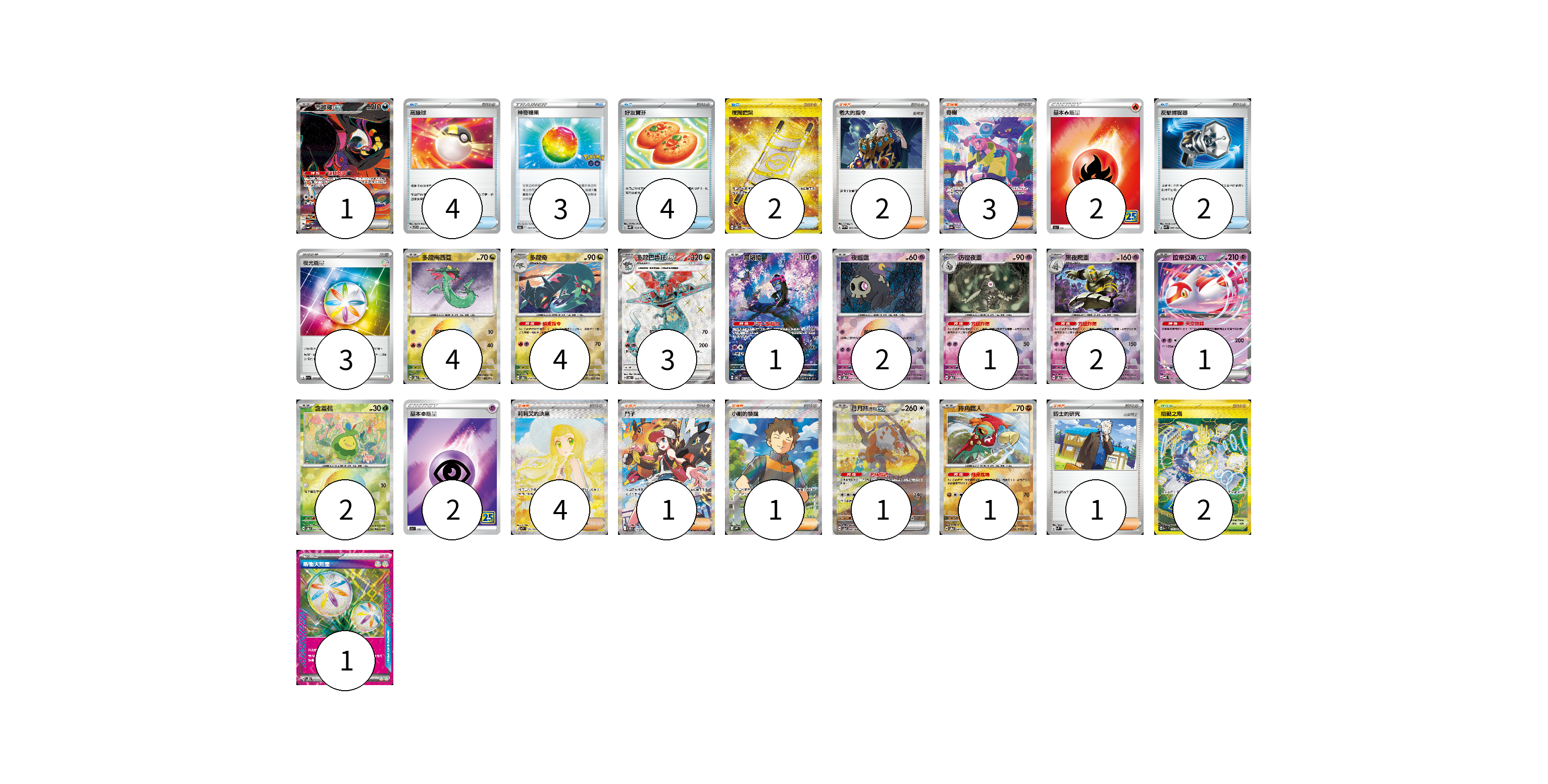 牌組構築方案 以此牌組為基礎新構築牌組 顯示卡面 顯示列表 寶可夢卡(23) 1 4 4 3 1 2 1 2 1 2 1 1 物品卡(15) 4 3 4 2 2 支援者卡(12) 2 3 4 1 1 1 競技場卡(2) 2 能量卡(8) 2 3 2 1 寶可夢卡(23) 卡牌名稱 張數 卡牌名稱 張數 吉雉雞ex SV6a 089/064 01 多龍梅西亞 SV8a 118/187 04 多龍奇 SV8a 119/187 04 多龍巴魯托ex SV6 120/101 03 願增猿 SV6 107/101 01 夜巡靈 SV8a 064/187 02 彷徨夜靈 SV8a 065/187 01 黑夜魔靈 SV8a 066/187 02 拉帝亞斯ex MBD 003/022 01 含羞苞 SV8a 001/187 02 月月熊 赫月 ex SV5a 091/066 01 摔角鷹人 SV8a 084/187 01 物品卡(15) 卡牌名稱 張數 卡牌名稱 張數 高級球 SVTR 014/021 04 神奇糖果 S10b 066/071 03 好友寶芬 SV5K 063/071 04 夜間擔架 SV8 137/106 02 反擊捕捉器 SVK 009/042 02 支援者卡(12) 卡牌名稱 張數 卡牌名稱 張數 老大的指令 SVHM 022/022 02 奇樹 SV4a 350/190 03 莉莉艾的決意 M1L 091/063 04 鬥子 SV11W 173/086 01 小剛的發掘 SV9 123/100 01 博士的研究 SVM 165/175 01 競技場卡(2) 卡牌名稱 張數 卡牌名稱 張數 阻礙之塔 SV10 132/098 02 能量卡(8) 卡牌名稱 張數 卡牌名稱 張數 基本火能量 S8a FIR 02 夜光能量 SV1a 073/073 03 基本超能量 S8a PSY 02 新衝天能量 SV5K 071/071 01 以此牌組為基礎新構築牌組 牌組編碼 SPiFcU-DZFVHq-MnpFHw copy 列印牌組單 牌組編碼已複製 分享至SNS