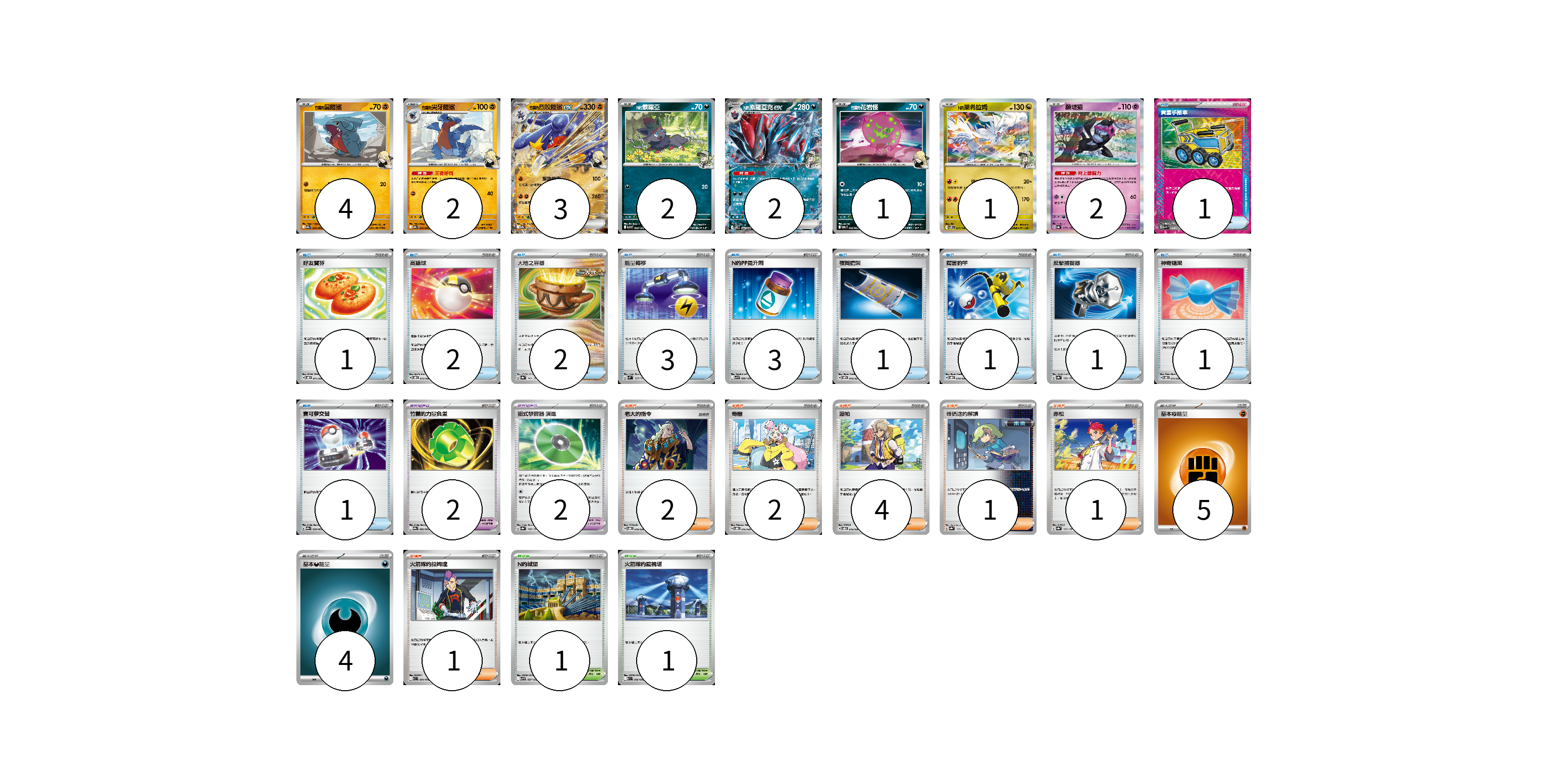 牌組構築方案 以此牌組為基礎新構築牌組 顯示卡面 顯示列表 寶可夢卡(17) 4 2 3 2 2 1 1 2 寶可夢道具(4) 2 2 物品卡(17) 1 1 2 2 3 3 1 1 1 1 1 支援者卡(11) 2 2 4 1 1 1 競技場卡(2) 1 1 能量卡(9) 5 4 寶可夢卡(17) 卡牌名稱 張數 卡牌名稱 張數 <竹蘭的>圓陸鯊 SV9a 042/063 04 <竹蘭的>尖牙陸鯊 SV9a 043/063 02 <竹蘭的>烈咬陸鯊ex SV9a 044/063 03 N的索羅亞 SV9 060/100 02 N的索羅亞克ex SV9 061/100 02 <竹蘭的>花岩怪 SV9a 050/063 01 N的萊希拉姆 SV9 074/100 01 願增猿 SV8a 075/187 02 寶可夢道具(4) 卡牌名稱 張數 卡牌名稱 張數 竹蘭的力量負重 SV9a 060/063 02 招式學習器 演進 SV8a 160/187 02 物品卡(17) 卡牌名稱 張數 卡牌名稱 張數 貴重手推車 SVK 020/042 01 好友寶芬 SVOD 011/020 01 高級球 SVOD 012/020 02 大地之容器 SV8a 143/187 02 能量轉移 SVM 127/175 03 N的PP提升劑 SV9 089/100 03 夜間擔架 SVOM 016/021 01 厲害釣竿 SVOD 010/020 01 反擊捕捉器 SV8a 139/187 01 神奇糖果 SVOD 013/020 01 寶可夢交替 SV9a 058/063 01 支援者卡(11) 卡牌名稱 張數 卡牌名稱 張數 老大的指令 SVOD 019/020 02 奇樹 SVOD 016/020 02 派帕 SVOD 018/020 04 暗碼迷的解讀 SV8a 165/187 01 赤松 SV8a 163/187 01 火箭隊的拉姆達 SV10 094/098 01 競技場卡(2) 卡牌名稱 張數 卡牌名稱 張數 N的城堡 SV9 097/100 01 火箭隊的監視塔 SV10 096/098 01 能量卡(9) 卡牌名稱 張數 卡牌名稱 張數 基本鬥能量 sv-p FIG 05 基本惡能量 sv-p DAR 04 以此牌組為基礎新構築牌組 牌組編碼 SRsMDw-wTQOqb-fDsETK copy 列印牌組單 牌組編碼已複製 分享至SNS