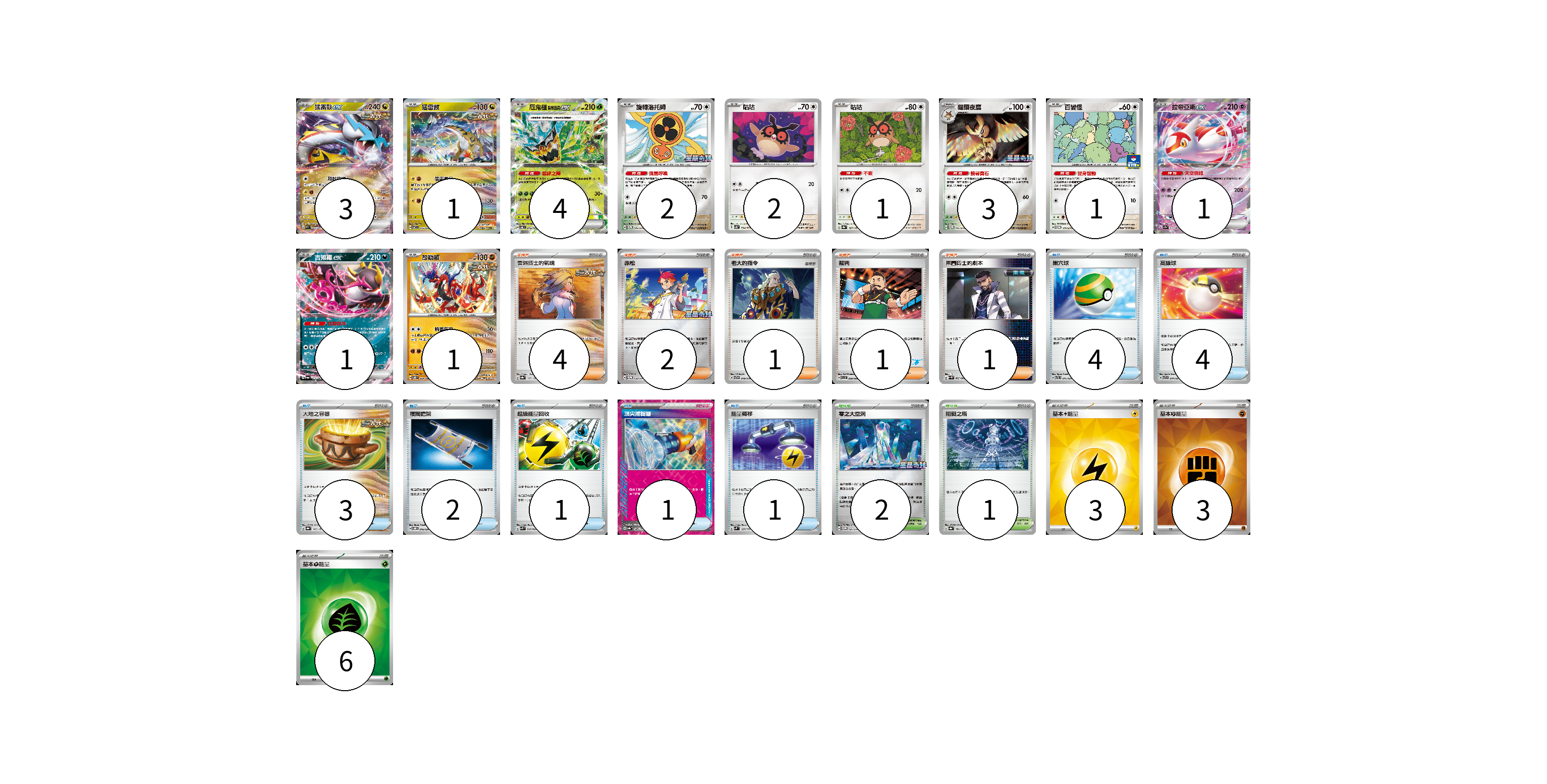 牌組構築方案 以此牌組為基礎新構築牌組 顯示卡面 顯示列表 寶可夢卡(20) 3 1 4 2 2 1 3 1 1 1 1 物品卡(16) 4 4 3 2 1 1 1 支援者卡(9) 4 2 1 1 1 競技場卡(3) 2 1 能量卡(12) 3 3 6 寶可夢卡(20) 卡牌名稱 張數 卡牌名稱 張數 猛雷鼓ex SV5K 053/071 03 猛雷鼓 SV7 075/102 01 厄鬼椪 碧草面具ex SV6 016/101 04 旋轉洛托姆 SV-P 146/SV-P 02 咕咕 SV5K 054/071 02 咕咕 SV8a 127/187 01 貓頭夜鷹 SV-P 145/SV-P 03 百變怪 SV-P 111/SV-P 01 拉帝亞斯ex SV7a 019/064 01 吉雉雞ex SV6a 038/064 01 故勒頓 SV8 069/106 01 物品卡(16) 卡牌名稱 張數 卡牌名稱 張數 巢穴球 SVTL 011/021 04 高級球 SVTR 014/021 04 大地之容器 SV8a 143/187 03 夜間擔架 SVOM 016/021 02 超級能量回收 SVK 010/042 01 頂尖捕捉器 SV8a 148/187 01 能量轉移 SVM 127/175 01 支援者卡(9) 卡牌名稱 張數 卡牌名稱 張數 奧琳博士的氣魄 SV8a 167/187 04 赤松 SV-P 150/SV-P 02 老大的指令 SVTG 019/019 01 裁判 SVI 059/066 01 弗圖博士的劇本 SV4M 065/066 01 競技場卡(3) 卡牌名稱 張數 卡牌名稱 張數 零之大空洞 SV-P 151/SV-P 02 阻礙之塔 SV8a 181/187 01 能量卡(12) 卡牌名稱 張數 卡牌名稱 張數 基本【雷】能量 SVK LIG 03 基本【鬥】能量 SVK FIG 03 基本【草】能量 SVK GRA 06 以此牌組為基礎新構築牌組 牌組編碼 SSCbWs-PPQqTZ-ZnEJwb copy 列印牌組單 牌組編碼已複製 分享至SNS