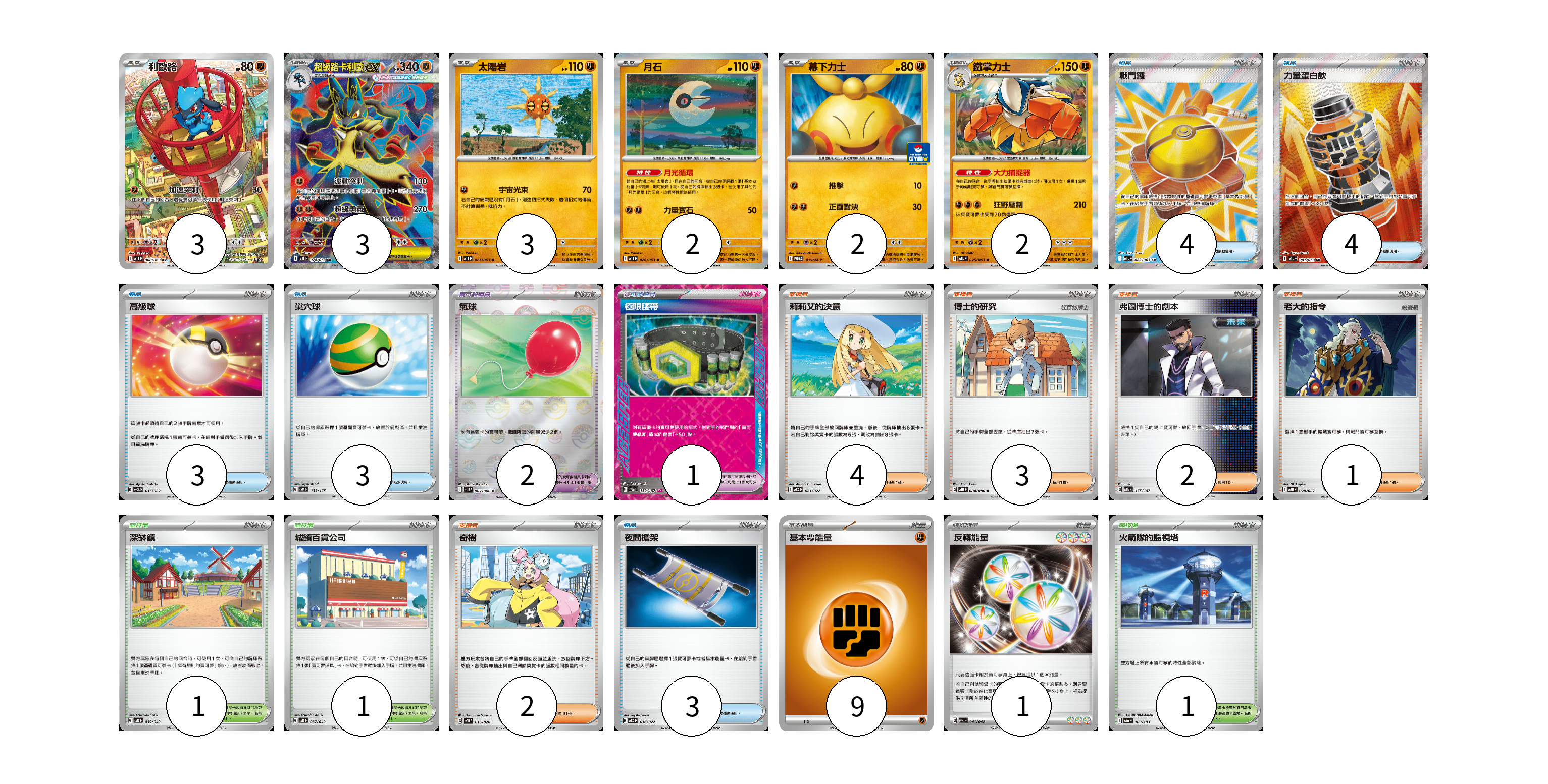 牌組構築方案 以此牌組為基礎新構築牌組 顯示卡面 顯示列表 寶可夢卡(15) 3 3 3 2 2 2 寶可夢道具(3) 2 1 物品卡(17) 4 4 3 3 3 支援者卡(12) 4 3 2 1 2 競技場卡(3) 1 1 1 能量卡(10) 9 1 寶可夢卡(15) 卡牌名稱 張數 卡牌名稱 張數 利歐路 M1L 068/063 03 超級路卡利歐ex M1L 078/063 03 太陽岩 M1L 027/063 03 月石 M1L 026/063 02 幕下力士 M-P 015/M-P 02 鐵掌力士 M1L 025/063 02 寶可夢道具(3) 卡牌名稱 張數 卡牌名稱 張數 氣球 SV11B 082/086 02 極限腰帶 SV8a 159/187 01 物品卡(17) 卡牌名稱 張數 卡牌名稱 張數 戰鬥鑼 M1L 082/063 04 力量蛋白飲 M1L 081/063 04 高級球 SVQL 015/022 03 巢穴球 SVM 133/175 03 夜間擔架 MBD 016/022 03 支援者卡(12) 卡牌名稱 張數 卡牌名稱 張數 莉莉艾的決意 MBD 021/022 04 博士的研究 SV11B 084/086 03 弗圖博士的劇本 SV8a 175/187 02 老大的指令 MBD 020/022 01 奇樹 SVOD 016/020 02 競技場卡(3) 卡牌名稱 張數 卡牌名稱 張數 深缽鎮 SVK 039/042 01 城鎮百貨公司 SVK 037/042 01 火箭隊的監視塔 M2a 189/193 01 能量卡(10) 卡牌名稱 張數 卡牌名稱 張數 基本鬥能量 sv-p FIG 09 反轉能量 SVK 041/042 01 以此牌組為基礎新構築牌組 牌組編碼 STuybN-jnyjOU-hWzFbG copy 列印牌組單 牌組編碼已複製 分享至SNS