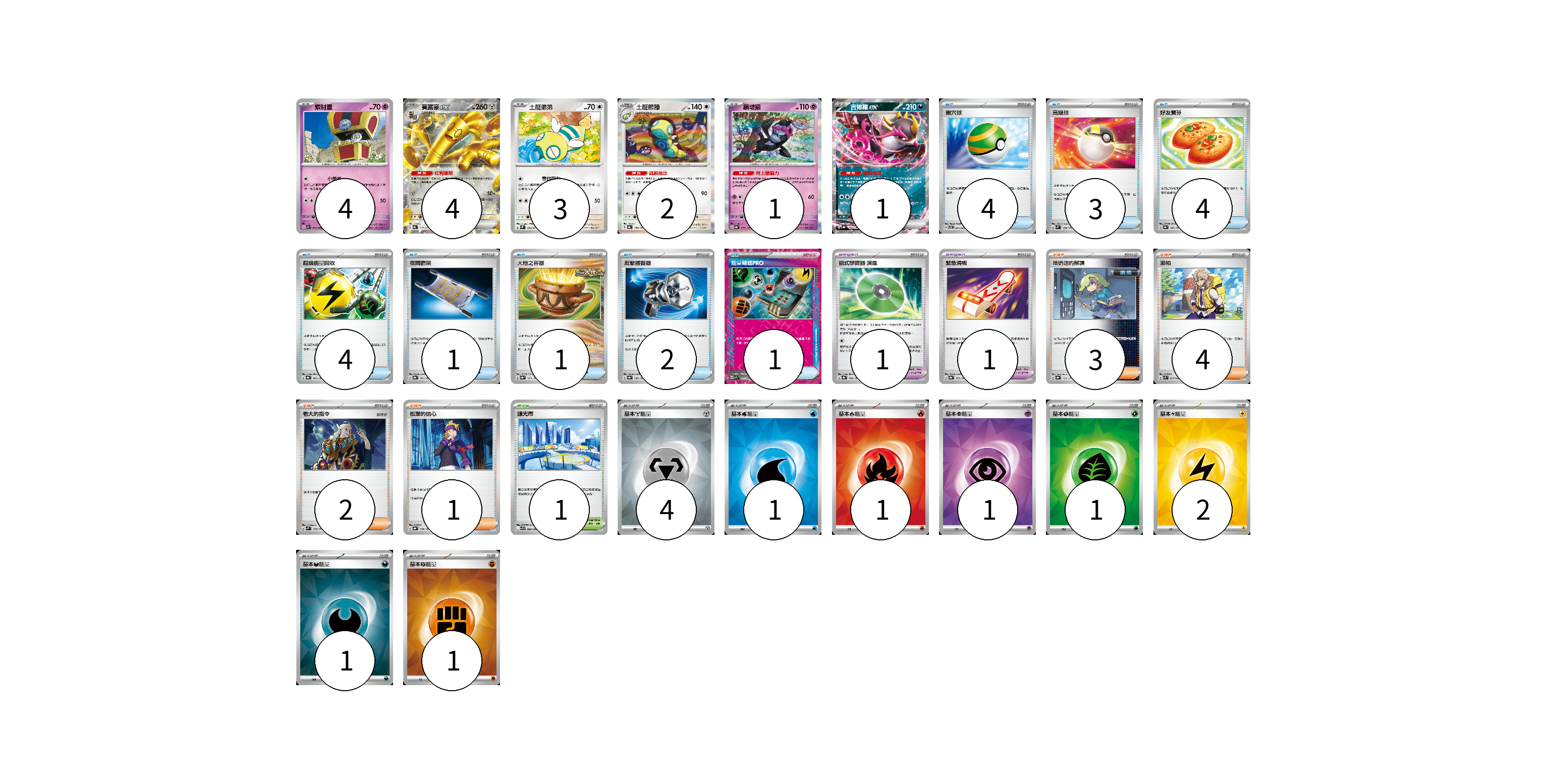 牌組構築方案 以此牌組為基礎新構築牌組 顯示卡面 顯示列表 寶可夢卡(15) 4 4 3 2 1 1 寶可夢道具(2) 1 1 物品卡(20) 4 3 4 4 1 1 2 1 支援者卡(10) 3 4 2 1 競技場卡(1) 1 能量卡(12) 4 1 1 1 1 2 1 1 寶可夢卡(15) 卡牌名稱 張數 卡牌名稱 張數 索財靈 SV7a 024/064 04 賽富豪ex SV8a 117/187 04 土龍弟弟 SV2P 056/071 03 土龍節節 SV8a 130/187 02 願增猿 SV8a 075/187 01 吉雉雞ex SV8a 104/187 01 寶可夢道具(2) 卡牌名稱 張數 卡牌名稱 張數 招式學習器 演進 SV8a 160/187 01 緊急滑板 SV8a 153/187 01 物品卡(20) 卡牌名稱 張數 卡牌名稱 張數 巢穴球 SVTL 011/021 04 高級球 SVM 134/175 03 好友寶芬 SV8a 147/187 04 超級能量回收 SV8a 141/187 04 夜間擔架 SV8a 151/187 01 大地之容器 SV8a 143/187 01 反擊捕捉器 SV8a 139/187 02 能量輸送PRO SV7a 052/064 01 支援者卡(10) 卡牌名稱 張數 卡牌名稱 張數 暗碼迷的解讀 SV8a 165/187 03 派帕 SVK 035/042 04 老大的指令 SVM 172/175 02 松葉的信心 SV8a 178/187 01 競技場卡(1) 卡牌名稱 張數 卡牌名稱 張數 釀光市 SV9 098/100 01 能量卡(12) 卡牌名稱 張數 卡牌名稱 張數 基本【鋼】能量 SVK MET 04 基本【水】能量 SVK WAT 01 基本【火】能量 SVK FIR 01 基本【超】能量 SVK PSY 01 基本【草】能量 SVK GRA 01 基本【雷】能量 SVK LIG 02 基本【惡】能量 SVK DAR 01 基本【鬥】能量 SVK FIG 01 以此牌組為基礎新構築牌組 牌組編碼 SVjhrN-vBckeq-jmvwxg copy 列印牌組單 牌組編碼已複製 分享至SNS