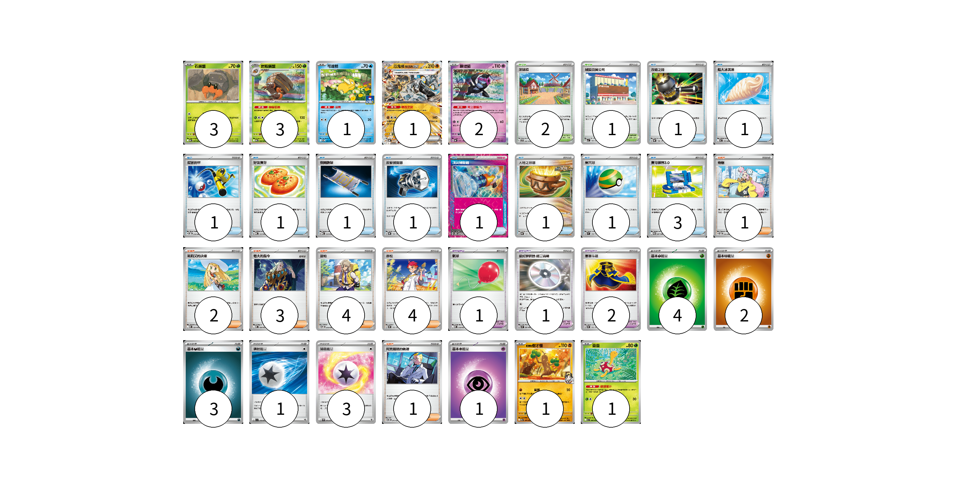 牌組構築方案 以此牌組為基礎新構築牌組 顯示卡面 顯示列表 寶可夢卡(12) 3 3 1 1 2 1 1 寶可夢道具(4) 1 1 2 物品卡(12) 1 1 1 1 1 1 1 1 1 3 支援者卡(15) 1 2 3 4 4 1 競技場卡(3) 2 1 能量卡(14) 4 2 3 1 3 1 寶可夢卡(12) 卡牌名稱 張數 卡牌名稱 張數 石居蟹 SV9a 007/063 03 岩殿居蟹 SV9a 008/063 03 可達鴨 SV-P 220/SV-P 01 厄鬼椪 礎石面具ex SV8a 091/187 01 願增猿 SV8a 075/187 02 <阿響的>樹才怪 SV9a 041/063 01 壺壺 M1S 006/063 01 寶可夢道具(4) 卡牌名稱 張數 卡牌名稱 張數 氣球 MBD 018/022 01 招式學習器 能量渦輪 SV3a 056/062 01 豪華斗篷 SV8a 155/187 02 物品卡(12) 卡牌名稱 張數 卡牌名稱 張數 改造之錘 SV8a 138/187 01 超大冰淇淋 M2 073/080 01 厲害釣竿 SVOD 010/020 01 好友寶芬 MBD 013/022 01 夜間擔架 MBD 016/022 01 反擊捕捉器 SV8a 139/187 01 頂尖捕捉器 SV5M 062/071 01 大地之容器 SV8a 143/187 01 巢穴球 SVM 133/175 01 寶可裝置3.0 SV11B 081/086 03 支援者卡(15) 卡牌名稱 張數 卡牌名稱 張數 奇樹 SVOD 016/020 01 莉莉艾的決意 MBD 021/022 02 老大的指令 MBD 020/022 03 派帕 SVOD 018/020 04 赤松 SV8a 163/187 04 阿克羅瑪的執著 SVOM 017/021 01 競技場卡(3) 卡牌名稱 張數 卡牌名稱 張數 深缽鎮 SVF 036/038 02 城鎮百貨公司 SV3 107/108 01 能量卡(14) 卡牌名稱 張數 卡牌名稱 張數 基本【草】能量 M-P GRA 04 基本【鬥】能量 M-P FIG 02 基本【惡】能量 M-P DAR 03 噴射能量 SV1a 072/073 01 薄霧能量 SV5M 071/071 03 基本【超】能量 M-P PSY 01 以此牌組為基礎新構築牌組 牌組編碼 SWJQUl-QBhlYI-hgNajy copy 列印牌組單 牌組編碼已複製 分享至SNS