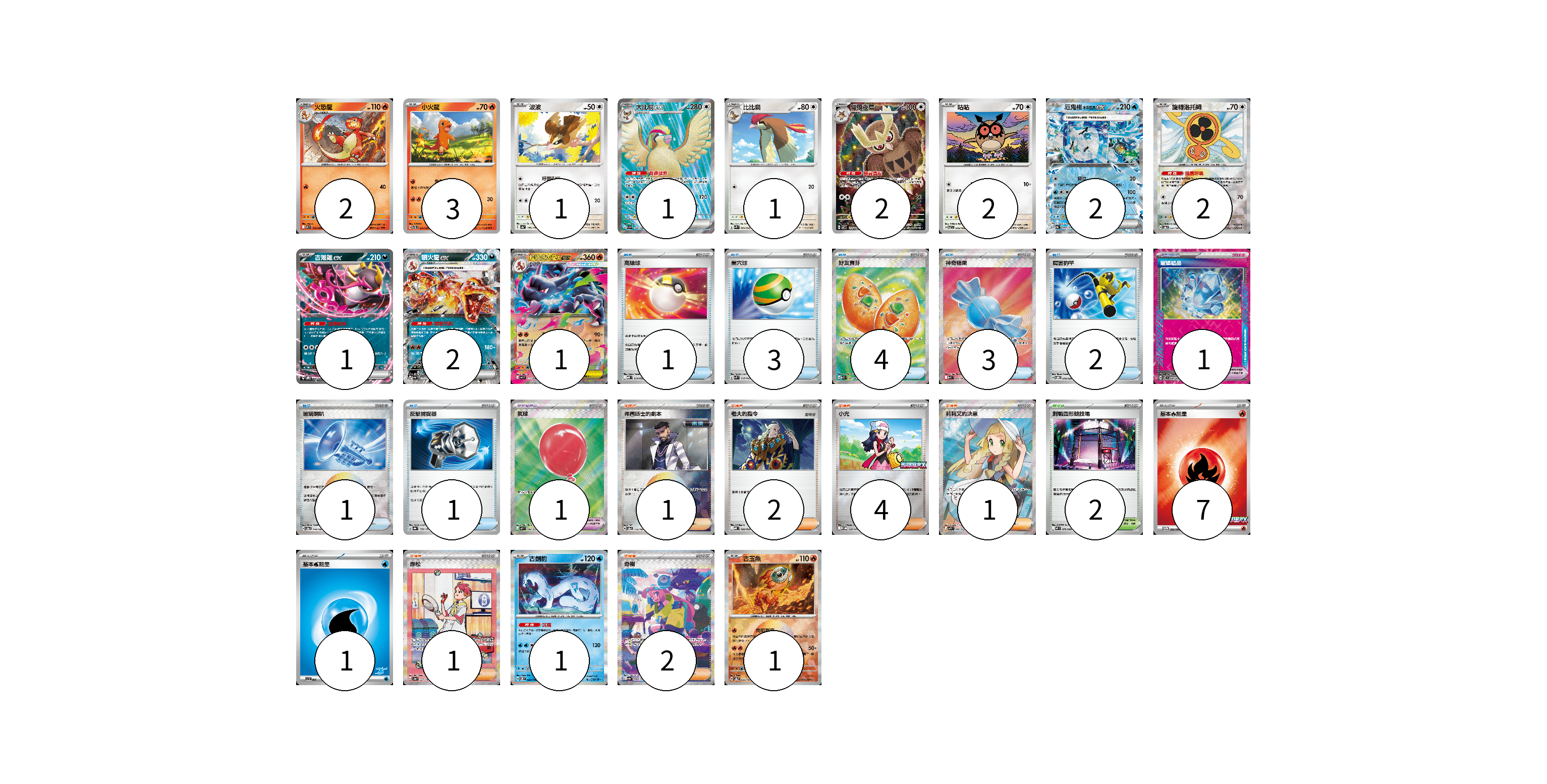 牌組構築方案 以此牌組為基礎新構築牌組 顯示卡面 顯示列表 寶可夢卡(22) 2 3 1 1 1 2 2 2 2 1 2 1 1 1 寶可夢道具(2) 1 1 物品卡(15) 1 3 4 3 2 1 1 支援者卡(11) 1 2 4 1 1 2 競技場卡(2) 2 能量卡(8) 7 1 寶可夢卡(22) 卡牌名稱 張數 卡牌名稱 張數 火恐龍 M2 012/080 02 小火龍 SVTL 001/021 03 波波 SV4a 137/190 01 大比鳥ex SV3 128/108 01 比比鳥 SVK 004/042 01 貓頭夜鷹 SV7 114/102 02 咕咕 SV7 076/102 02 厄鬼椪 水井面具ex SV8a 050/187 02 旋轉洛托姆 SV8a 131/187 02 吉雉雞ex SVOD 004/020 01 噴火龍ex SV4a 115/190 02 超級噴火龍Xex M2 013/080 01 古劍豹 SV8 032/106 01 古玉魚 SV8a 025/187 01 寶可夢道具(2) 卡牌名稱 張數 卡牌名稱 張數 璀璨結晶 SV7 094/102 01 氣球 M1L 084/063 01 物品卡(15) 卡牌名稱 張數 卡牌名稱 張數 高級球 MBD 014/022 01 巢穴球 SVK 016/042 03 好友寶芬 M1S 081/063 04 神奇糖果 M1S 082/063 03 厲害釣竿 SVOD 010/020 02 玻璃喇叭 SV8a 140/187 01 反擊捕捉器 SV8a 139/187 01 支援者卡(11) 卡牌名稱 張數 卡牌名稱 張數 弗圖博士的劇本 SV8a 175/187 01 老大的指令 MBD 020/022 02 小光 M-P 028/M-P 04 莉莉艾的決意 M1L 086/063 01 赤松 SV8a 227/187 01 奇樹 SV4a 350/190 02 競技場卡(2) 卡牌名稱 張數 卡牌名稱 張數 對戰圓形競技場 M2 079/080 02 能量卡(8) 卡牌名稱 張數 卡牌名稱 張數 基本【火】能量 M-P 032/M-P 07 基本【水】能量 SVI WAT 01 以此牌組為基礎新構築牌組 牌組編碼 SXOMnN-YKcGly-dbKyYb copy 列印牌組單 牌組編碼已複製 分享至SNS
