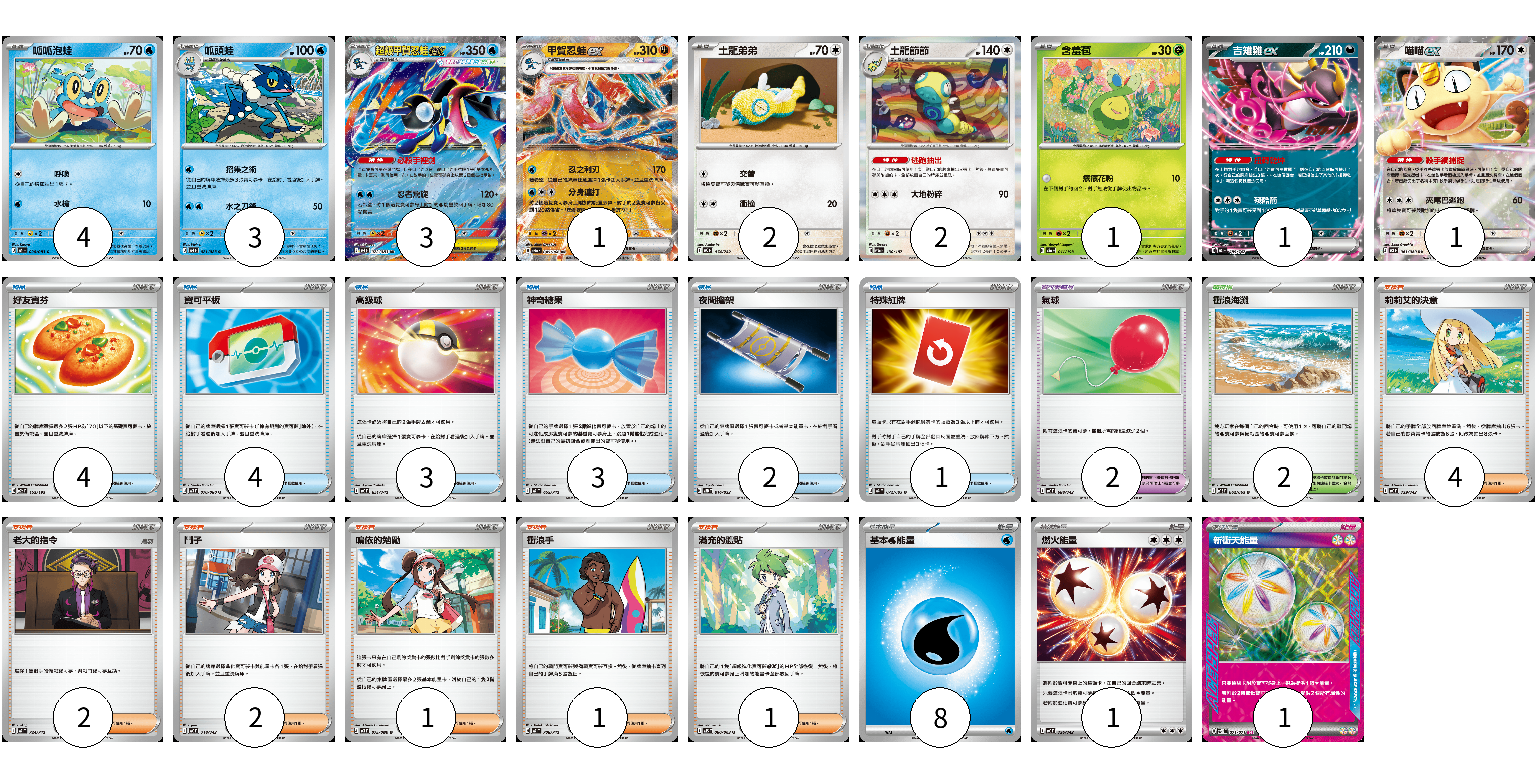牌組構築方案 以此牌組為基礎新構築牌組 顯示卡面 顯示列表 寶可夢卡(18) 4 3 3 1 2 2 1 1 1 寶可夢道具(2) 2 物品卡(17) 4 4 3 3 2 1 支援者卡(11) 4 2 2 1 1 1 競技場卡(2) 2 能量卡(10) 8 1 1 寶可夢卡(18) 卡牌名稱 張數 卡牌名稱 張數 呱呱泡蛙 M4 020/083 04 呱頭蛙 M4 021/083 03 超級甲賀忍蛙ex M4 022/083 03 甲賀忍蛙ex SV5a 045/066 01 土龍弟弟 MC 574/742 02 土龍節節 SV8a 130/187 02 含羞苞 M2a 011/193 01 吉雉雞ex MC 489/742 01 喵喵ex M3 061/080 01 寶可夢道具(2) 卡牌名稱 張數 卡牌名稱 張數 氣球 MC 688/742 02 物品卡(17) 卡牌名稱 張數 卡牌名稱 張數 好友寶芬 M2a 153/193 04 寶可平板 M3 070/080 04 高級球 MC 651/742 03 神奇糖果 MC 655/742 03 夜間擔架 MBD 016/022 02 特殊紅牌 M4 072/083 01 支援者卡(11) 卡牌名稱 張數 卡牌名稱 張數 莉莉艾的決意 MC 729/742 04 老大的指令 MC 724/742 02 鬥子 MC 718/742 02 鳴依的勉勵 M3 075/080 01 衝浪手 MC 708/742 01 滿充的體貼 M1S 060/063 01 競技場卡(2) 卡牌名稱 張數 卡牌名稱 張數 衝浪海灘 M1S 062/063 02 能量卡(10) 卡牌名稱 張數 卡牌名稱 張數 基本【水】能量 MC WAT 08 燃火能量 MC 736/742 01 新衝天能量 SV5K 071/071 01 以此牌組為基礎新構築牌組 牌組編碼 SYastg-TELJqF-spGvSl copy 列印牌組單 牌組編碼已複製 分享至SNS