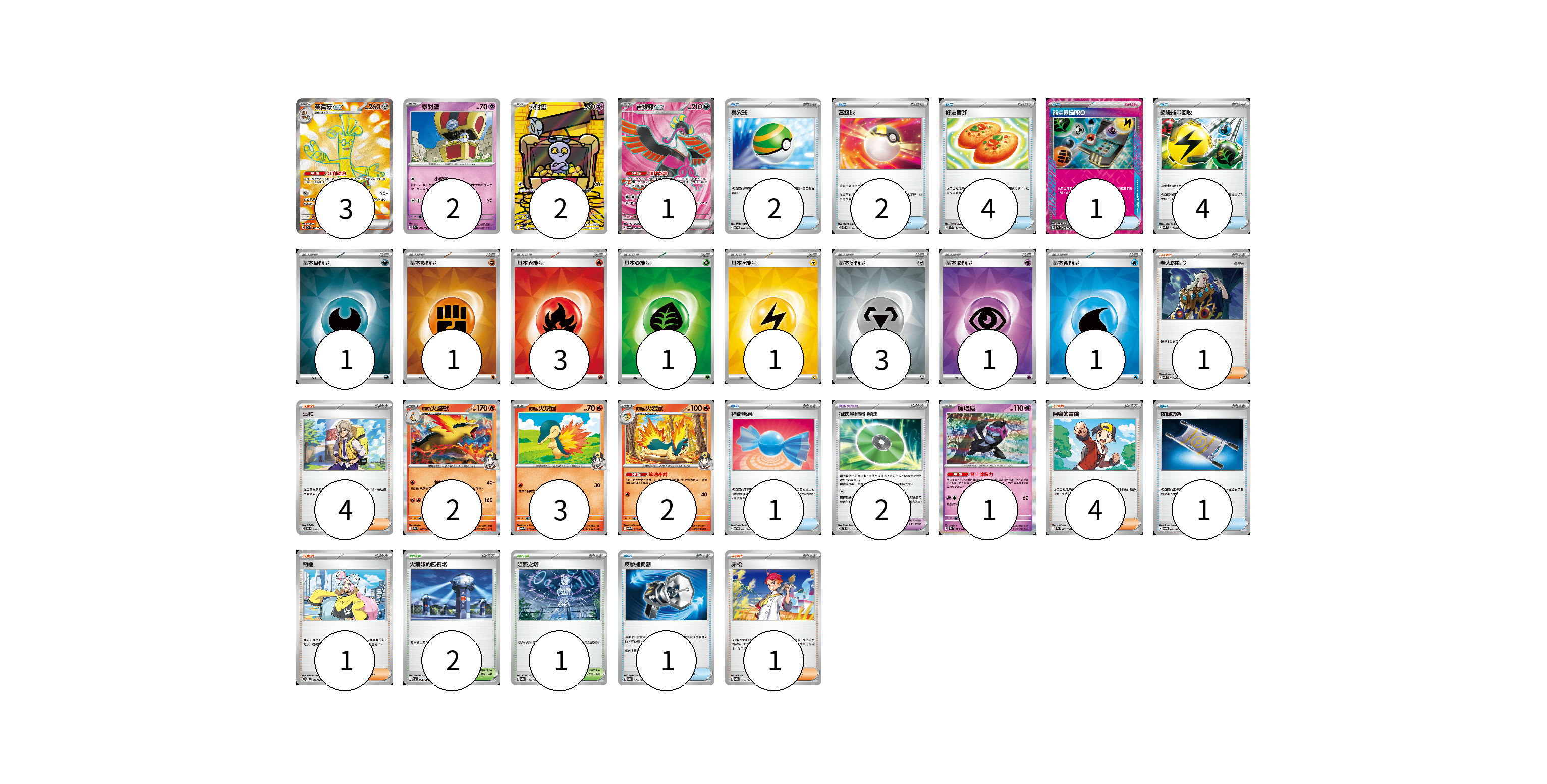 牌組構築方案 以此牌組為基礎新構築牌組 顯示卡面 顯示列表 寶可夢卡(16) 3 2 2 1 2 3 2 1 寶可夢道具(2) 2 物品卡(16) 2 2 4 1 4 1 1 1 支援者卡(11) 1 4 4 1 1 競技場卡(3) 2 1 能量卡(12) 1 1 3 1 1 3 1 1 寶可夢卡(16) 卡牌名稱 張數 卡牌名稱 張數 賽富豪ex SV3a 079/062 03 索財靈 SV7a 024/064 02 索財靈 SV3a 068/062 02 吉雉雞ex SV6a 081/064 01 <阿響的>火爆獸 SV9a 017/063 02 <阿響的>火球鼠 SV9a 015/063 03 <阿響的>火岩鼠 SV9a 016/063 02 願增猿 SV8a 075/187 01 寶可夢道具(2) 卡牌名稱 張數 卡牌名稱 張數 招式學習器 演進 SVTL 017/021 02 物品卡(16) 卡牌名稱 張數 卡牌名稱 張數 巢穴球 SVTG 012/019 02 高級球 SVTG 013/019 02 好友寶芬 SVK 015/042 04 能量輸送PRO SV7a 052/064 01 超級能量回收 SVK 010/042 04 神奇糖果 SVTG 014/019 01 夜間擔架 SVOM 016/021 01 反擊捕捉器 SV8a 139/187 01 支援者卡(11) 卡牌名稱 張數 卡牌名稱 張數 老大的指令 SVK 036/042 01 派帕 SVOD 018/020 04 阿響的冒險 SV9a 063/063 04 奇樹 SVOD 016/020 01 赤松 SV8a 163/187 01 競技場卡(3) 卡牌名稱 張數 卡牌名稱 張數 火箭隊的監視塔 SV10 096/098 02 阻礙之塔 SV8a 181/187 01 能量卡(12) 卡牌名稱 張數 卡牌名稱 張數 基本【惡】能量 SVK DAR 01 基本【鬥】能量 SVK FIG 01 基本【火】能量 SVK FIR 03 基本【草】能量 SVK GRA 01 基本【雷】能量 SVK LIG 01 基本【鋼】能量 SVK MET 03 基本【超】能量 SVK PSY 01 基本【水】能量 SVK WAT 01 以此牌組為基礎新構築牌組 牌組編碼 SYnJCV-tJSUQN-XtQyeV copy 列印牌組單 牌組編碼已複製 分享至SNS