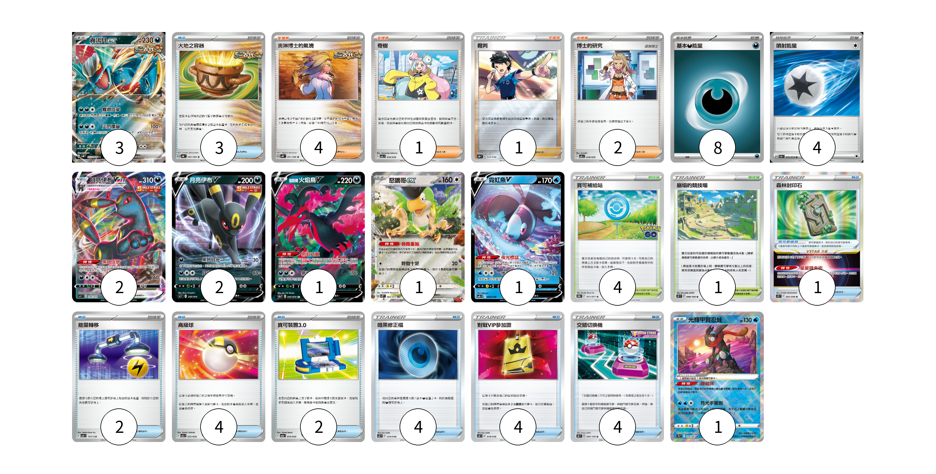 牌組構築方案 以此牌組為基礎新構築牌組 顯示卡面 顯示列表 寶可夢卡(11) 3 2 2 1 1 1 1 寶可夢道具(1) 1 物品卡(23) 3 2 4 2 4 4 4 支援者卡(8) 4 1 1 2 競技場卡(5) 4 1 能量卡(12) 8 4 寶可夢卡(11) 卡牌名稱 張數 卡牌名稱 張數 轟鳴月ex SV4K 054/066 03 月亮伊布VMAX SI 256/414 02 月亮伊布V SI 255/414 02 伽勒爾 火焰鳥V S5a 045/070 01 怒鸚哥ex SV2P 065/071 01 霓虹魚V SVB 008/028 01 光輝甲賀忍蛙 S9a 026/067 01 寶可夢道具(1) 卡牌名稱 張數 卡牌名稱 張數 森林封印石 S12 092/098 01 物品卡(23) 卡牌名稱 張數 卡牌名稱 張數 大地之容器 SV4K 060/066 03 能量轉移 SVD 111/139 02 高級球 SVEL 012/020 04 寶可裝置3.0 SVEM 014/020 02 暗黑修正檔 SVF 014/038 04 對戰VIP參加證 SVF 018/038 04 交錯切換機 S8 090/100 04 支援者卡(8) 卡牌名稱 張數 卡牌名稱 張數 奧琳博士的氣魄 SV4K 064/066 04 奇樹 SVEL 016/020 01 裁判 SO 024/030 01 博士的研究 SVEL 018/020 02 競技場卡(5) 卡牌名稱 張數 卡牌名稱 張數 寶可補給站 S10b 071/071 04 崩塌的競技場 S9 098/100 01 能量卡(12) 卡牌名稱 張數 卡牌名稱 張數 基本惡能量 sv-p DAR 08 噴射能量 SV1a 072/073 04 以此牌組為基礎新構築牌組 牌組編碼 Sdjtwt-kobvtf-Lmdait copy 列印牌組單 牌組編碼已複製 分享至SNS