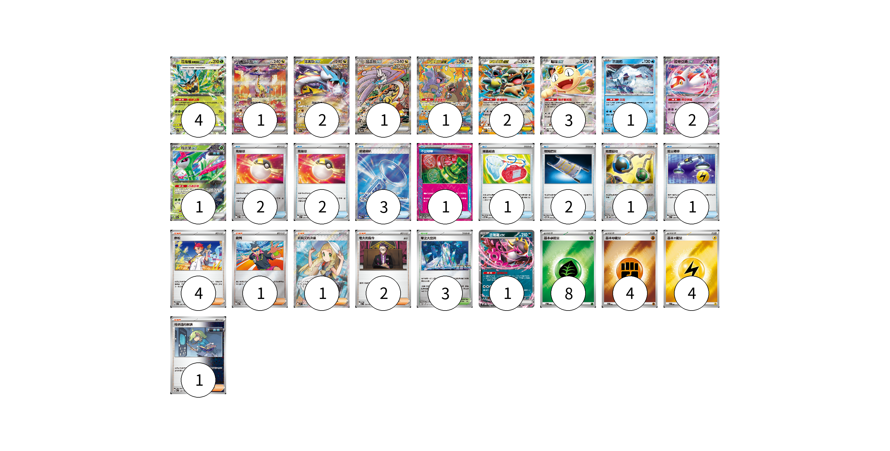 牌組構築方案 以此牌組為基礎新構築牌組 顯示卡面 顯示列表 寶可夢卡(19) 4 1 2 1 1 2 3 1 2 1 1 物品卡(13) 2 2 3 1 1 2 1 1 支援者卡(9) 4 1 1 2 1 競技場卡(3) 3 能量卡(16) 8 4 4 寶可夢卡(19) 卡牌名稱 張數 卡牌名稱 張數 厄鬼椪 碧草面具ex M2a 017/193 04 猛雷鼓ex SV5K 095/071 01 猛雷鼓ex SV5K 053/071 02 猛雷鼓ex SV8a 222/187 01 超級袋獸ex M1S 089/063 01 超級袋獸ex M1S 051/063 02 喵喵ex M3 061/080 03 古劍豹 M2a 043/193 01 拉帝亞斯ex M2a 075/193 02 鐵斑葉ex SV5M 016/071 01 吉雉雞ex SVOM 009/021 01 物品卡(13) 卡牌名稱 張數 卡牌名稱 張數 高級球 MC 651/742 02 高級球 MC 651/742 02 玻璃喇叭 M2a 215/193 03 不公印章 SV5a 053/066 01 捕蟲組合 SV6 094/101 01 夜間擔架 SVOM 016/021 02 能量回收 SV11W 079/086 01 能量轉移 MC 638/742 01 支援者卡(9) 卡牌名稱 張數 卡牌名稱 張數 赤松 MC 696/742 04 裁判 MC 711/742 01 莉莉艾的決意 M1L 086/063 01 老大的指令 MC 724/742 02 暗碼迷的解讀 MC 698/742 01 競技場卡(3) 卡牌名稱 張數 卡牌名稱 張數 零之大空洞 SV-P 151/SV-P 03 能量卡(16) 卡牌名稱 張數 卡牌名稱 張數 基本【草】能量 MC GRA 08 基本【鬥】能量 MC FIG 04 基本【雷】能量 MC LIG 04 以此牌組為基礎新構築牌組 牌組編碼 ShBBiU-AwzSIV-ugHxSi copy 列印牌組單 牌組編碼已複製 分享至SNS