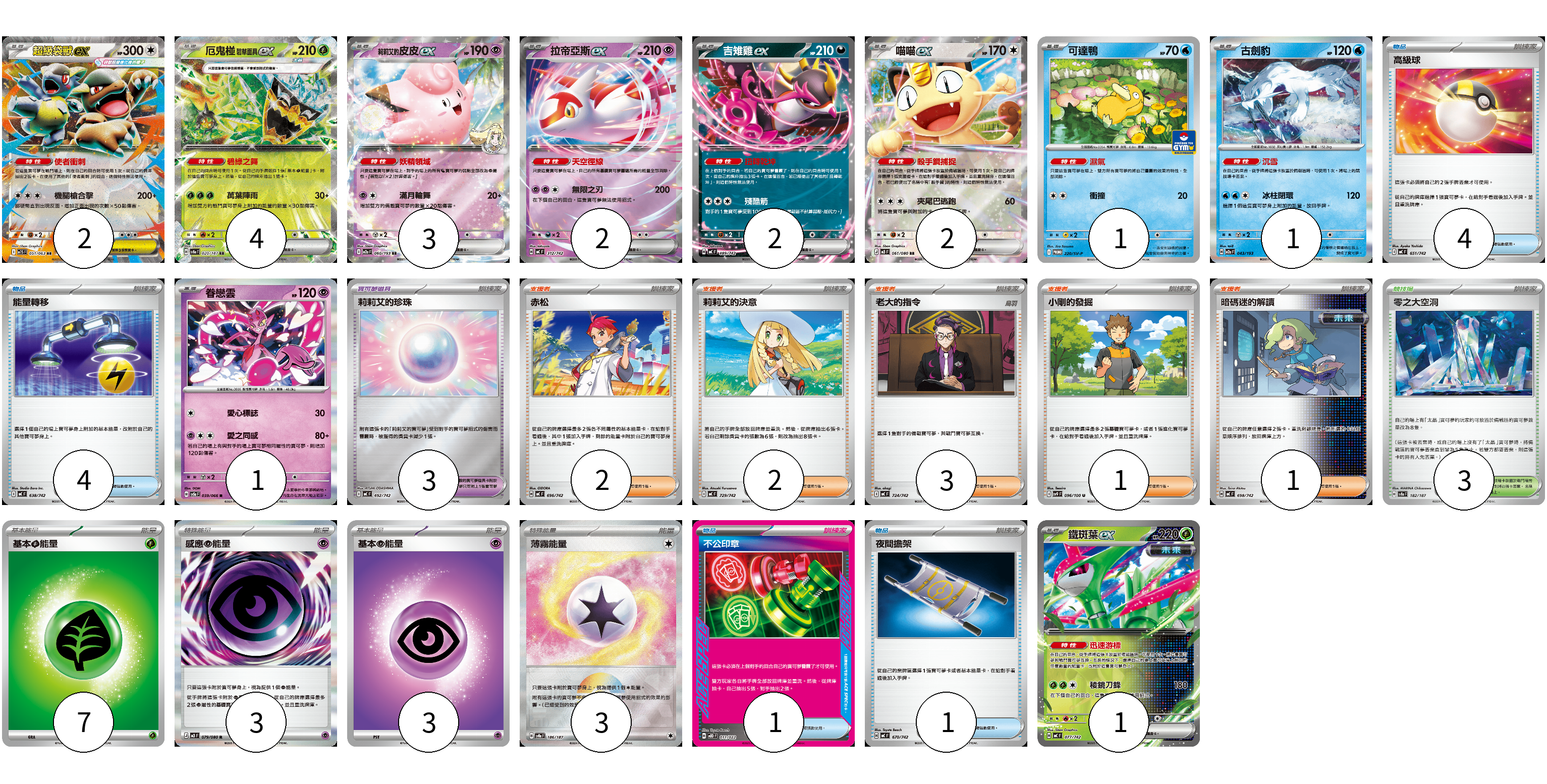 牌組構築方案 以此牌組為基礎新構築牌組 顯示卡面 顯示列表 寶可夢卡(19) 2 4 3 2 2 2 1 1 1 1 寶可夢道具(3) 3 物品卡(10) 4 4 1 1 支援者卡(9) 2 2 3 1 1 競技場卡(3) 3 能量卡(16) 7 3 3 3 寶可夢卡(19) 卡牌名稱 張數 卡牌名稱 張數 超級袋獸ex M1S 051/063 02 厄鬼椪 碧草面具ex SV8a 020/187 04 莉莉艾的皮皮ex M2a 060/193 03 拉帝亞斯ex MC 312/742 02 吉雉雞ex MC 489/742 02 喵喵ex M3 061/080 02 可達鴨 SV-P 220/SV-P 01 古劍豹 M2a 043/193 01 眷戀雲 SV5a 039/066 01 鐵斑葉ex MC 077/742 01 寶可夢道具(3) 卡牌名稱 張數 卡牌名稱 張數 莉莉艾的珍珠 MC 692/742 03 物品卡(10) 卡牌名稱 張數 卡牌名稱 張數 高級球 MC 651/742 04 能量轉移 MC 638/742 04 不公印章 MBD 011/022 01 夜間擔架 MC 670/742 01 支援者卡(9) 卡牌名稱 張數 卡牌名稱 張數 赤松 MC 696/742 02 莉莉艾的決意 MC 729/742 02 老大的指令 MC 724/742 03 小剛的發掘 SV9 096/100 01 暗碼迷的解讀 MC 698/742 01 競技場卡(3) 卡牌名稱 張數 卡牌名稱 張數 零之大空洞 SV8a 182/187 03 能量卡(16) 卡牌名稱 張數 卡牌名稱 張數 基本【草】能量 MJ GRA 07 感應【超】能量 M3 079/080 03 基本【超】能量 M-P PSY 03 薄霧能量 SV8a 186/187 03 以此牌組為基礎新構築牌組 牌組編碼 SnlCTi-hJyhMP-JWnFpz copy 列印牌組單 牌組編碼已複製 分享至SNS