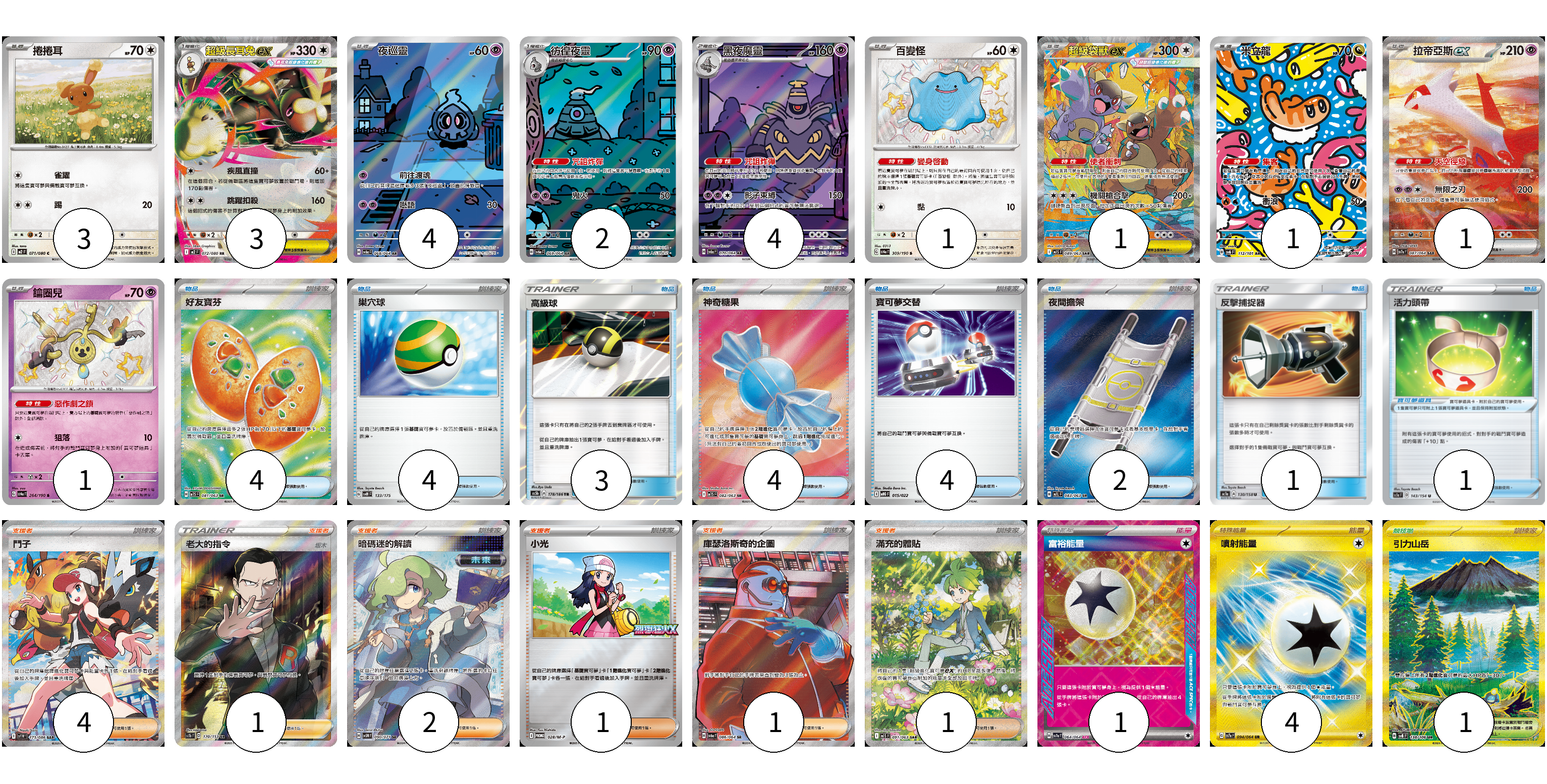 牌組構築方案 以此牌組為基礎新構築牌組 顯示卡面 顯示列表 寶可夢卡(21) 3 3 4 2 4 1 1 1 1 1 寶可夢道具(1) 1 物品卡(22) 4 4 3 4 4 2 1 支援者卡(10) 4 1 2 1 1 1 競技場卡(1) 1 能量卡(5) 1 4 寶可夢卡(21) 卡牌名稱 張數 卡牌名稱 張數 捲捲耳 M2 071/080 03 超級長耳兔ex M2 072/080 03 夜巡靈 SV6a 068/064 04 彷徨夜靈 SV6a 069/064 02 黑夜魔靈 SV6a 070/064 04 百變怪 SV4a 309/190 01 超級袋獸ex M1S 089/063 01 米立龍 SV6 112/101 01 拉帝亞斯ex SV7a 087/064 01 鑰圈兒 SV4a 264/190 01 寶可夢道具(1) 卡牌名稱 張數 卡牌名稱 張數 活力頭帶 SC1a 143/154 01 物品卡(22) 卡牌名稱 張數 卡牌名稱 張數 好友寶芬 M1S 081/063 04 巢穴球 SVM 133/175 04 高級球 AS5b 178/186 03 神奇糖果 M1S 082/063 04 寶可夢交替 MBG 015/022 04 夜間擔架 M1L 083/063 02 反擊捕捉器 AC1a 130/158 01 支援者卡(10) 卡牌名稱 張數 卡牌名稱 張數 鬥子 SV11W 173/086 04 老大的指令(坂木) SC1b 170/153 01 暗碼迷的解讀 SV5M 090/071 02 小光 M-P 028/M-P 01 庫瑟洛斯奇的企圖 SV6a 086/064 01 滿充的體貼 M1S 091/063 01 競技場卡(1) 卡牌名稱 張數 卡牌名稱 張數 引力山岳 SV8 138/106 01 能量卡(5) 卡牌名稱 張數 卡牌名稱 張數 富裕能量 SV7a 064/064 01 噴射能量 SV7a 094/064 04 以此牌組為基礎新構築牌組 牌組編碼 SoceXm-vSTPgo-oouLAg copy 列印牌組單 牌組編碼已複製 分享至SNS