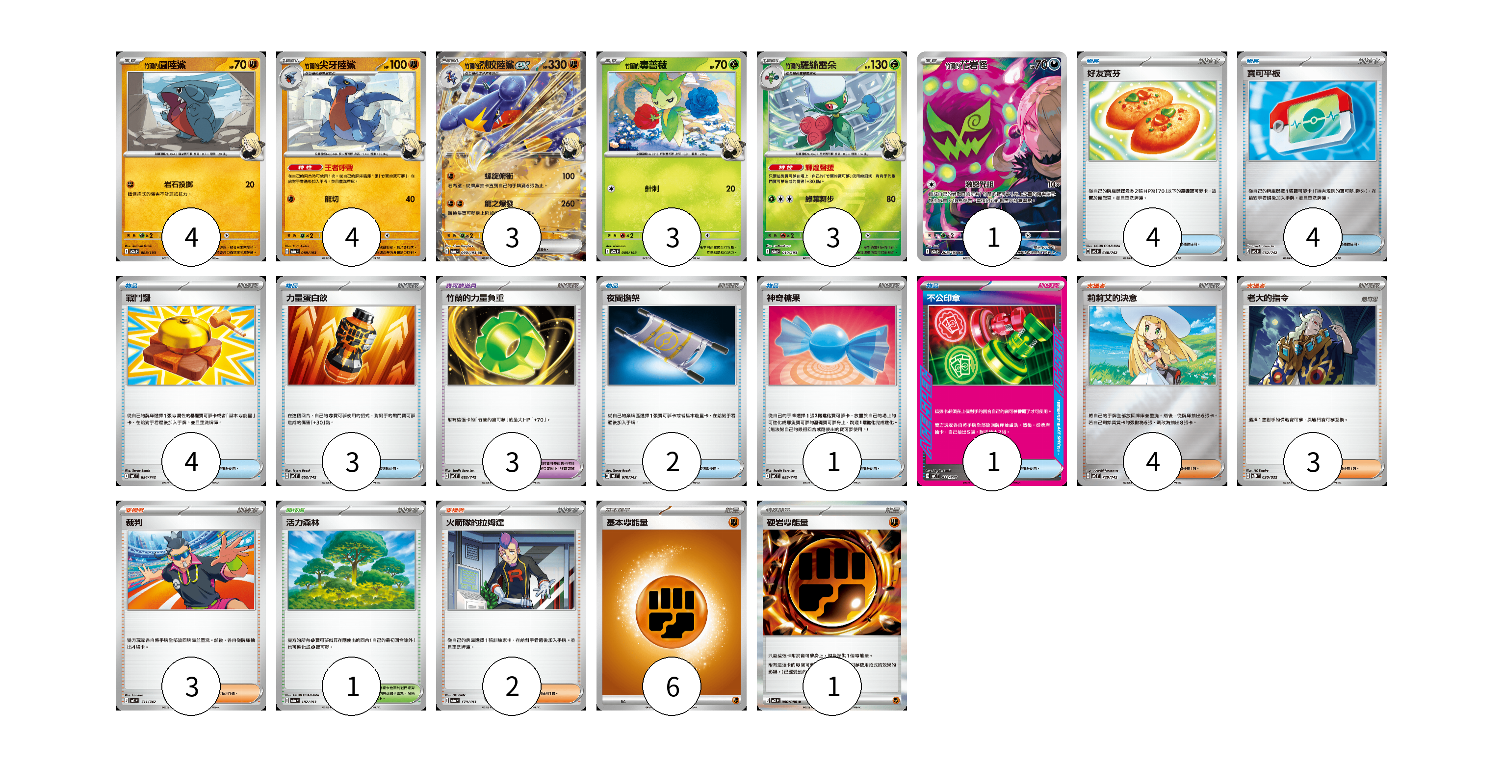 牌組構築方案 以此牌組為基礎新構築牌組 顯示卡面 顯示列表 寶可夢卡(18) 4 4 3 3 3 1 寶可夢道具(3) 3 物品卡(19) 4 4 4 3 2 1 1 支援者卡(12) 4 3 3 2 競技場卡(1) 1 能量卡(7) 6 1 寶可夢卡(18) 卡牌名稱 張數 卡牌名稱 張數 竹蘭的圓陸鯊 M2a 088/193 04 竹蘭的尖牙陸鯊 M2a 089/193 04 <竹蘭的>烈咬陸鯊ex M2a 090/193 03 竹蘭的毒薔薇 M2a 009/193 03 <竹蘭的>羅絲雷朵 M2a 010/193 03 <竹蘭的>花岩怪 M2a 208/193 01 寶可夢道具(3) 卡牌名稱 張數 卡牌名稱 張數 竹蘭的力量負重 MC 682/742 03 物品卡(19) 卡牌名稱 張數 卡牌名稱 張數 好友寶芬 MC 648/742 04 寶可平板 MC 662/742 04 戰鬥鑼 MC 654/742 04 力量蛋白飲 MC 652/742 03 夜間擔架 MC 670/742 02 神奇糖果 MC 655/742 01 不公印章 MC 633/742 01 支援者卡(12) 卡牌名稱 張數 卡牌名稱 張數 莉莉艾的決意 MC 729/742 04 老大的指令 MBD 020/022 03 裁判 MC 711/742 03 火箭隊的拉姆達 M2a 179/193 02 競技場卡(1) 卡牌名稱 張數 卡牌名稱 張數 活力森林 M2a 182/193 01 能量卡(7) 卡牌名稱 張數 卡牌名稱 張數 基本【鬥】能量 MC FIG 06 硬岩【鬥】能量 M3 080/080 01 以此牌組為基礎新構築牌組 牌組編碼 SrhFNk-TpfXrU-GdSznR copy 列印牌組單 牌組編碼已複製 分享至SNS