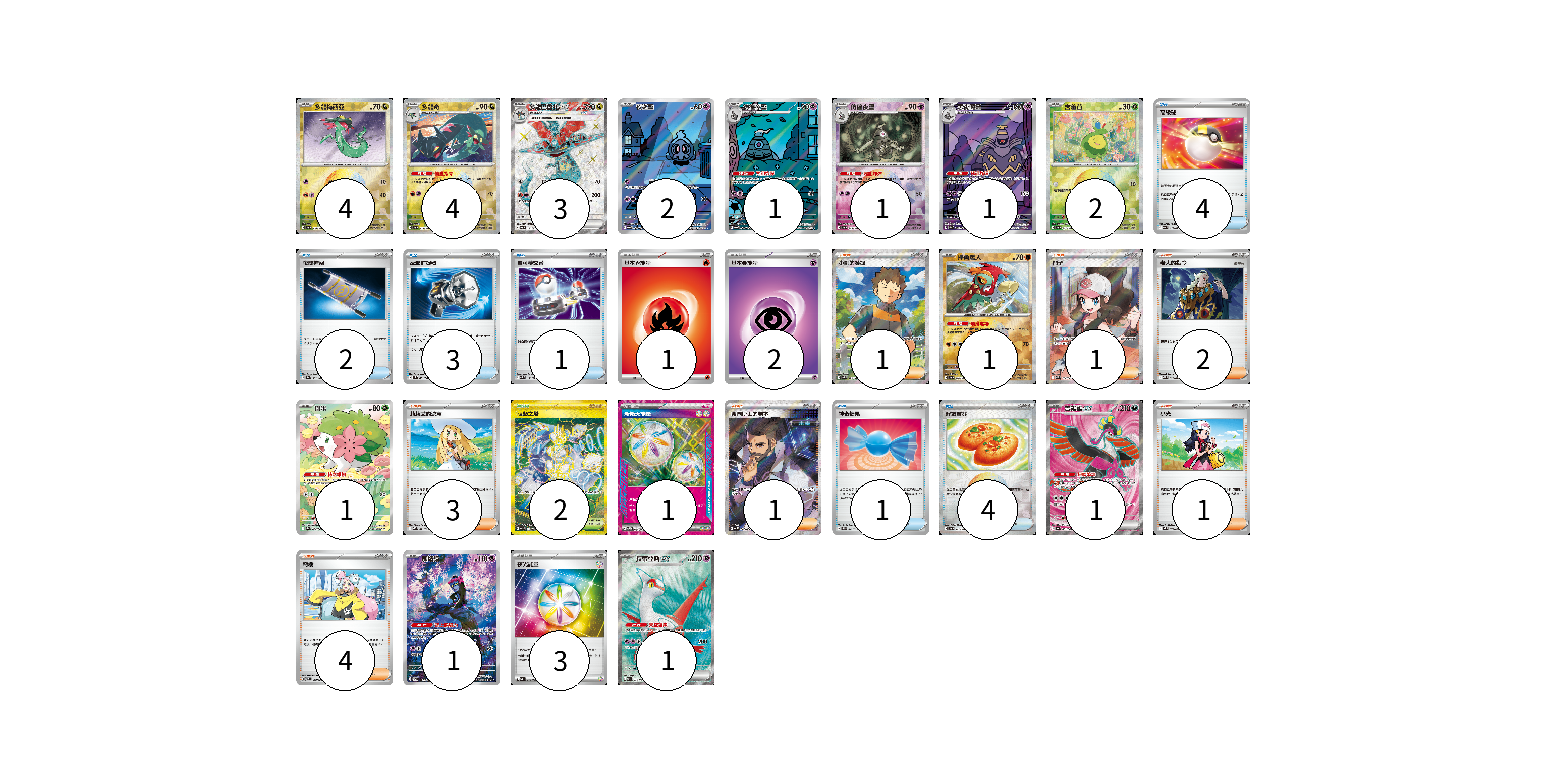 牌組構築方案 以此牌組為基礎新構築牌組 顯示卡面 顯示列表 寶可夢卡(23) 4 4 3 2 1 1 1 2 1 1 1 1 1 物品卡(15) 4 2 3 1 1 4 支援者卡(13) 1 1 2 3 1 1 4 競技場卡(2) 2 能量卡(7) 1 2 1 3 寶可夢卡(23) 卡牌名稱 張數 卡牌名稱 張數 多龍梅西亞 SV8a 118/187 04 多龍奇 SV8a 119/187 04 多龍巴魯托ex SV6 120/101 03 夜巡靈 SV6a 068/064 02 彷徨夜靈 SV6a 069/064 01 彷徨夜靈 SV8a 065/187 01 黑夜魔靈 SV6a 070/064 01 含羞苞 SV8a 001/187 02 摔角鷹人 SV8a 084/187 01 謝米 SV9a 066/063 01 吉雉雞ex SV6a 081/064 01 願增猿 SV6 107/101 01 拉帝亞斯ex SV7a 078/064 01 物品卡(15) 卡牌名稱 張數 卡牌名稱 張數 高級球 SVAL 013/021 04 夜間擔架 SV8a 151/187 02 反擊捕捉器 SV4M 059/066 03 寶可夢交替 SVM 136/175 01 神奇糖果 SVEL 013/020 01 好友寶芬 SV8a 147/187 04 支援者卡(13) 卡牌名稱 張數 卡牌名稱 張數 小剛的發掘 SV9 123/100 01 鬥子 SV11W 166/086 01 老大的指令 MBD 020/022 02 莉莉艾的決意 MBD 021/022 03 弗圖博士的劇本 SV4M 086/066 01 小光 M2 077/080 01 奇樹 SVTS 018/022 04 競技場卡(2) 卡牌名稱 張數 卡牌名稱 張數 阻礙之塔 SV10 132/098 02 能量卡(7) 卡牌名稱 張數 卡牌名稱 張數 基本【火】能量 SVTL FIR 01 基本【超】能量 SVTS PSY 02 新衝天能量 SV5K 071/071 01 夜光能量 SVK 042/042 03 以此牌組為基礎新構築牌組 牌組編碼 SrjxSM-BiyhmQ-sHaKWD copy 列印牌組單 牌組編碼已複製 分享至SNS