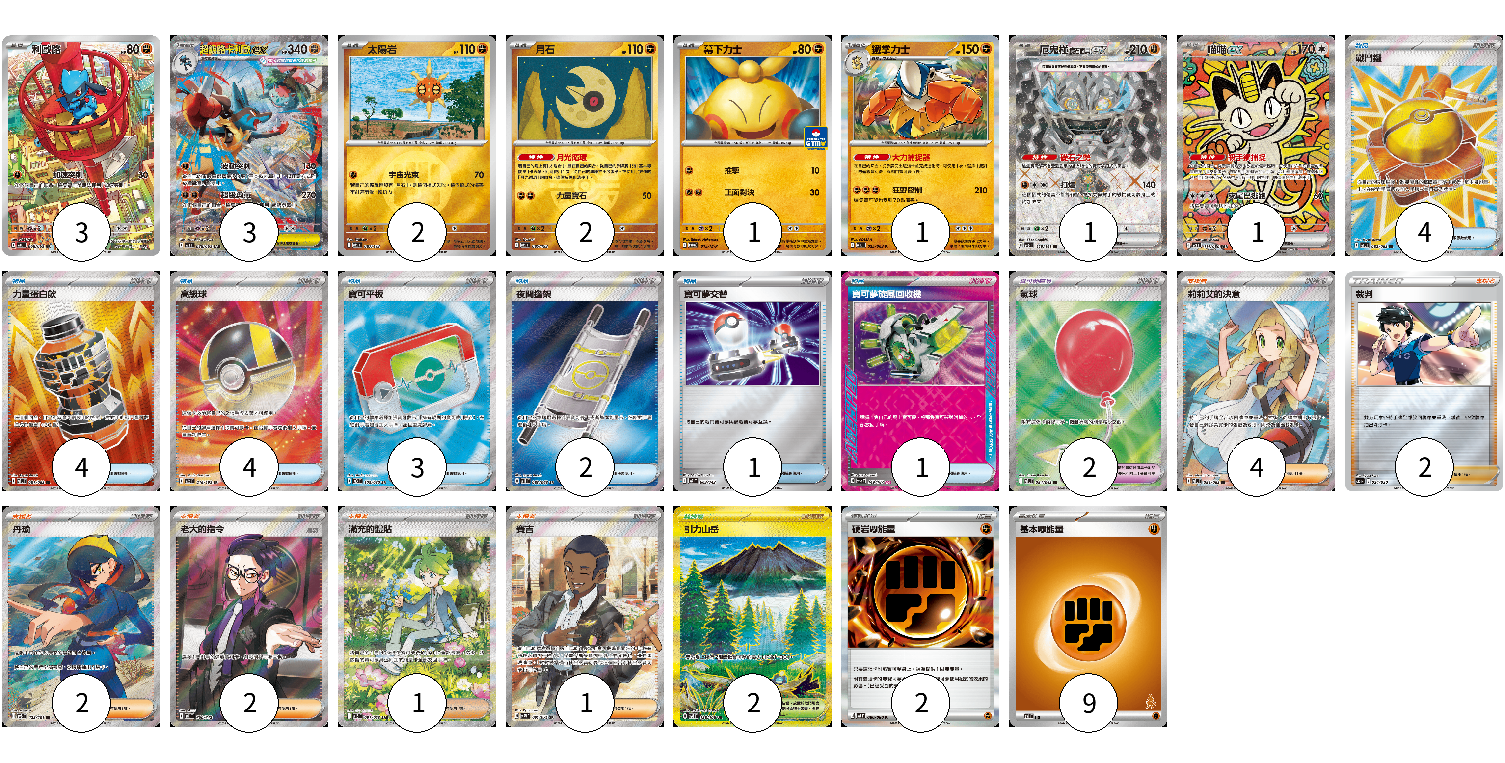 牌組構築方案 以此牌組為基礎新構築牌組 顯示卡面 顯示列表 寶可夢卡(14) 3 3 2 2 1 1 1 1 寶可夢道具(2) 2 物品卡(19) 4 4 4 3 2 1 1 支援者卡(12) 4 2 2 2 1 1 競技場卡(2) 2 能量卡(11) 2 9 寶可夢卡(14) 卡牌名稱 張數 卡牌名稱 張數 利歐路 M1L 068/063 03 超級路卡利歐ex M1L 088/063 03 太陽岩 M2a 087/193 02 月石 M2a 086/193 02 幕下力士 M-P 015/M-P 01 鐵掌力士 M1L 025/063 01 厄鬼椪 礎石面具ex SV6 119/101 01 喵喵ex M3 114/080 01 寶可夢道具(2) 卡牌名稱 張數 卡牌名稱 張數 氣球 M1L 084/063 02 物品卡(19) 卡牌名稱 張數 卡牌名稱 張數 戰鬥鑼 M1L 082/063 04 力量蛋白飲 M1L 081/063 04 高級球 M2a 216/193 04 寶可平板 M3 103/080 03 夜間擔架 M1L 083/063 02 寶可夢交替 MC 663/742 01 寶可夢旋風回收機 SV8a 149/187 01 支援者卡(12) 卡牌名稱 張數 卡牌名稱 張數 莉莉艾的決意 M1L 086/063 04 裁判 SO 024/030 02 丹瑜 SV6 123/101 02 老大的指令(烏羽) MC 760/742 02 滿充的體貼 M1S 091/063 01 賽吉 SV5M 091/071 01 競技場卡(2) 卡牌名稱 張數 卡牌名稱 張數 引力山岳 SV8 138/106 02 能量卡(11) 卡牌名稱 張數 卡牌名稱 張數 硬岩【鬥】能量 M3 080/080 02 基本【鬥】能量 SVI FIG 09 以此牌組為基礎新構築牌組 牌組編碼 SrxtbH-OpPUUA-tUsPbK copy 列印牌組單 牌組編碼已複製 分享至SNS