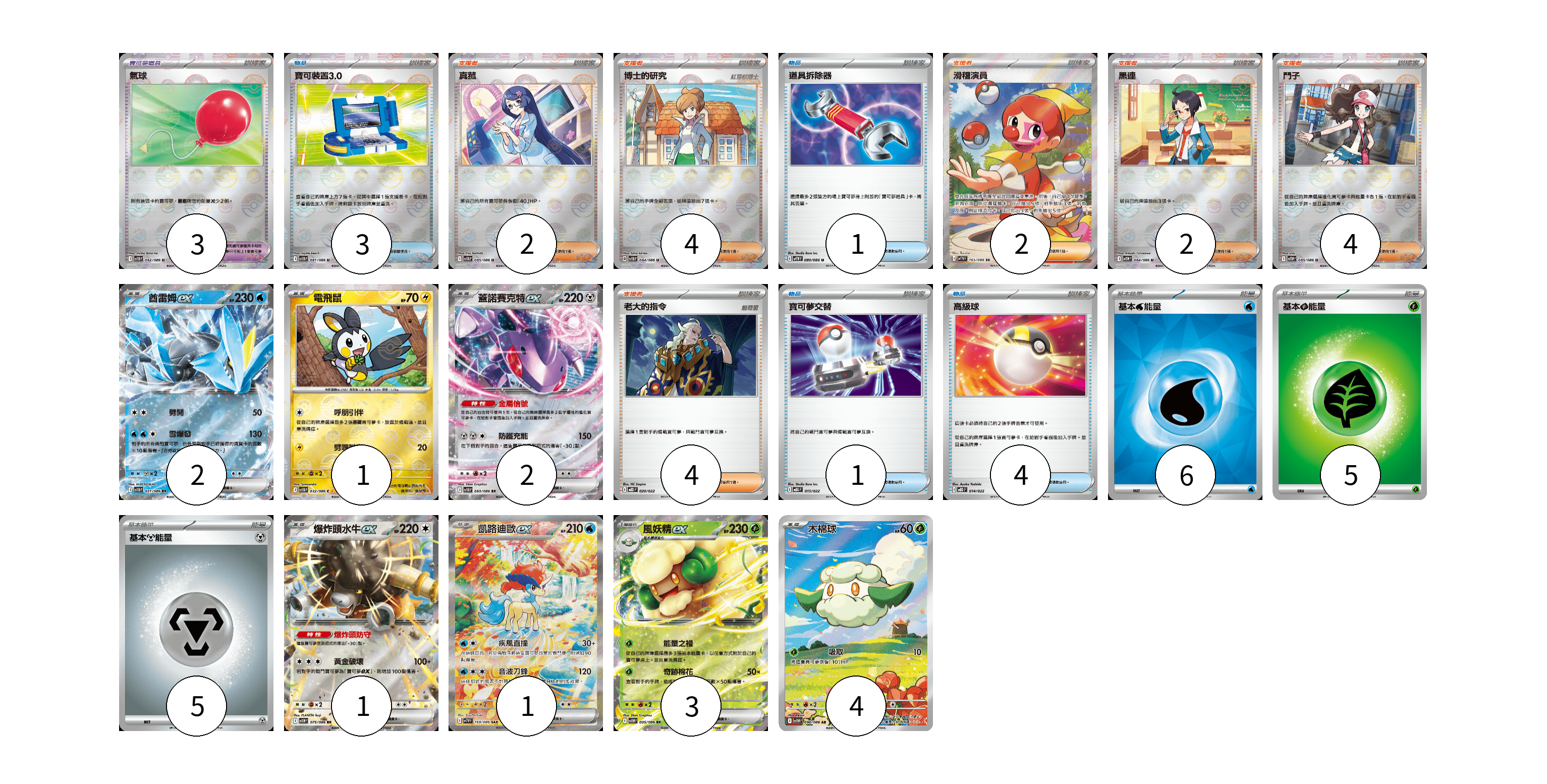 牌組構築方案 以此牌組為基礎新構築牌組 顯示卡面 顯示列表 寶可夢卡(14) 2 1 2 1 1 3 4 寶可夢道具(3) 3 物品卡(9) 3 1 1 4 支援者卡(18) 2 4 2 2 4 4 能量卡(16) 6 5 5 寶可夢卡(14) 卡牌名稱 張數 卡牌名稱 張數 酋雷姆ex SV11B 031/086 02 電飛鼠 SV11B 032/086 01 蓋諾賽克特ex SV11B 069/086 02 爆炸頭水牛ex SV11W 075/086 01 凱路迪歐ex SV11W 169/086 01 風妖精ex SV11W 005/086 03 木棉球 SV11W 090/086 04 寶可夢道具(3) 卡牌名稱 張數 卡牌名稱 張數 氣球 SV11B 082/086 03 物品卡(9) 卡牌名稱 張數 卡牌名稱 張數 寶可裝置3.0 SV11B 081/086 03 道具拆除器 SV11W 080/086 01 寶可夢交替 MBG 015/022 01 高級球 MBD 014/022 04 支援者卡(18) 卡牌名稱 張數 卡牌名稱 張數 真菰 SV11B 085/086 02 博士的研究 SV11B 084/086 04 滑稽演員 SV11W 165/086 02 黑連 SV11W 084/086 02 鬥子 SV11W 085/086 04 老大的指令 MBD 020/022 04 能量卡(16) 卡牌名稱 張數 卡牌名稱 張數 基本【水】能量 SVM WAT 06 基本【草】能量 M-P GRA 05 基本【鋼】能量 M-P MET 05 以此牌組為基礎新構築牌組 牌組編碼 StgtSP-HGKDlT-mUqMtg copy 列印牌組單 牌組編碼已複製 分享至SNS