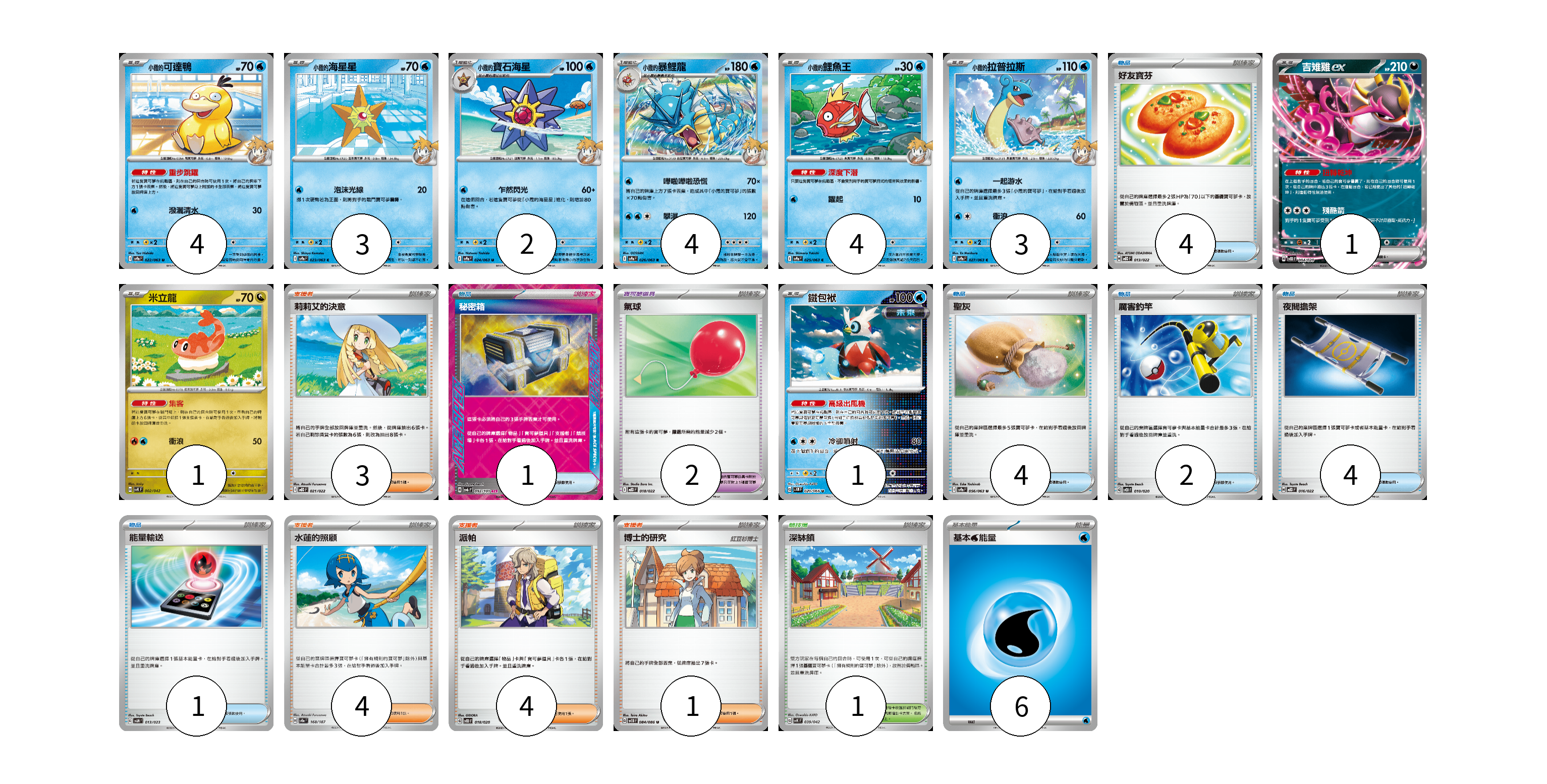 牌組構築方案 以此牌組為基礎新構築牌組 顯示卡面 顯示列表 寶可夢卡(23) 4 3 2 4 4 3 1 1 1 寶可夢道具(2) 2 物品卡(16) 4 1 4 2 4 1 支援者卡(12) 3 4 4 1 競技場卡(1) 1 能量卡(6) 6 寶可夢卡(23) 卡牌名稱 張數 卡牌名稱 張數 <小霞的>可達鴨 SV9a 022/063 04 <小霞的>海星星 SV9a 023/063 03 <小霞的>寶石海星 SV9a 024/063 02 <小霞的>暴鯉龍 SV9a 026/063 04 <小霞的>鯉魚王 SV9a 025/063 04 <小霞的>拉普拉斯 SV9a 027/063 03 吉雉雞ex SVOD 004/020 01 米立龍 SVK 002/042 01 鐵包袱 SV4M 020/066 01 寶可夢道具(2) 卡牌名稱 張數 卡牌名稱 張數 氣球 MBD 018/022 02 物品卡(16) 卡牌名稱 張數 卡牌名稱 張數 好友寶芬 MBD 013/022 04 秘密箱 SV6 092/101 01 聖灰 SV9a 056/063 04 厲害釣竿 SVOD 010/020 02 夜間擔架 MBD 016/022 04 能量輸送 SVAM 013/023 01 支援者卡(12) 卡牌名稱 張數 卡牌名稱 張數 莉莉艾的決意 MBD 021/022 03 水蓮的照顧 SV8a 168/187 04 派帕 SVOD 018/020 04 博士的研究 SV11B 084/086 01 競技場卡(1) 卡牌名稱 張數 卡牌名稱 張數 深缽鎮 SVK 039/042 01 能量卡(6) 卡牌名稱 張數 卡牌名稱 張數 基本水能量 sv-p WAT 06 以此牌組為基礎新構築牌組 牌組編碼 SwFYvX-agYpys-jQsUba copy 列印牌組單 牌組編碼已複製 分享至SNS