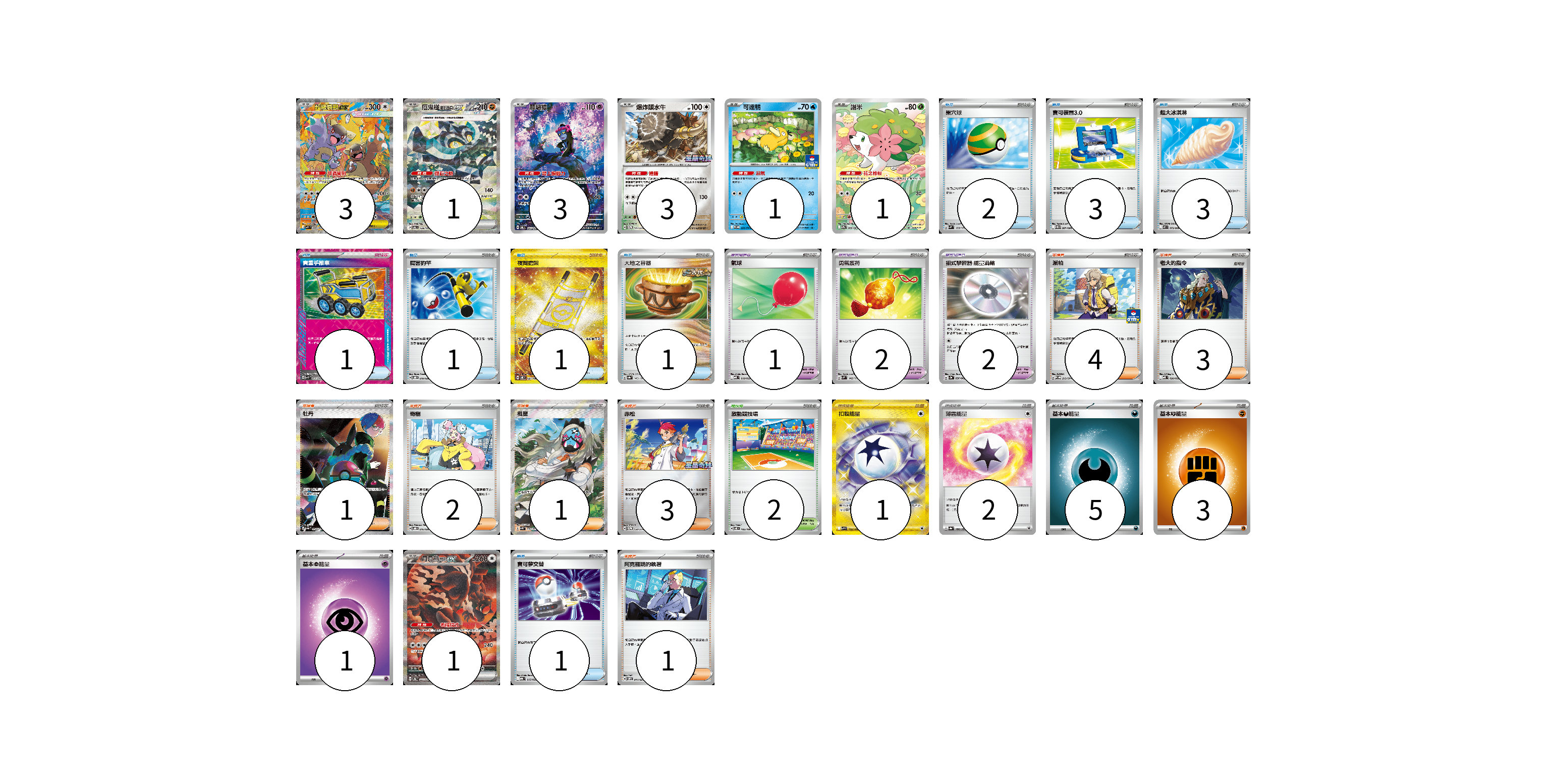牌組構築方案 以此牌組為基礎新構築牌組 顯示卡面 顯示列表 寶可夢卡(13) 3 1 3 3 1 1 1 寶可夢道具(5) 1 2 2 物品卡(13) 2 3 3 1 1 1 1 1 支援者卡(15) 4 3 1 2 1 3 1 競技場卡(2) 2 能量卡(12) 1 2 5 3 1 寶可夢卡(13) 卡牌名稱 張數 卡牌名稱 張數 超級袋獸ex M1S 089/063 03 厄鬼椪 礎石面具ex SV6 128/101 01 願增猿 SV6 107/101 03 爆炸頭水牛 SV-P 147/SV-P 03 可達鴨 SV-P 220/SV-P 01 謝米 SV9a 066/063 01 月月熊 赫月ex SV8a 225/187 01 寶可夢道具(5) 卡牌名稱 張數 卡牌名稱 張數 氣球 MBD 018/022 01 勇氣護符 SVM 142/175 02 招式學習器 能量渦輪 SV3a 056/062 02 物品卡(13) 卡牌名稱 張數 卡牌名稱 張數 巢穴球 SVM 133/175 02 寶可裝置3.0 SV11B 081/086 03 超大冰淇淋 M2 073/080 03 貴重手推車 SVK 020/042 01 厲害釣竿 SVOD 010/020 01 夜間擔架 SV8 137/106 01 大地之容器 SV8a 143/187 01 寶可夢交替 MBG 015/022 01 支援者卡(15) 卡牌名稱 張數 卡牌名稱 張數 派帕 SV-P 213/SV-P 04 老大的指令 MBD 020/022 03 牡丹 SV4a 354/190 01 奇樹 SVOD 016/020 02 枇琶 SV5K 091/071 01 赤松 SV-P 150/SV-P 03 阿克羅瑪的執著 SVOM 017/021 01 競技場卡(2) 卡牌名稱 張數 卡牌名稱 張數 激動競技場 SV8 105/106 02 能量卡(12) 卡牌名稱 張數 卡牌名稱 張數 扣殺能量 SV9 132/100 01 薄霧能量 SV8a 186/187 02 基本【惡】能量 MBG DAR 05 基本【鬥】能量 M-P FIG 03 基本【超】能量 MBD PSY 01 以此牌組為基礎新構築牌組 牌組編碼 SwcoUm-bgwjwl-XEKCIg copy 列印牌組單 牌組編碼已複製 分享至SNS